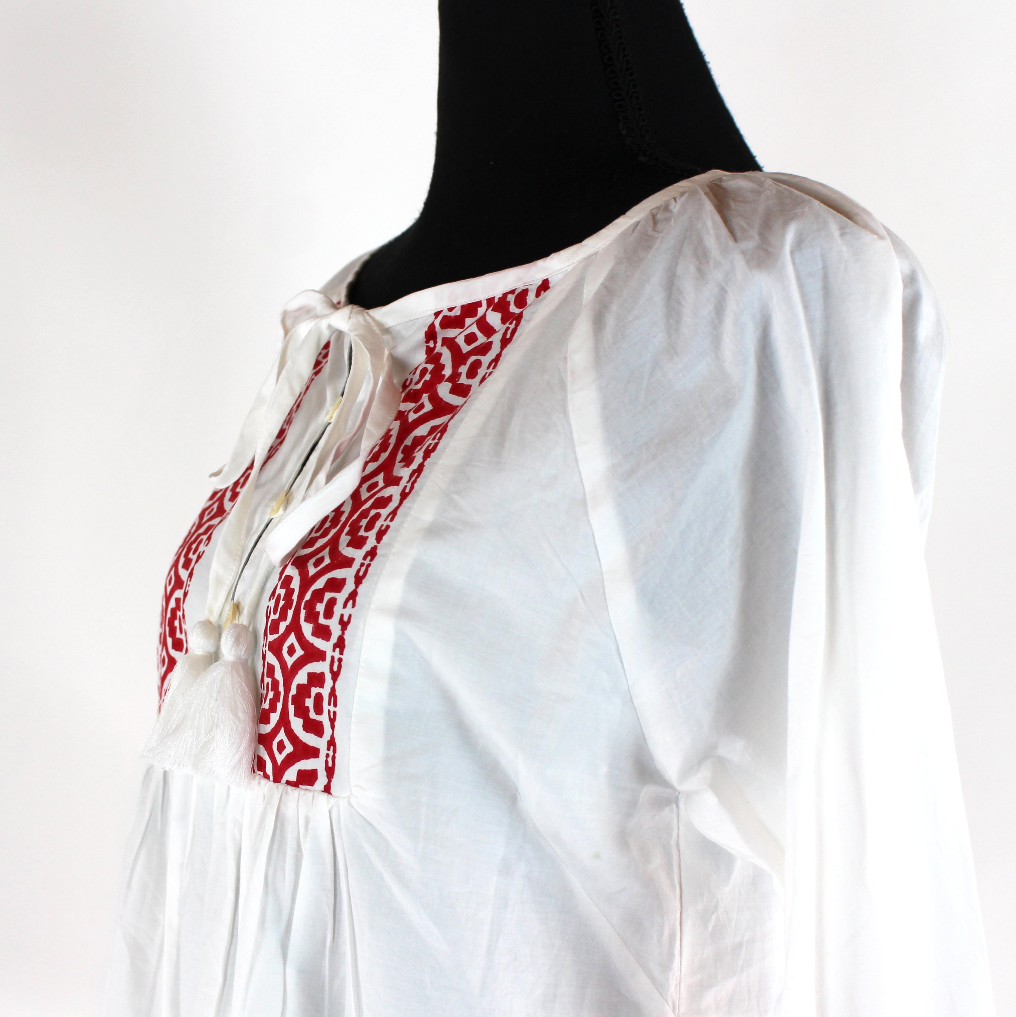 - Button placket with tie neckline