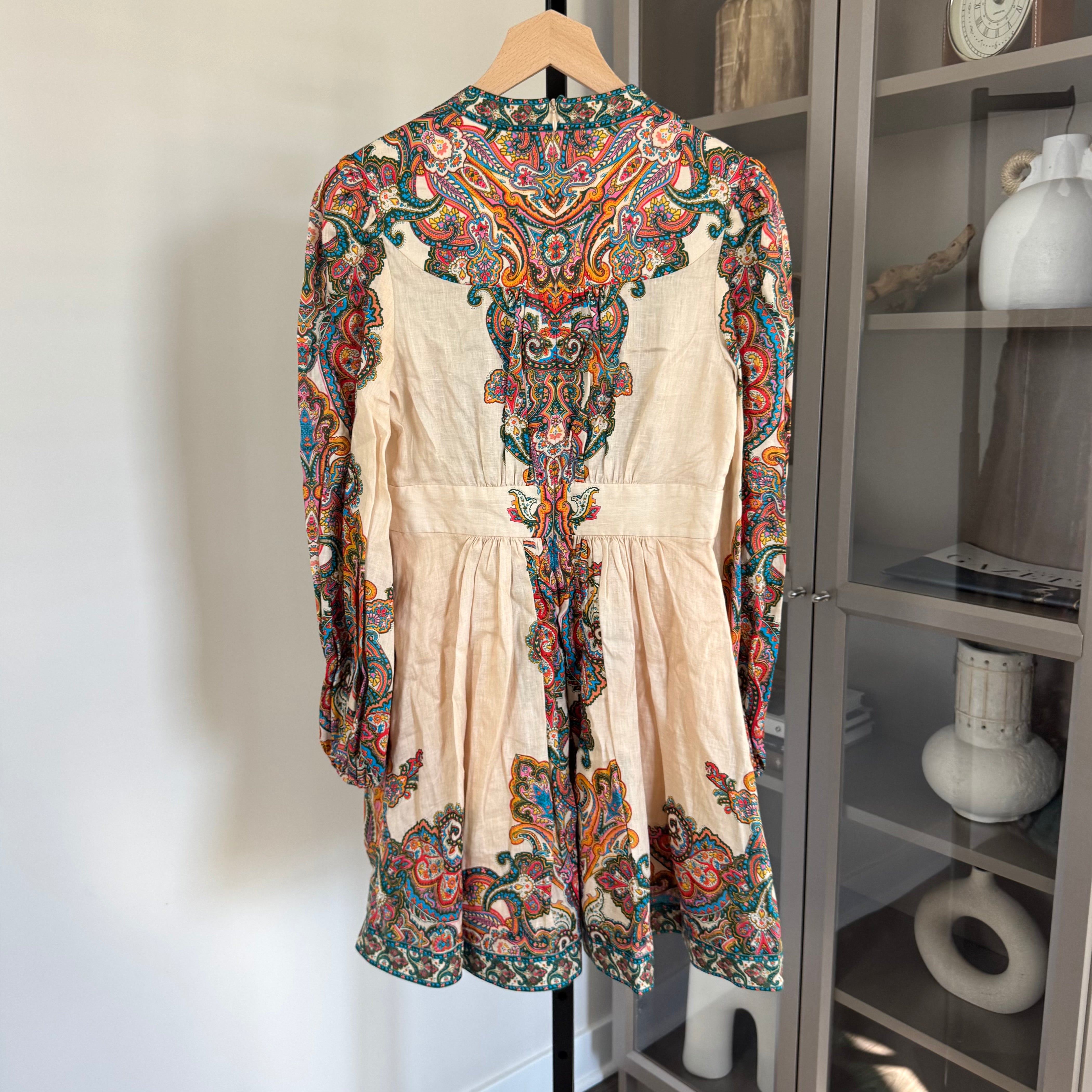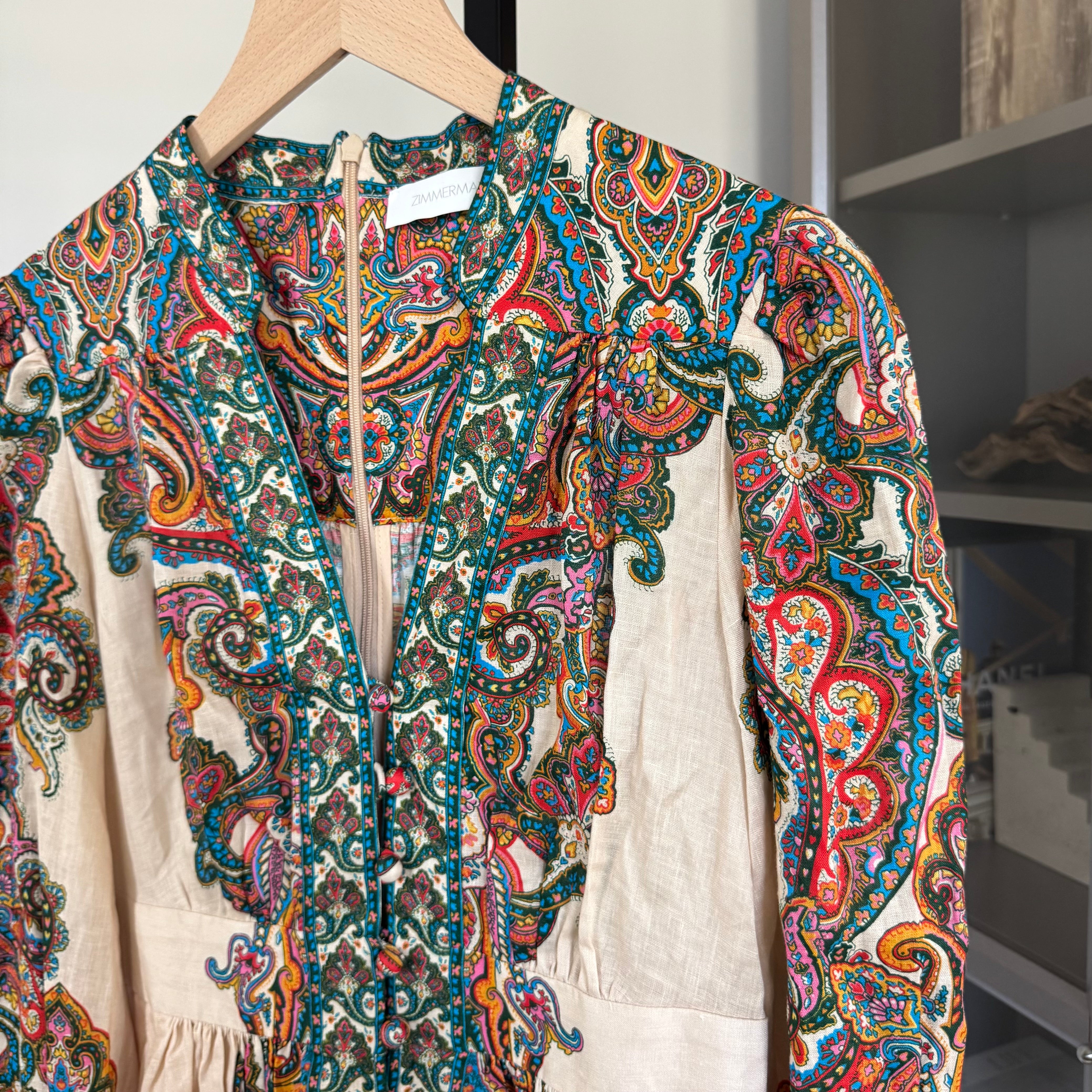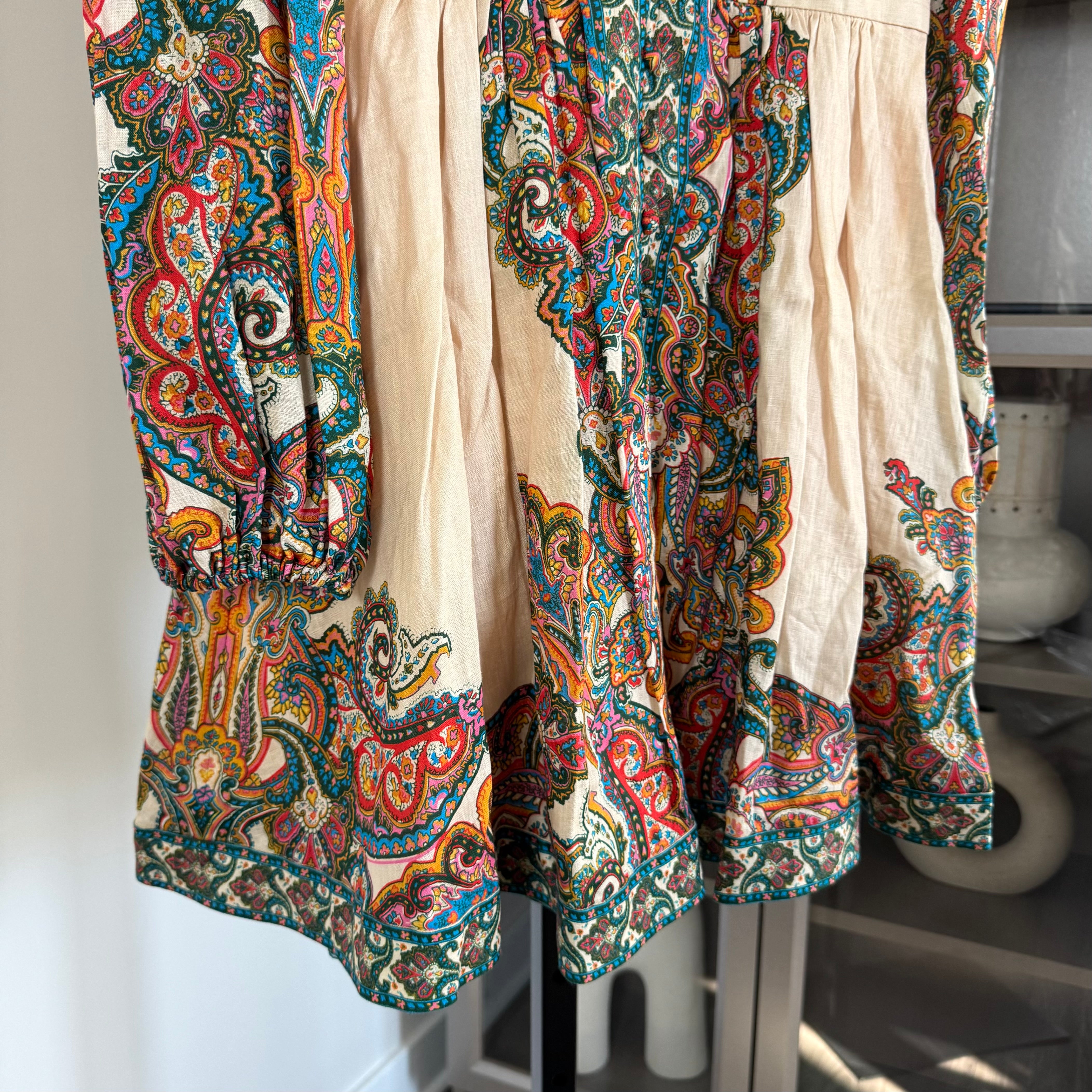 Zimmermann Paisley Linen Ottie Plunge Long Sleeve Mini Dress