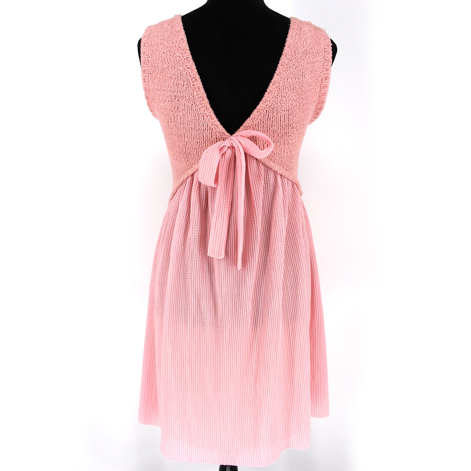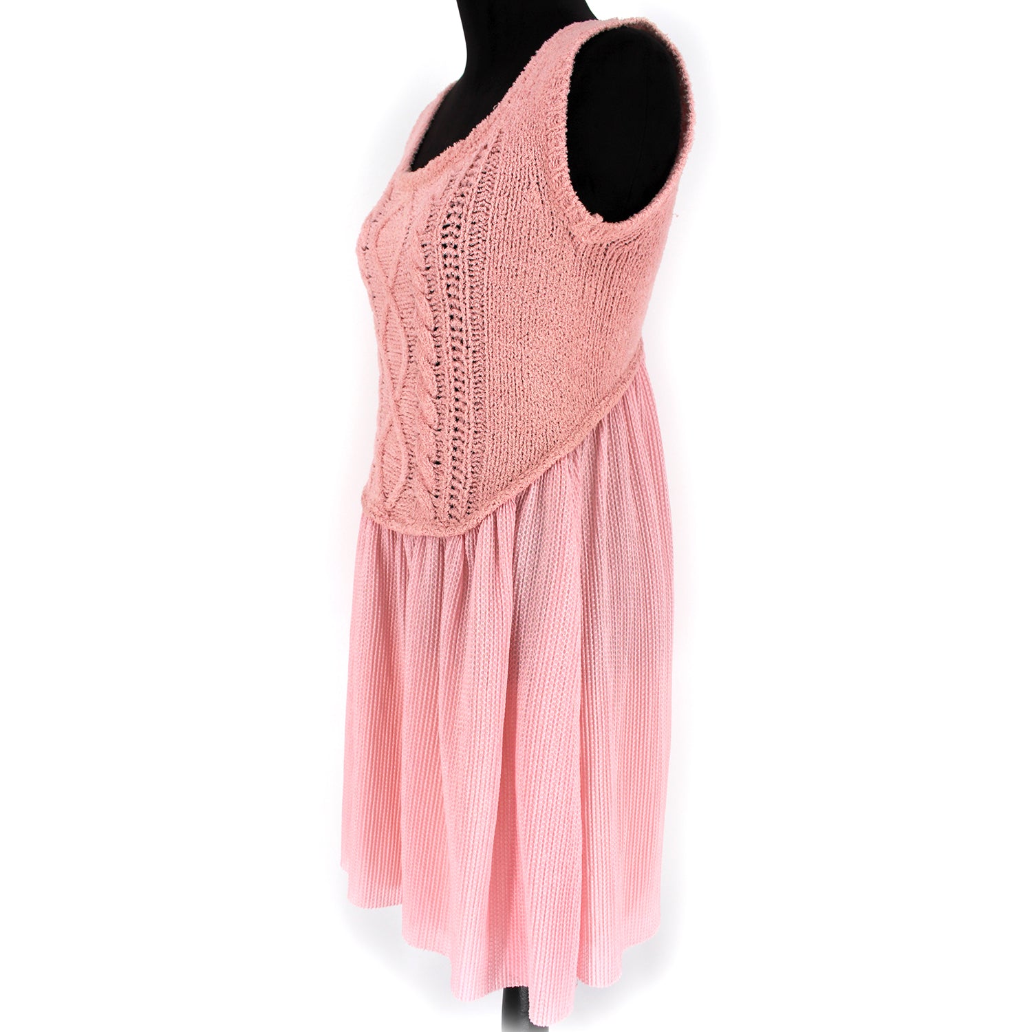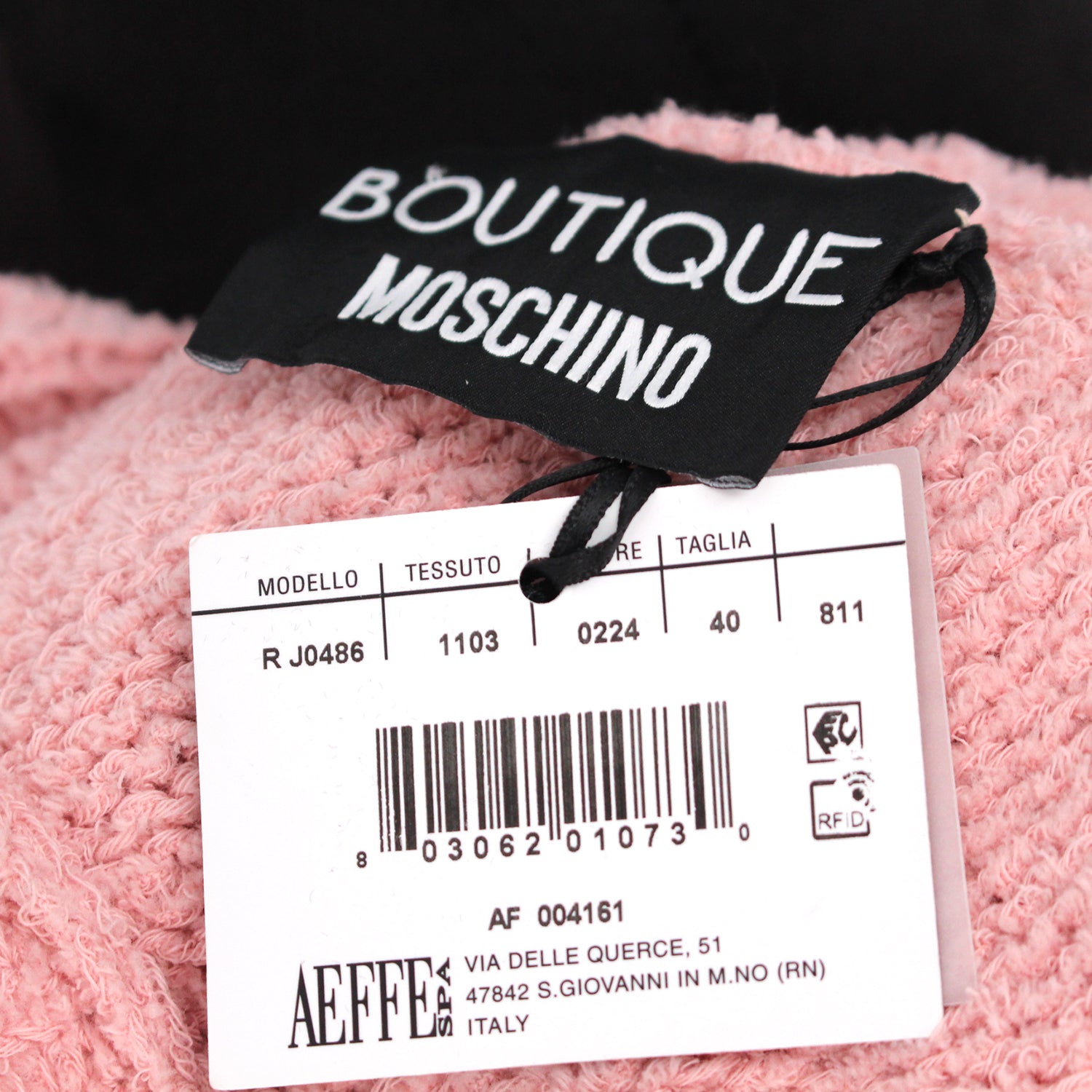 The cutest pink knit dress from Boutique Moschino. This designer piece starts with a knit top and finishes with a waffle knit skirt. Pairs perfectly with your favorite heart locket necklace.