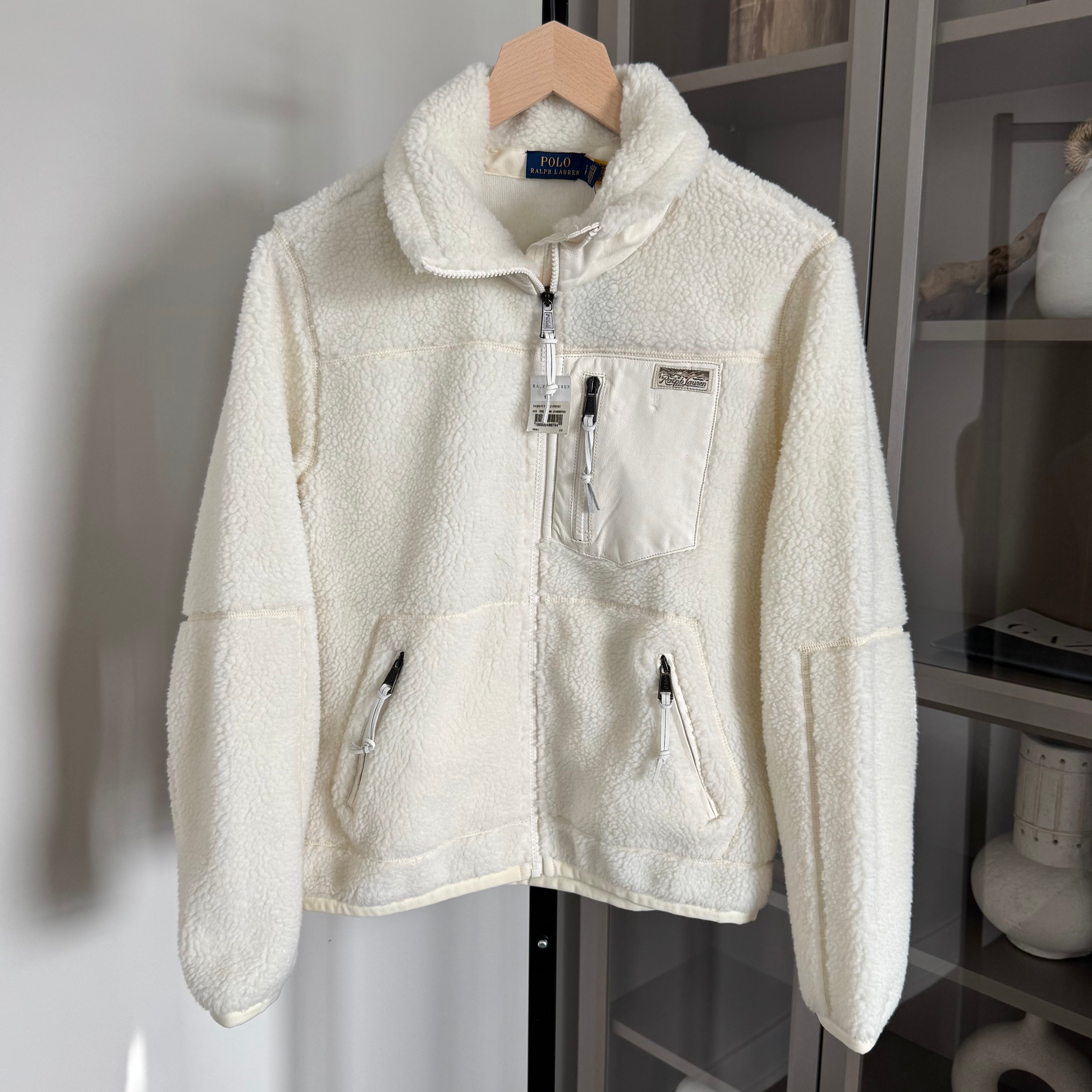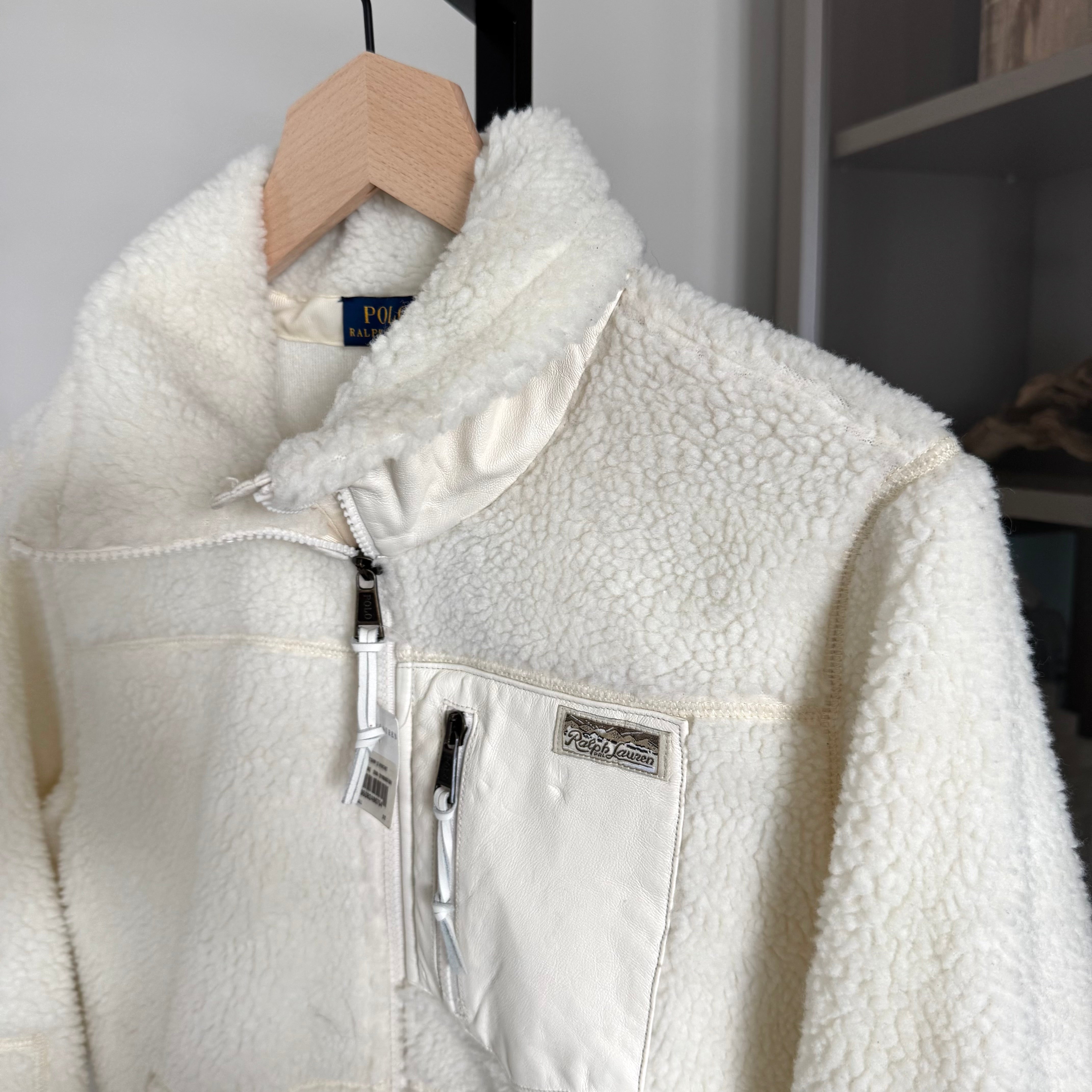 Polo Ralph Lauren Clubhouse Cream White Sherpa Leather Patch Full Zip Jacket