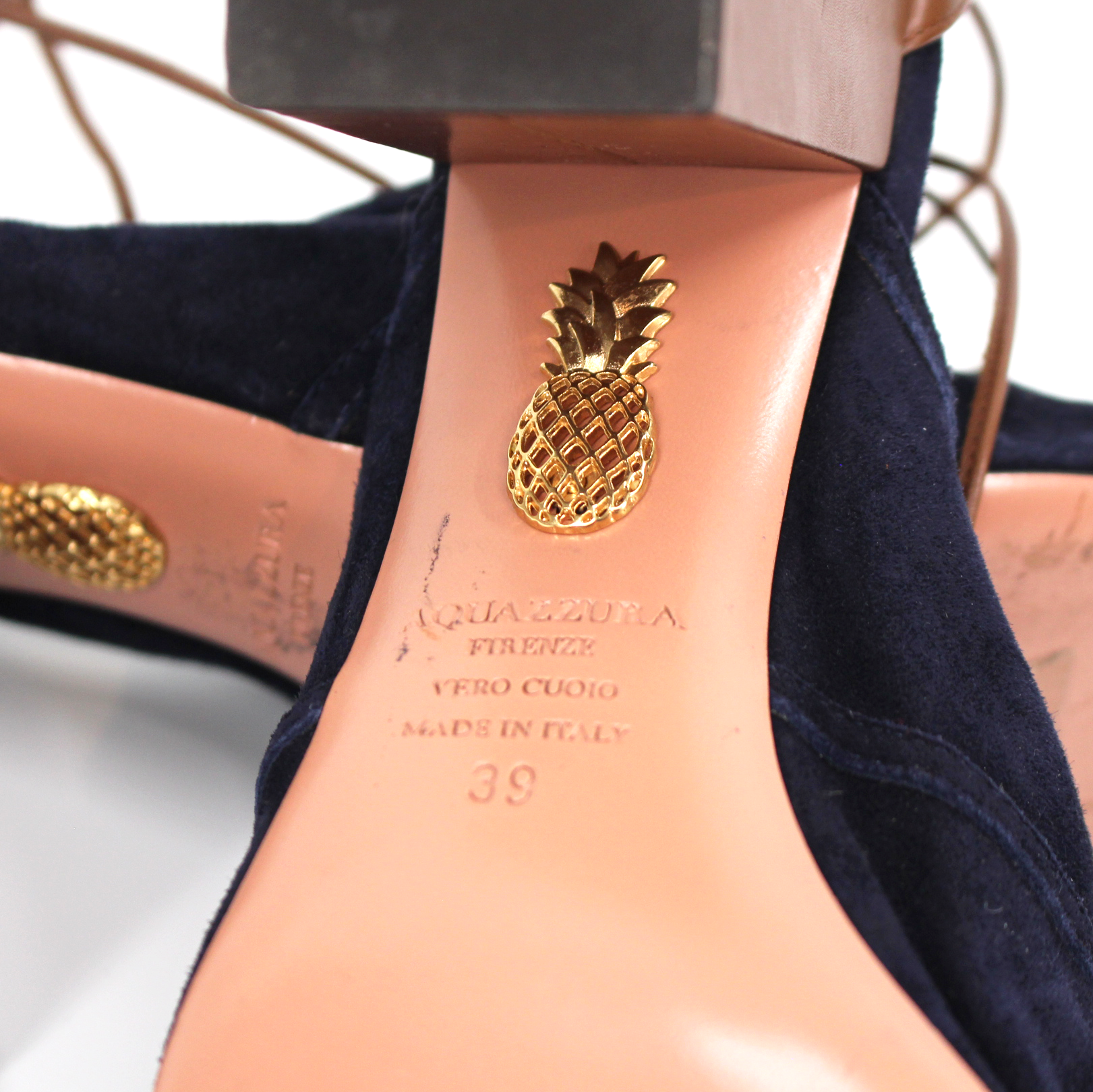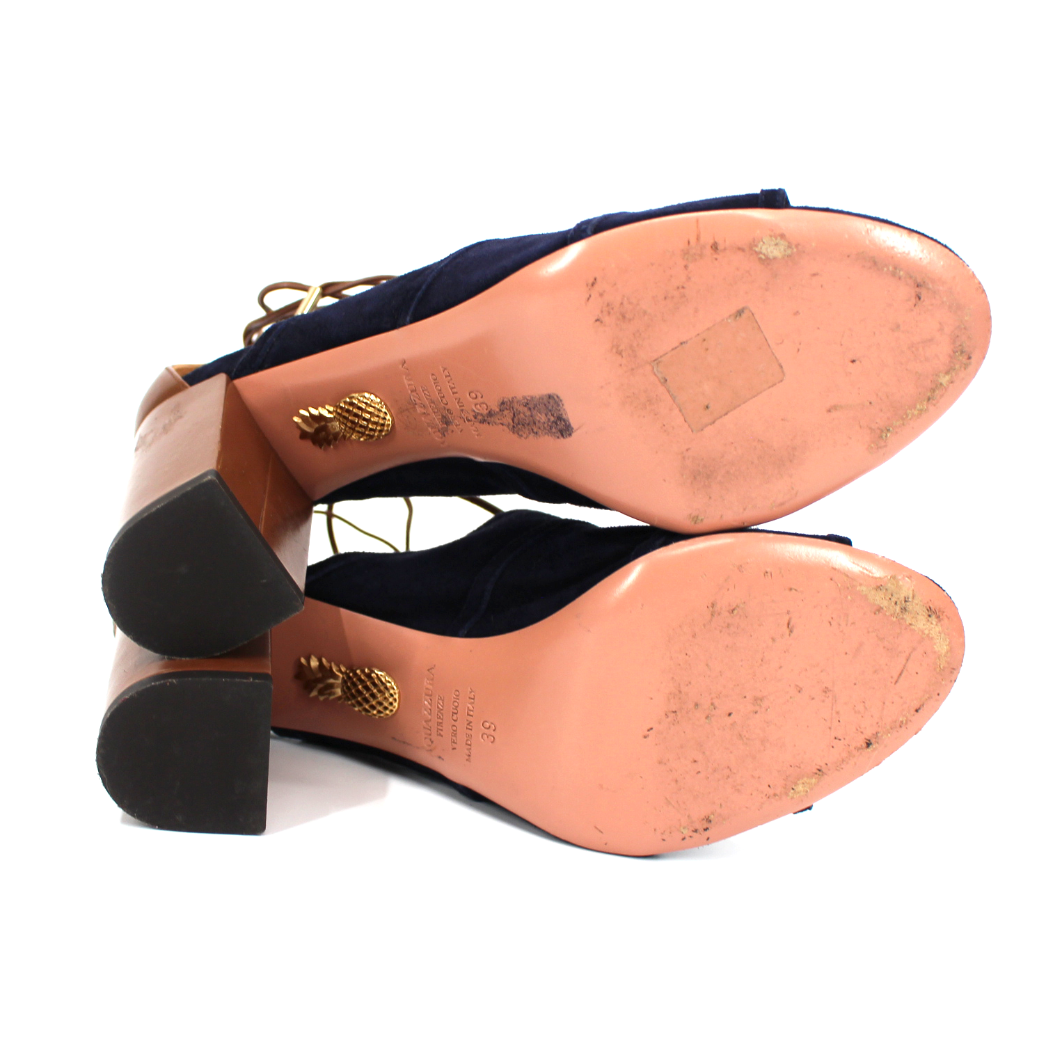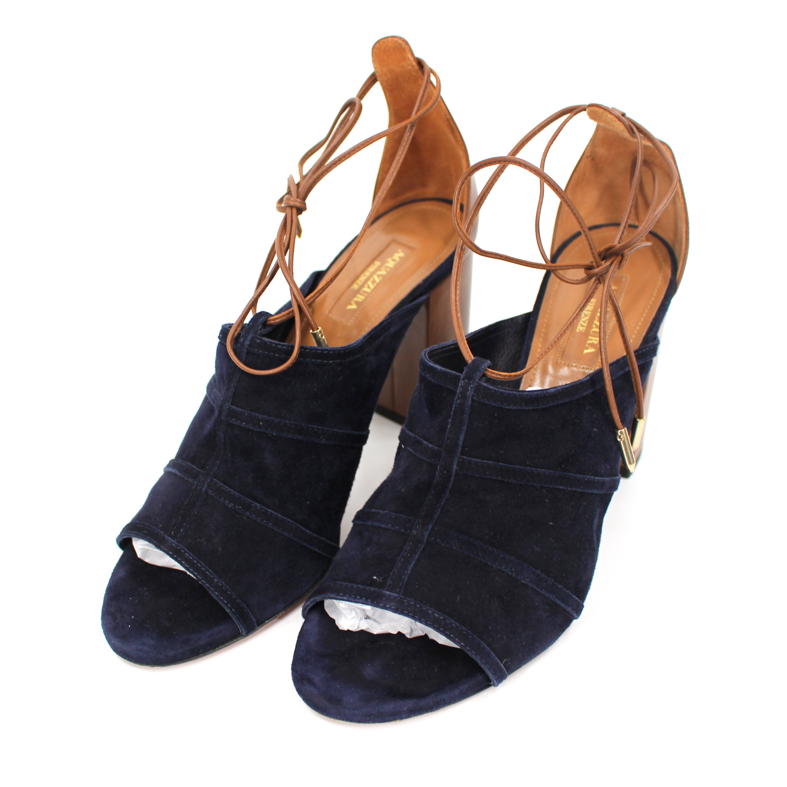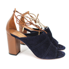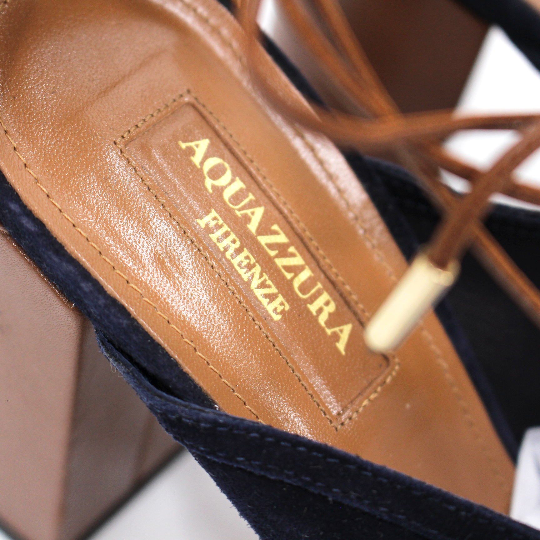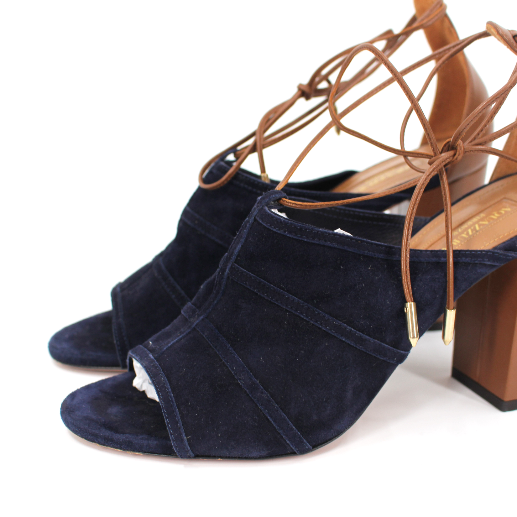 Aquazzura Firenze Navy Blue Suede Peep Toe Leather Ankle Tie Heeled Sandal