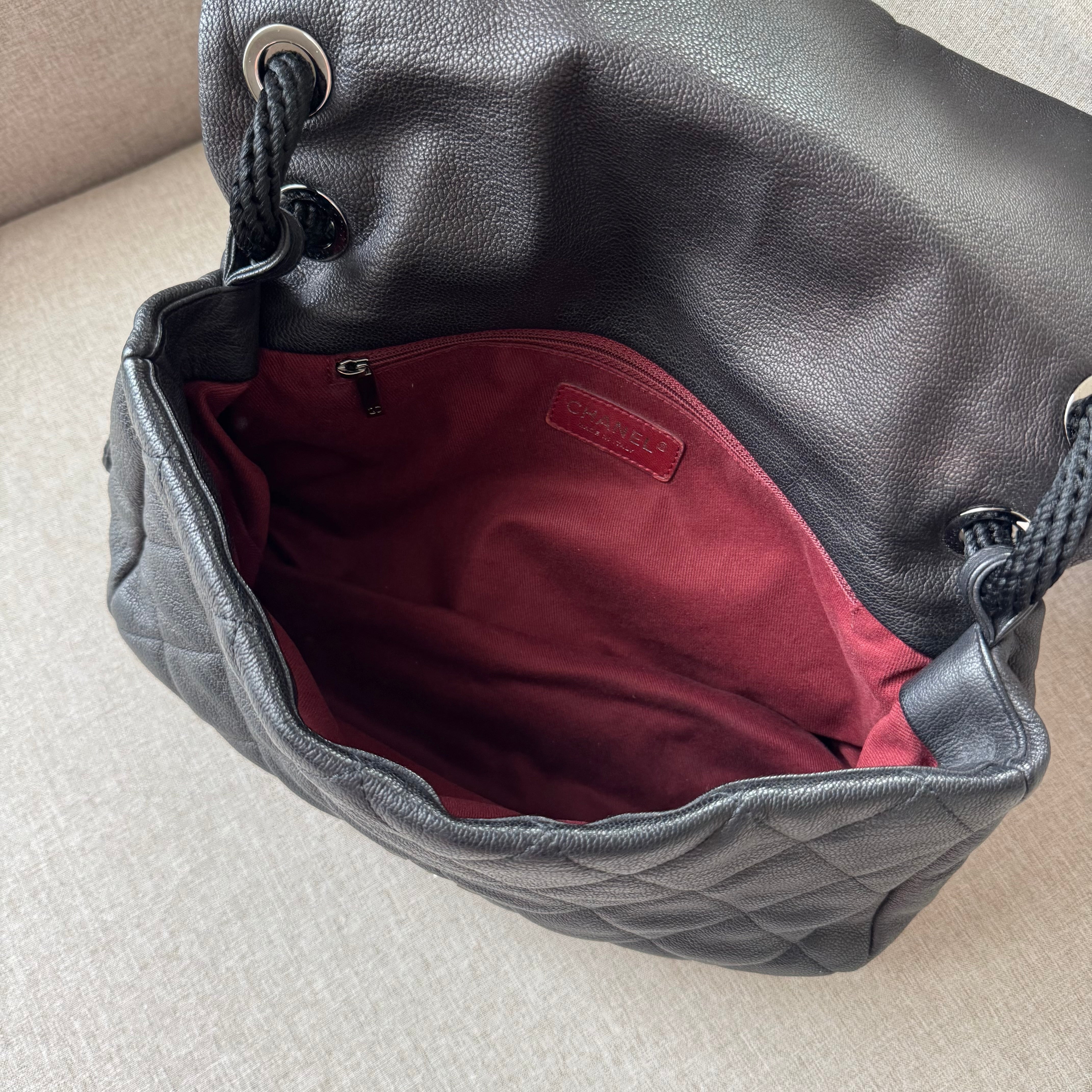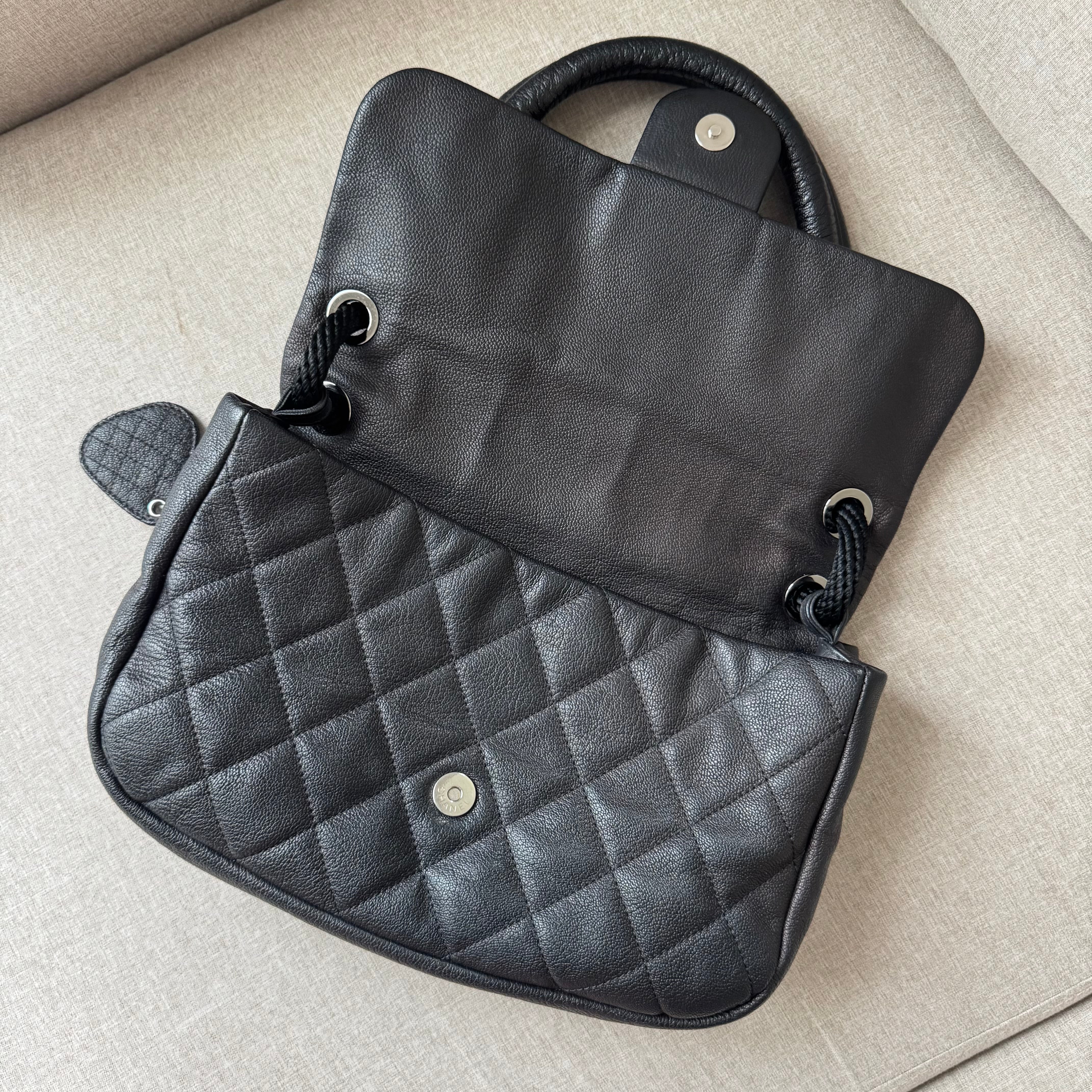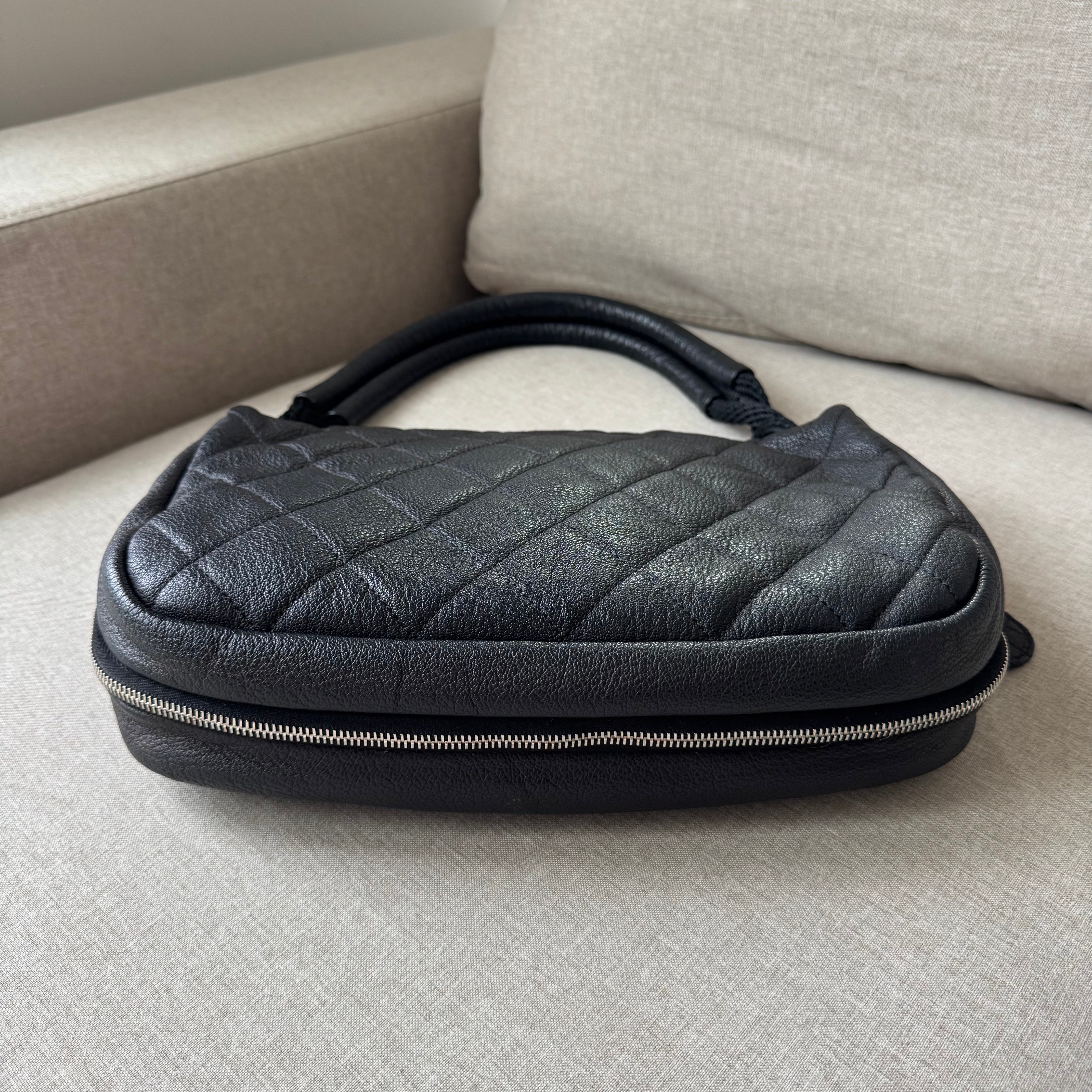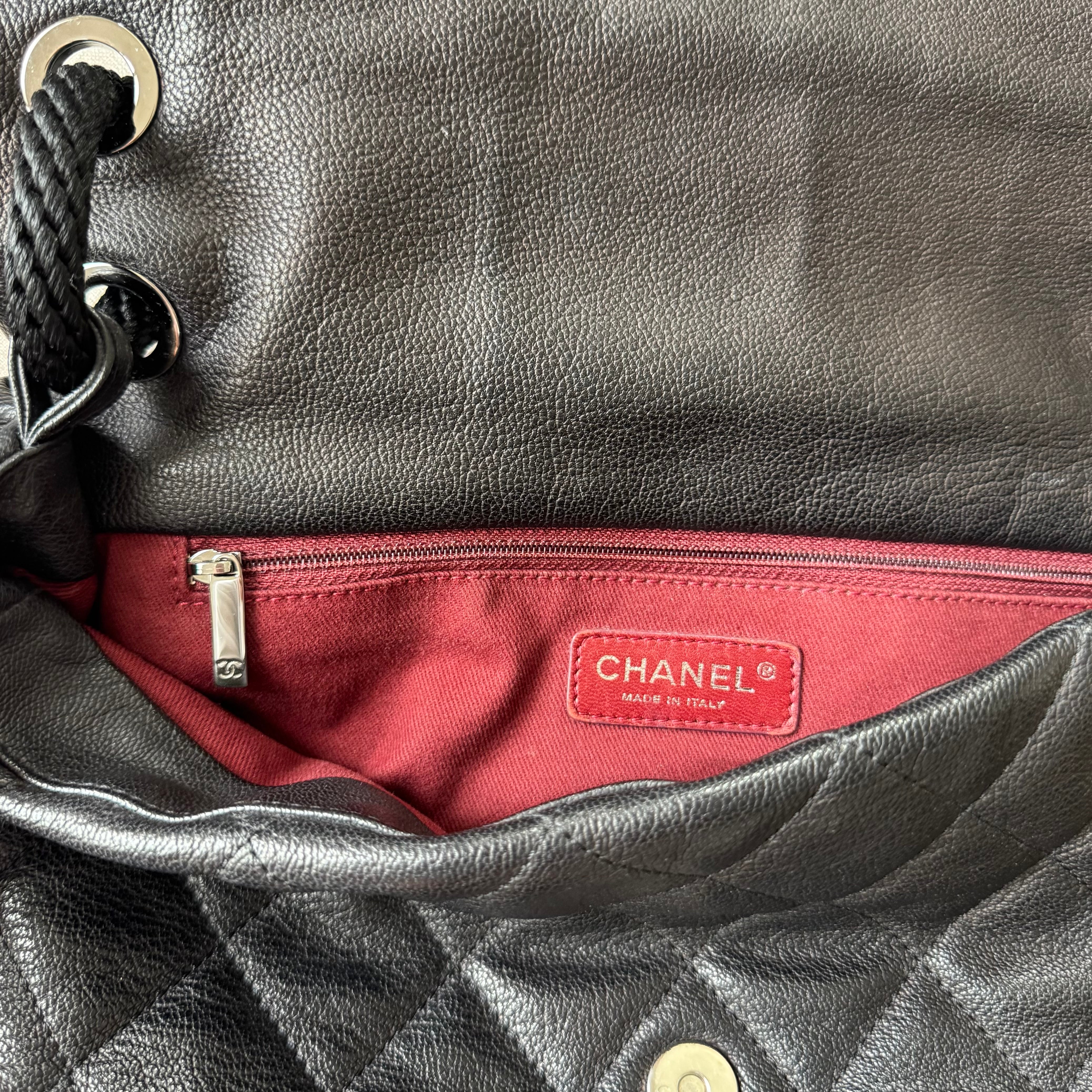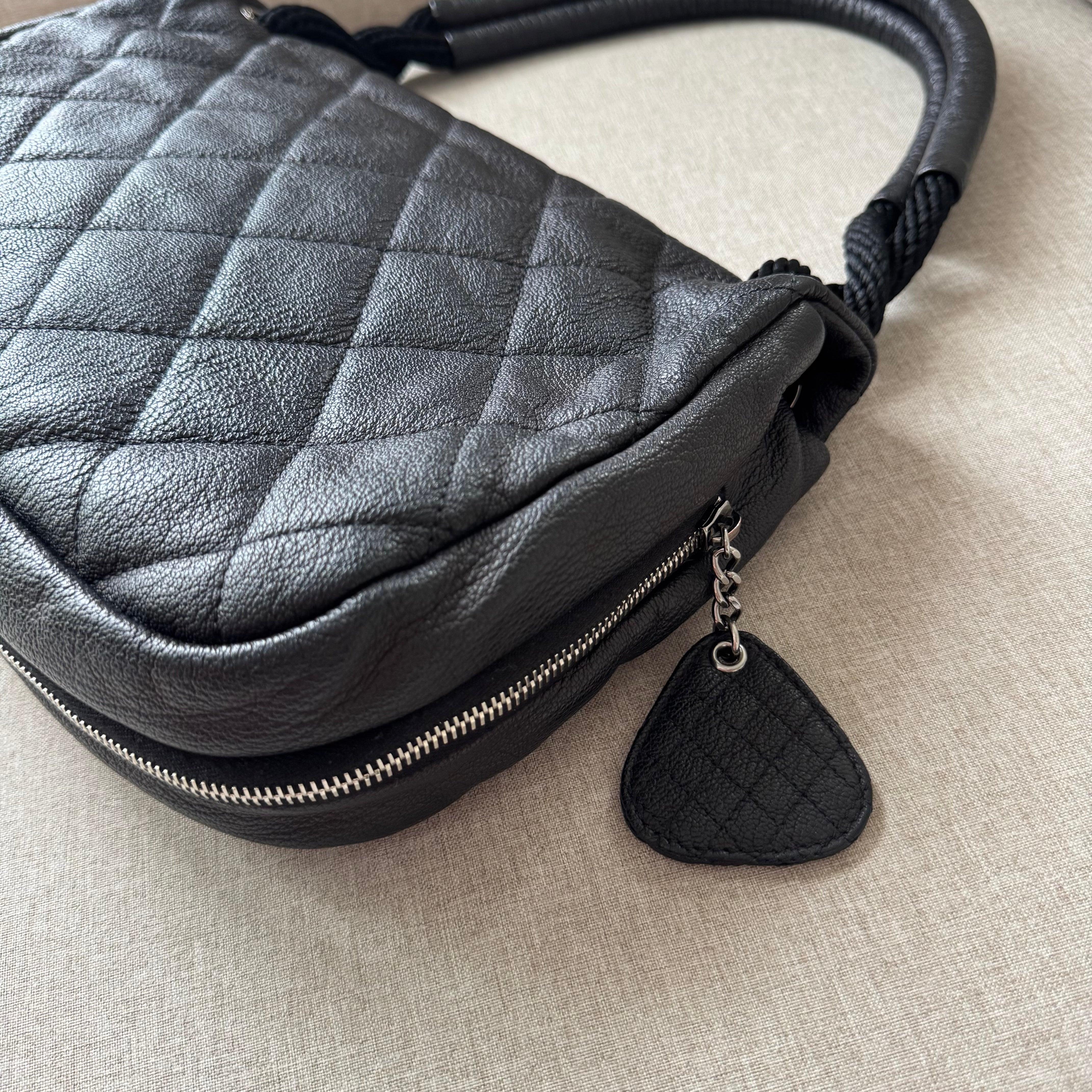 Chanel Black Diamond Quilted Expandable Zipper Bottom Rope Leather Handbag