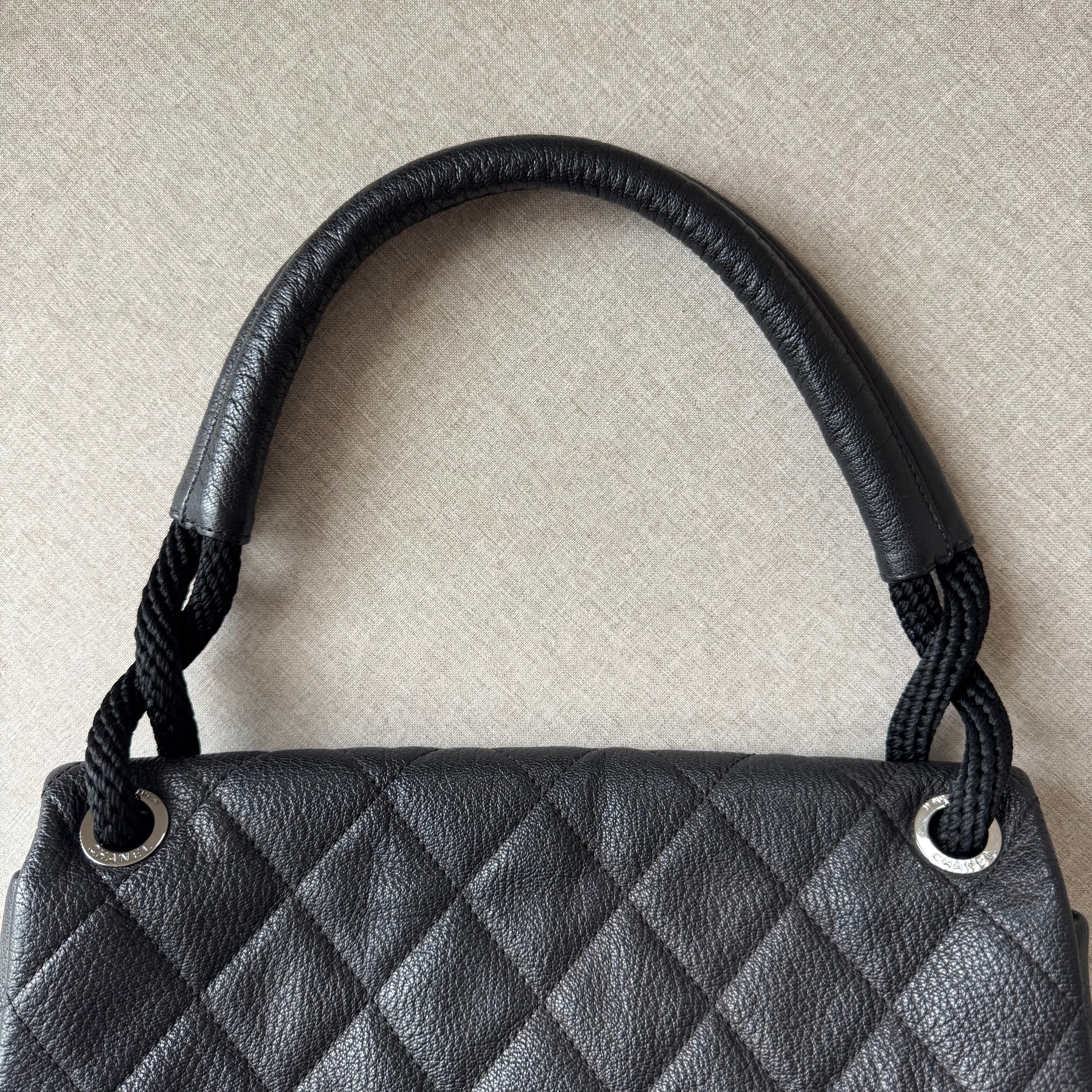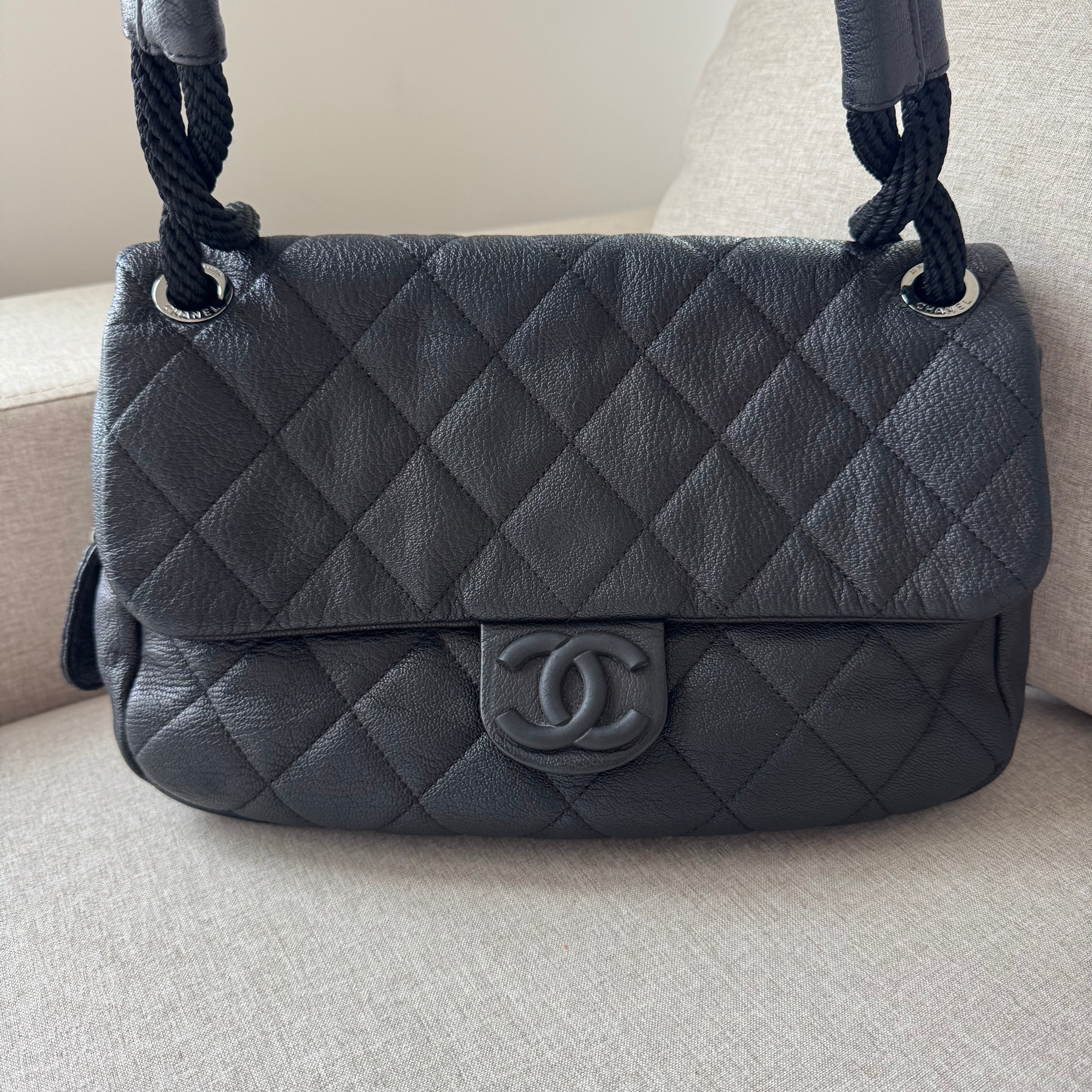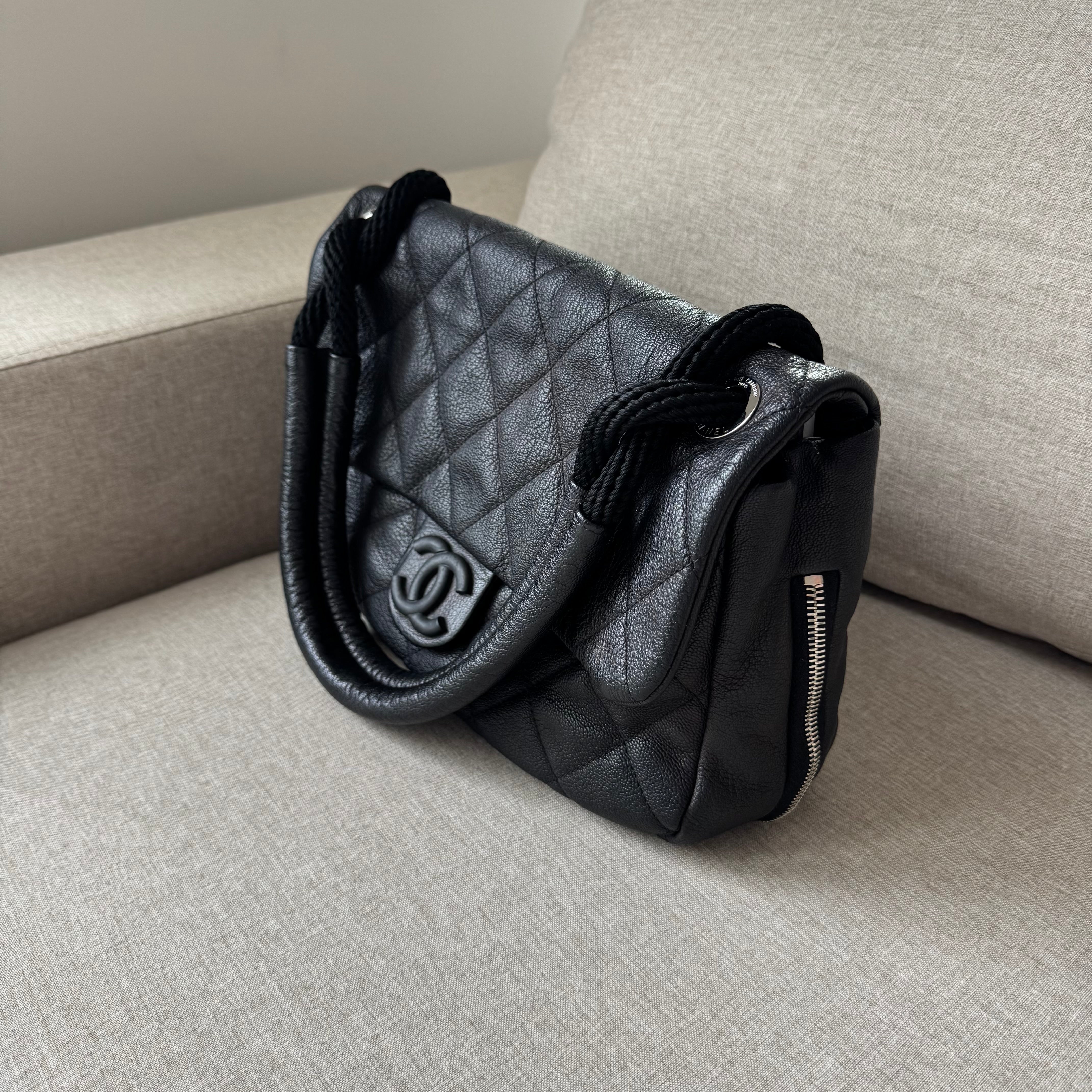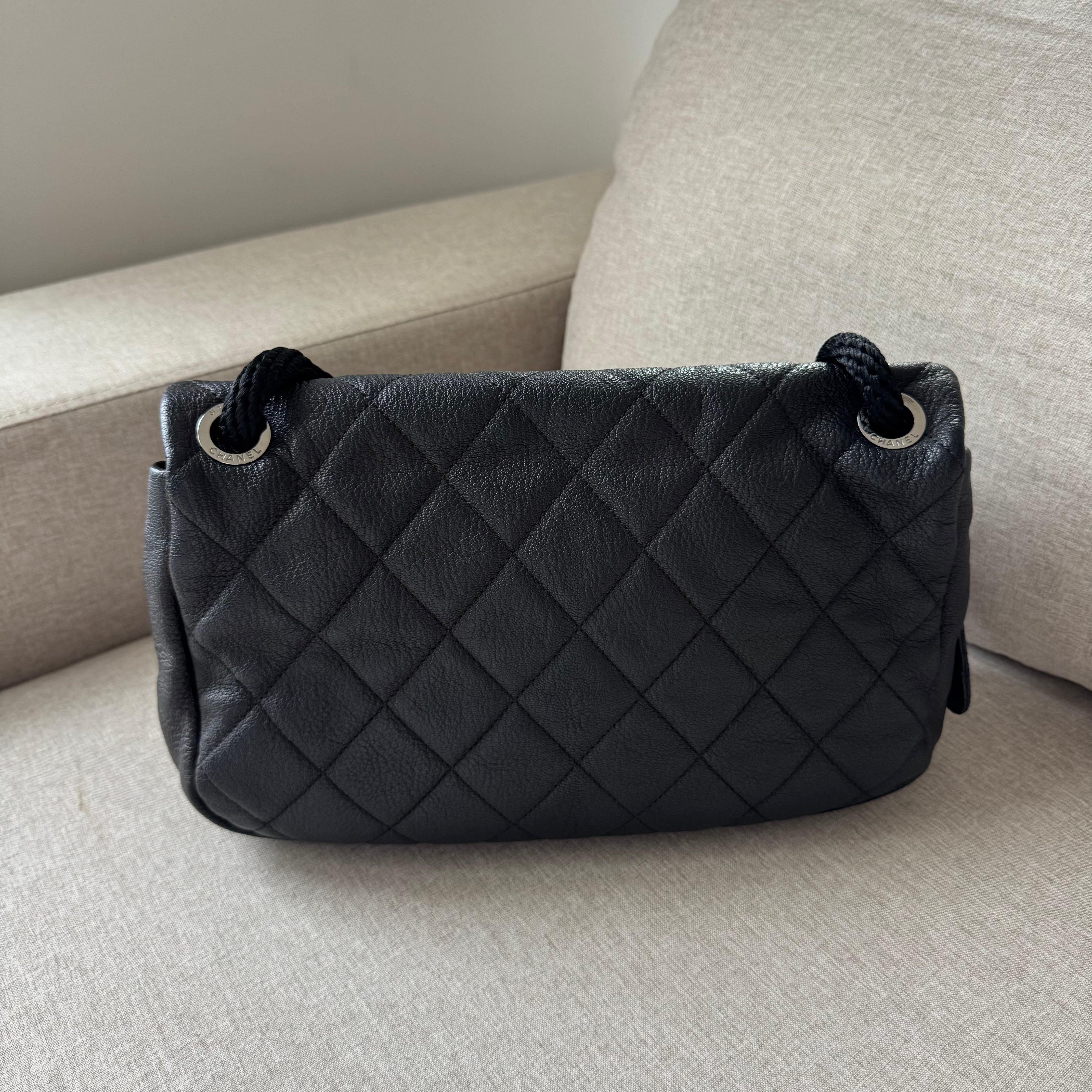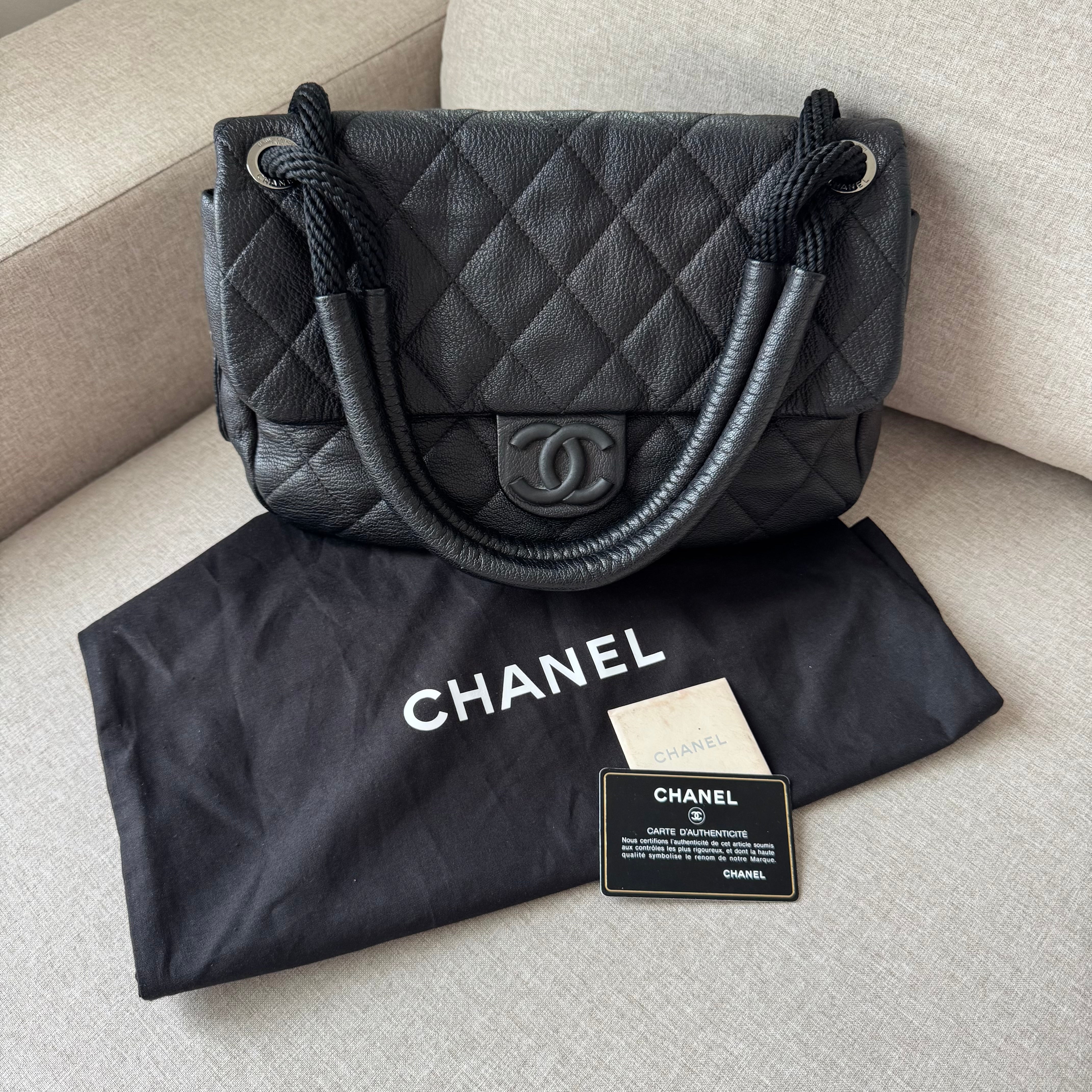 Chanel Black Diamond Quilted Expandable Zipper Bottom Rope Leather Handbag