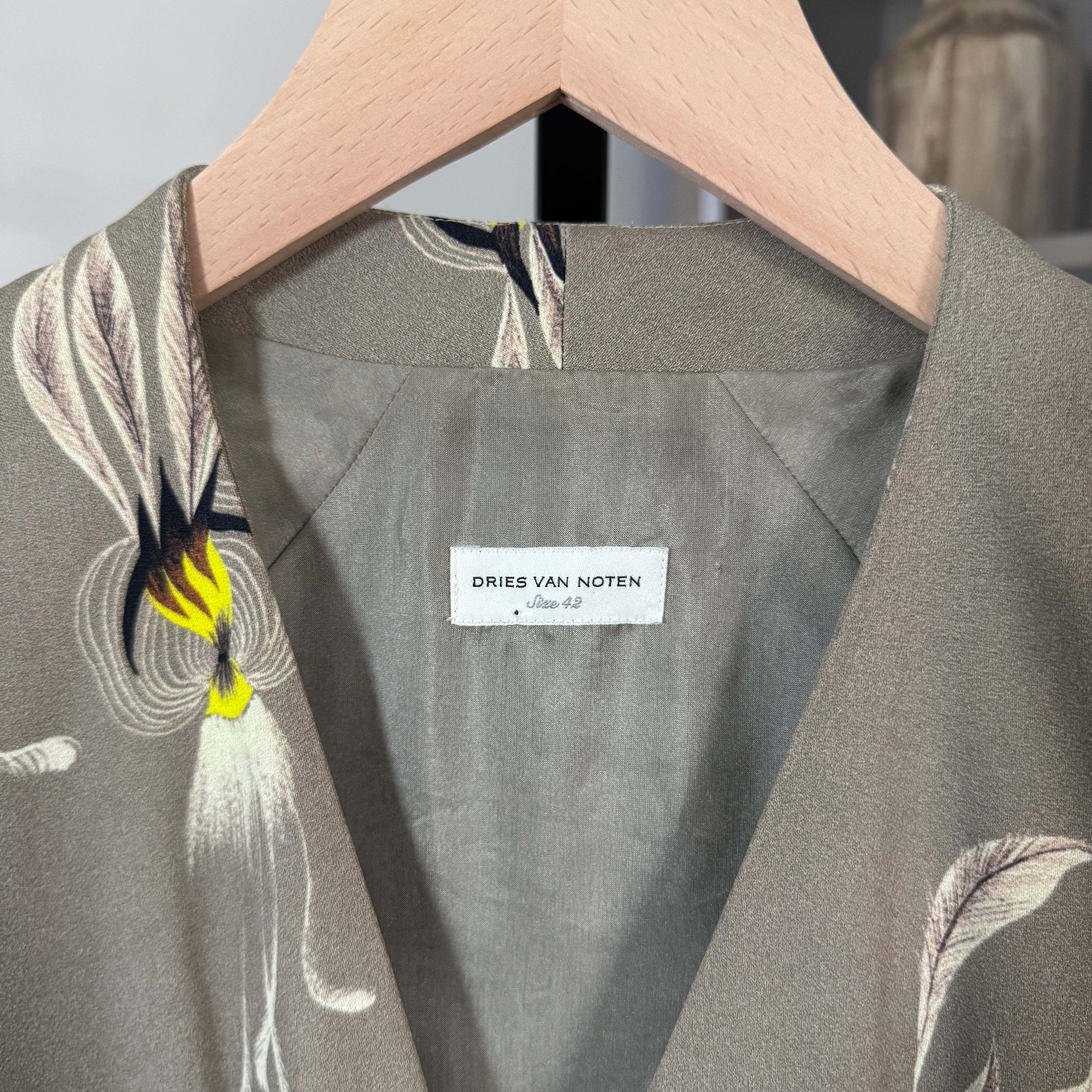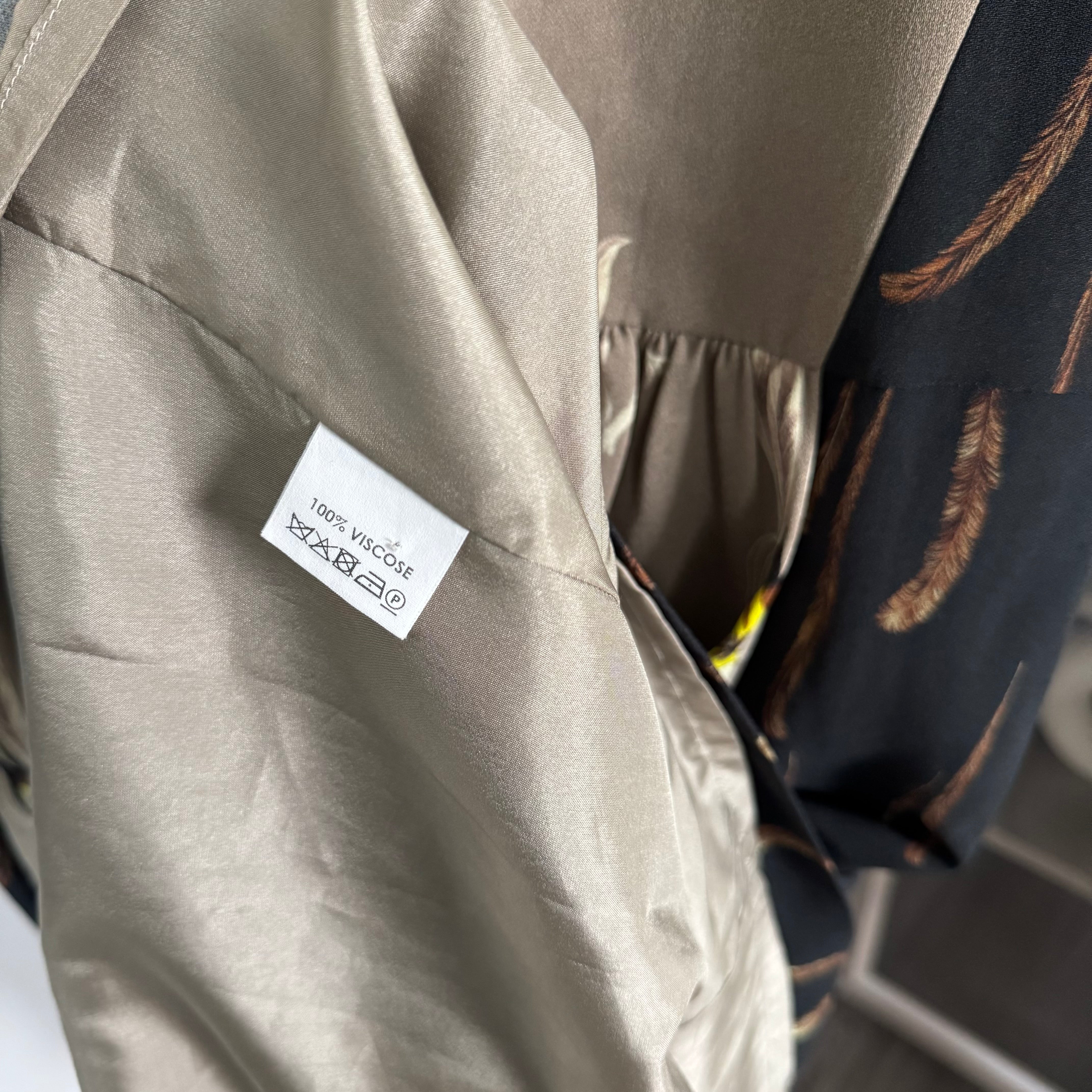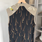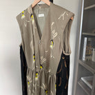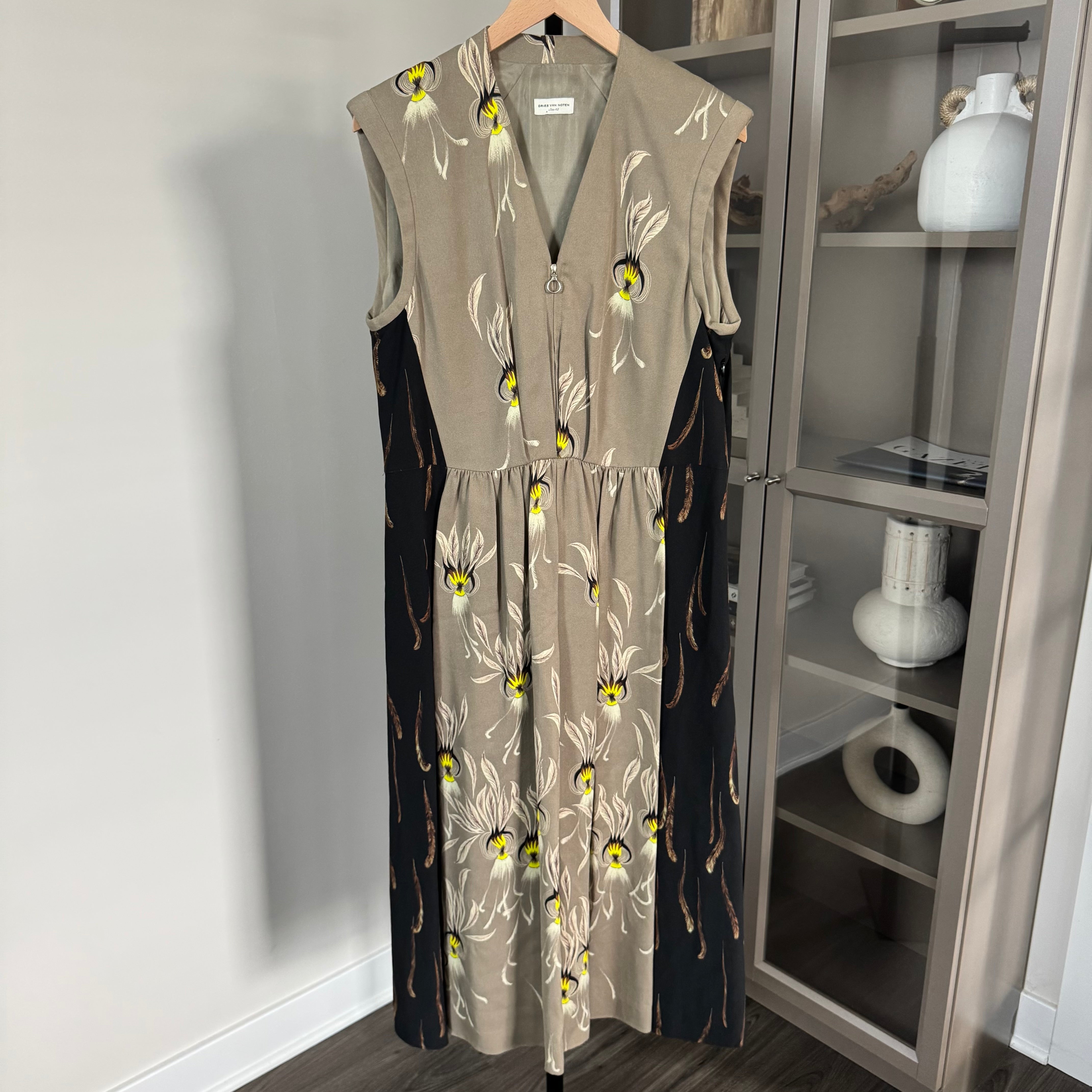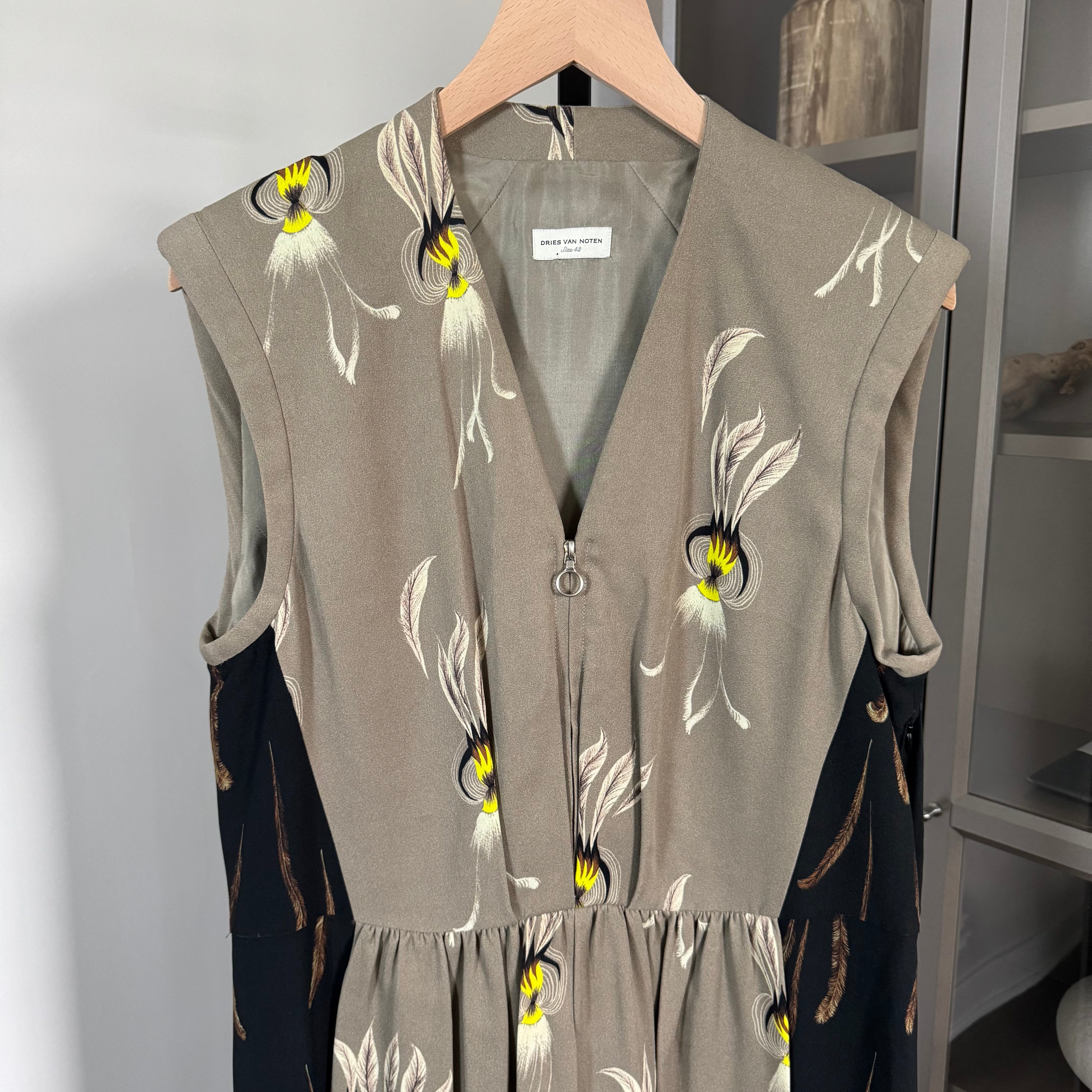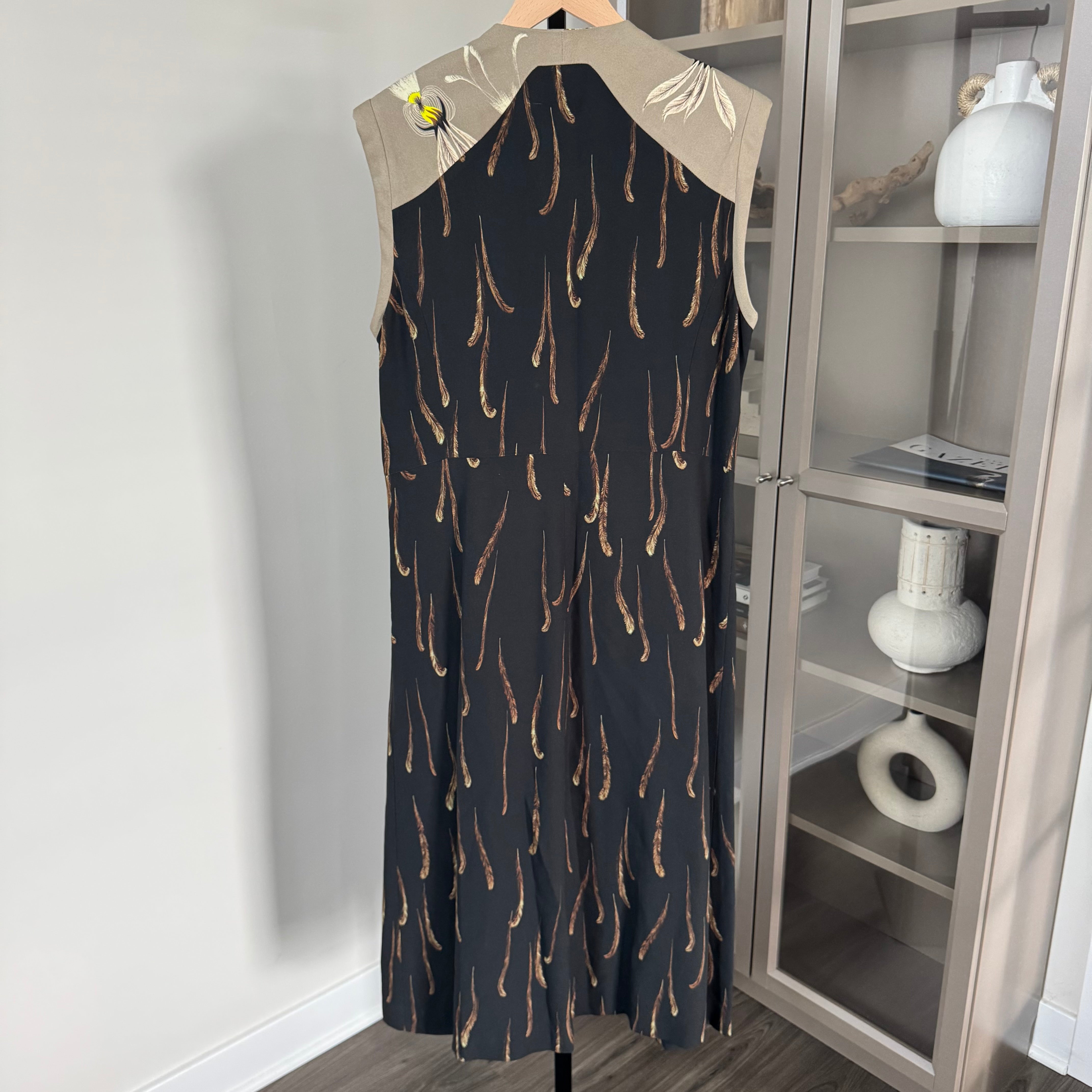 Dries Van Noten Tan Black Yellow Feather Print Pleated Midi Dress