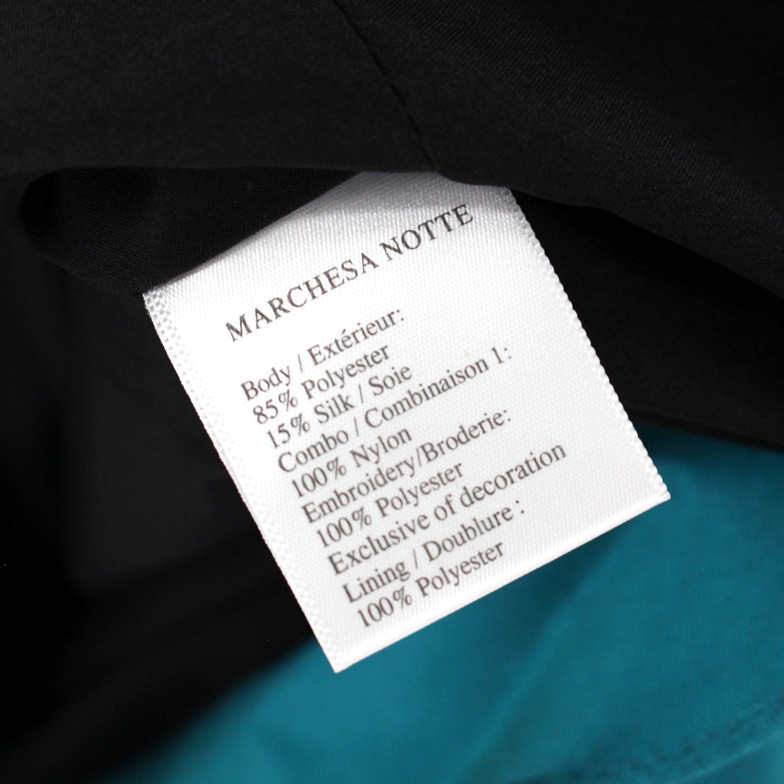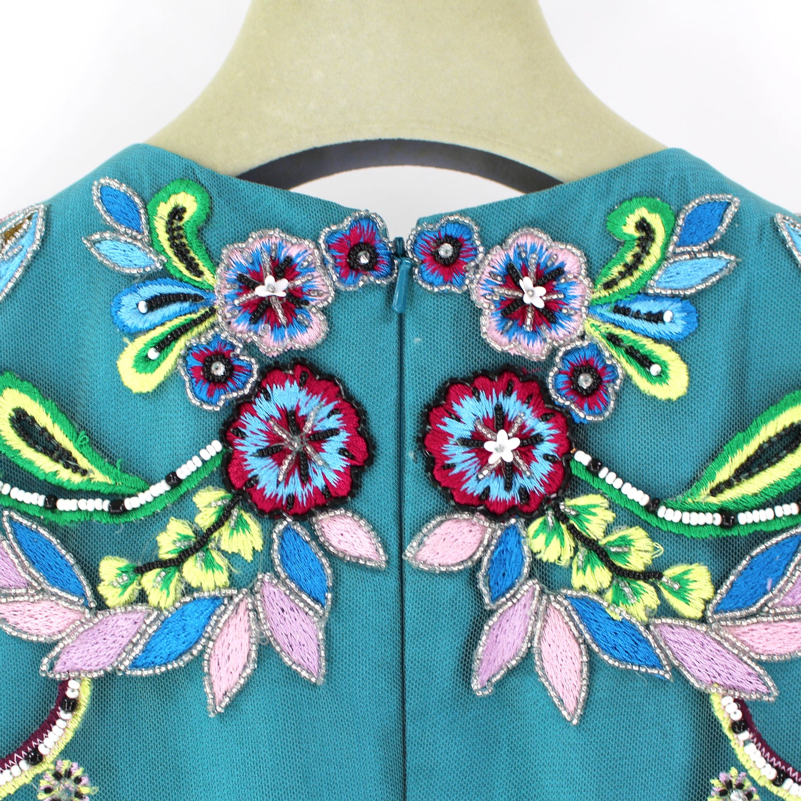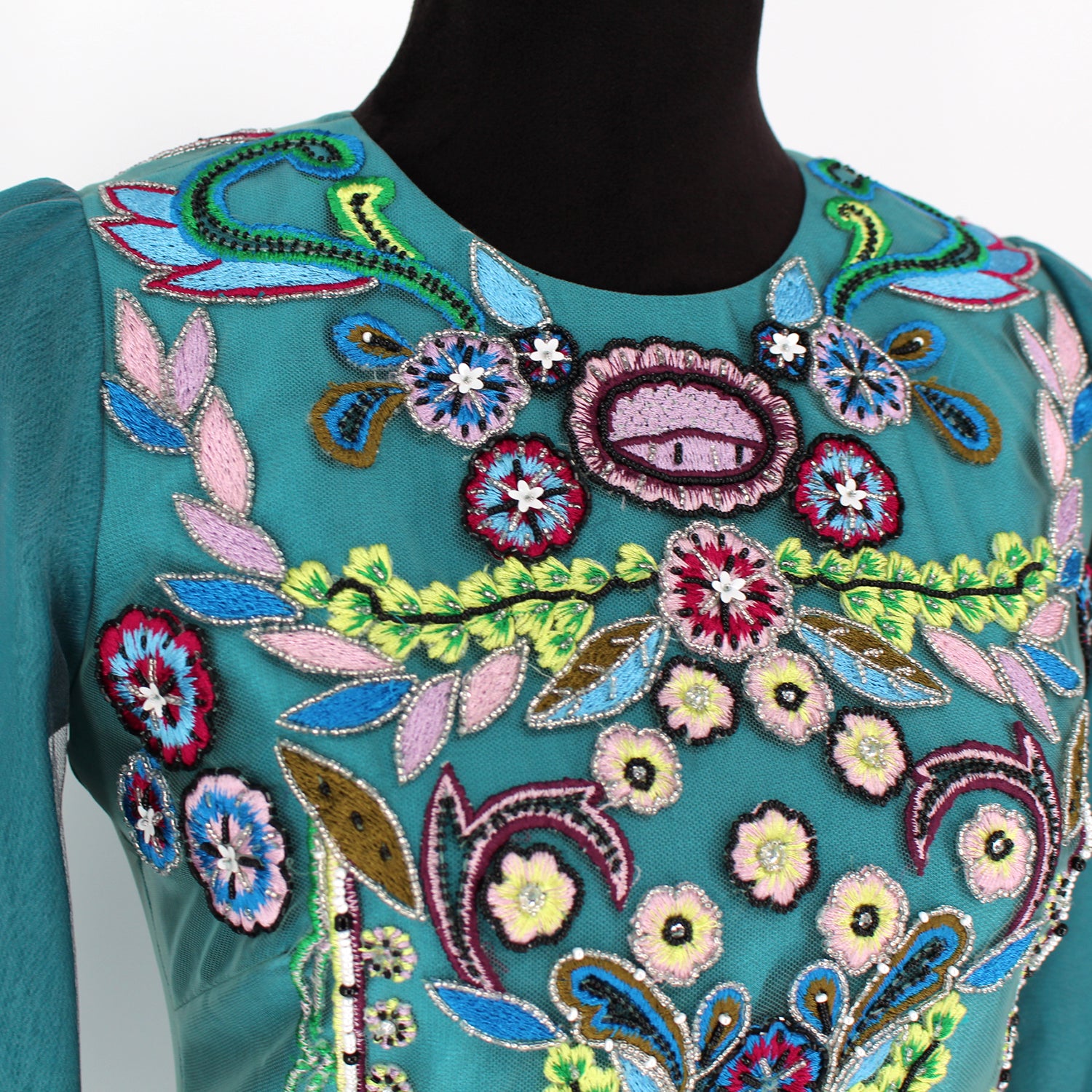 Marchesa Notte Teal Floral Embellished Satin 3/4 Sleeve Dress.
