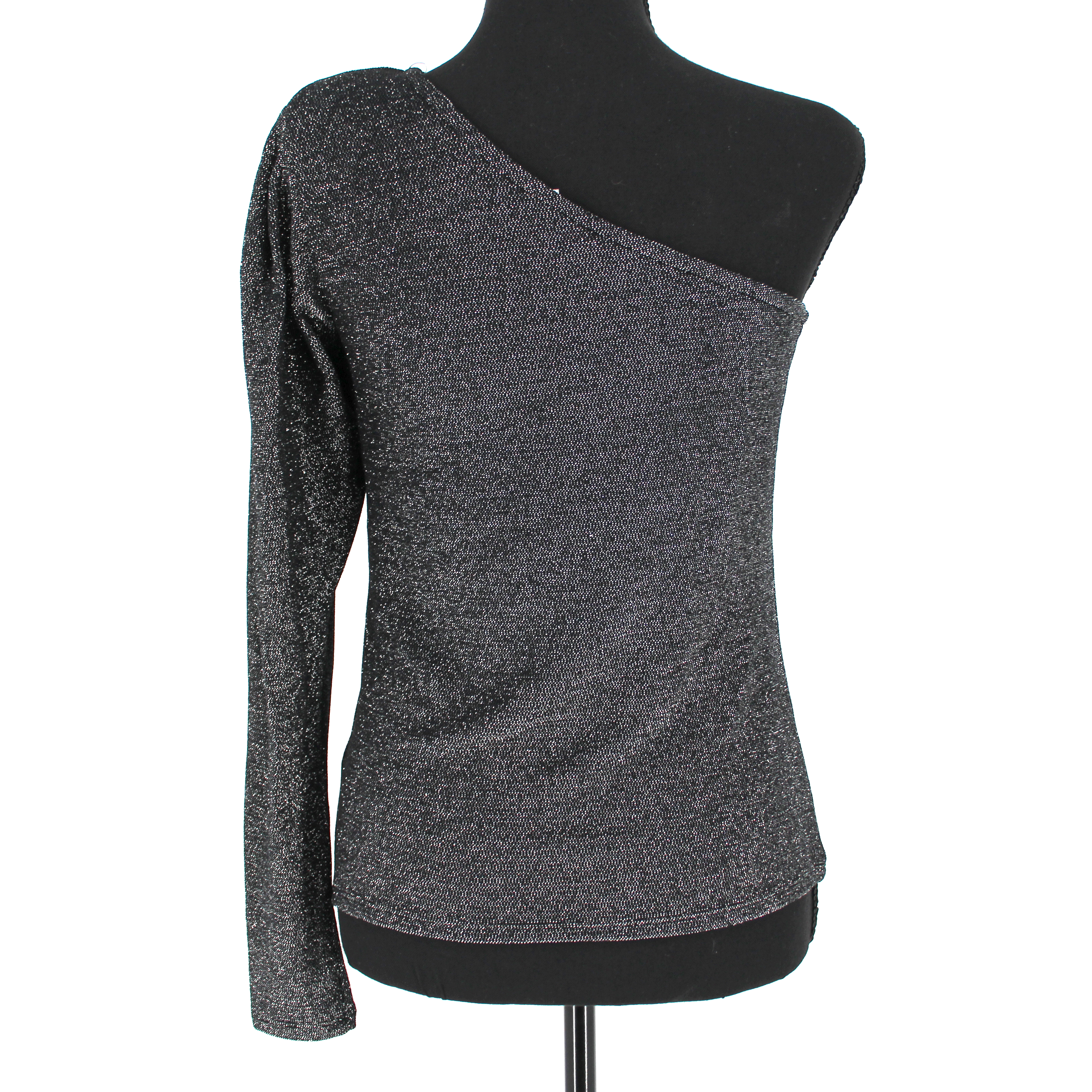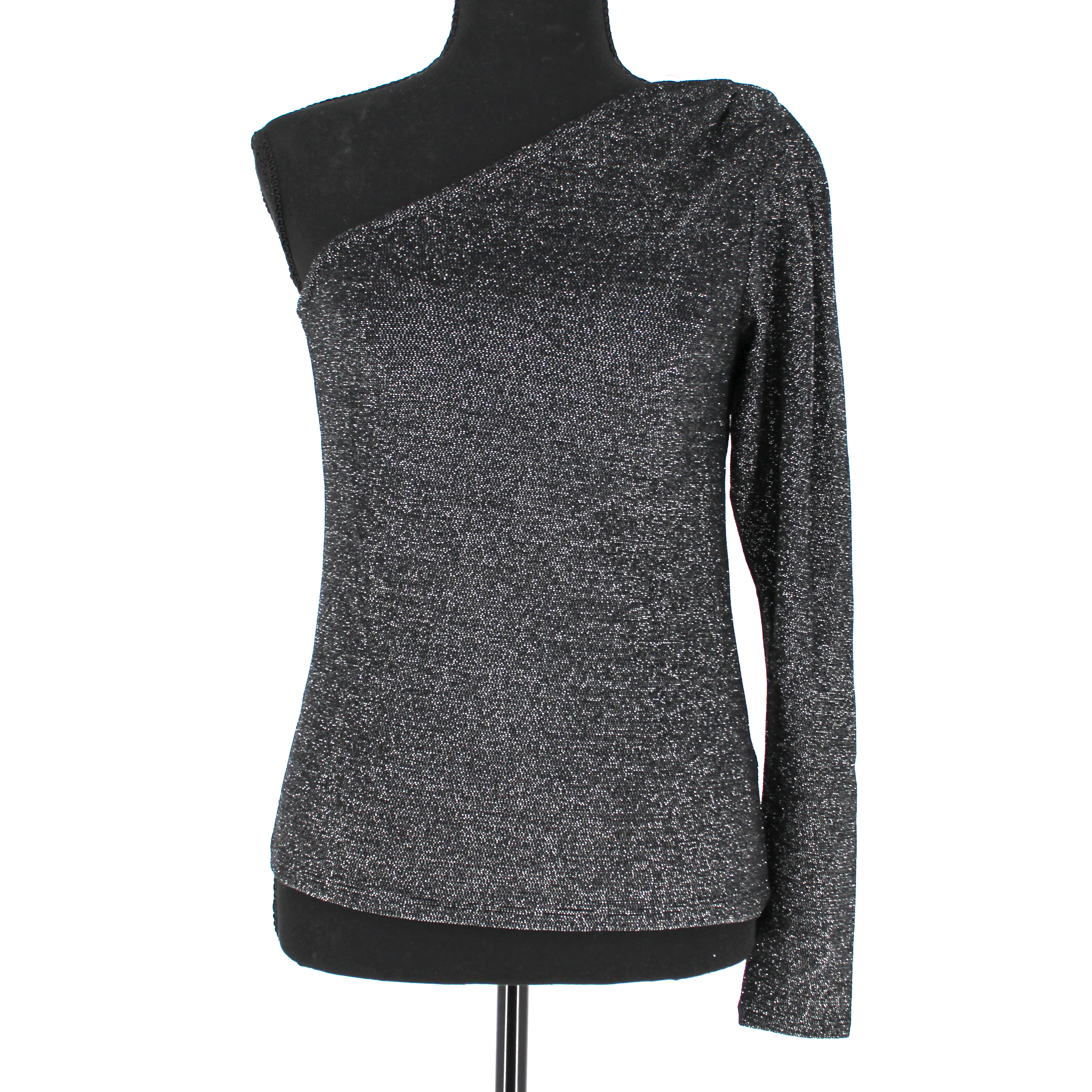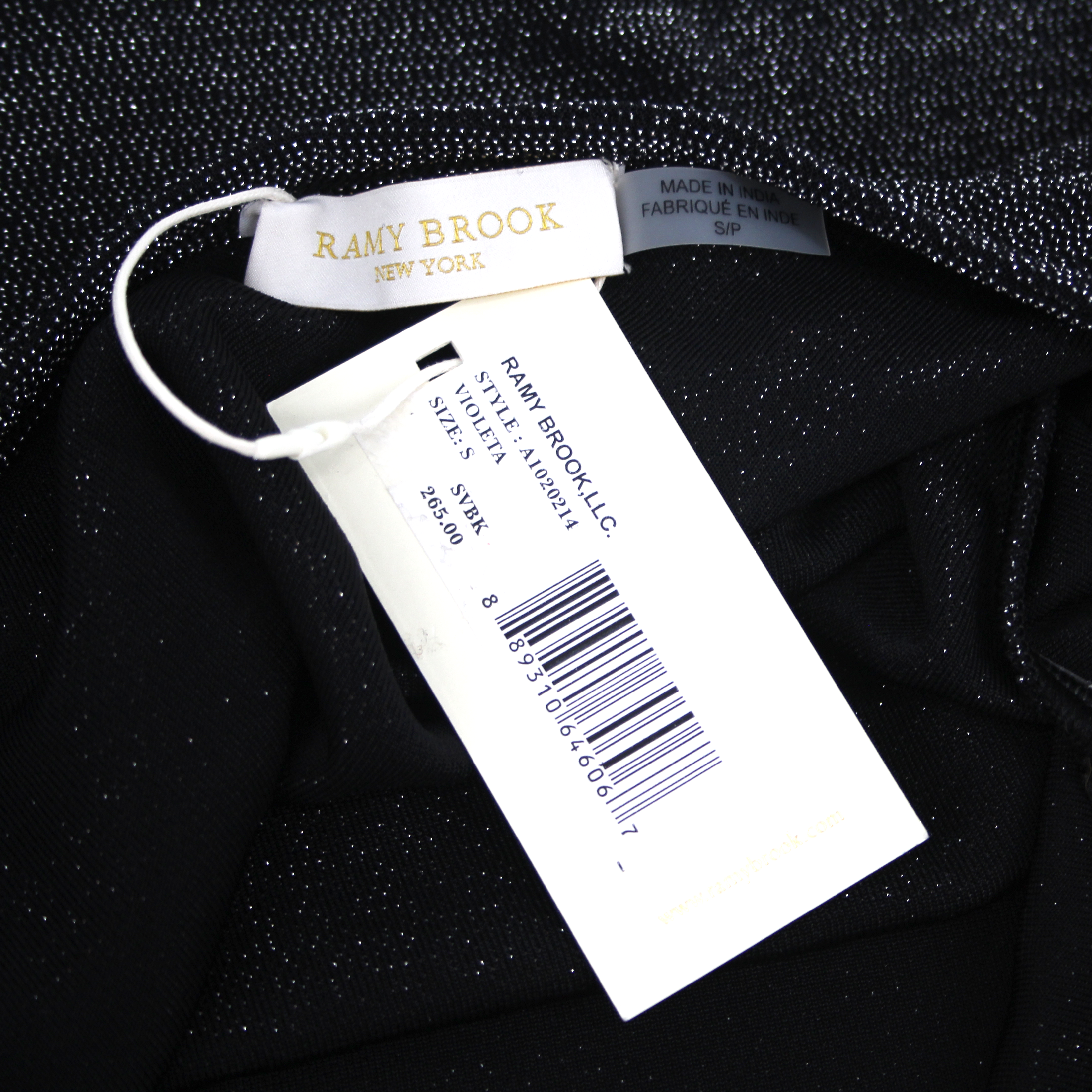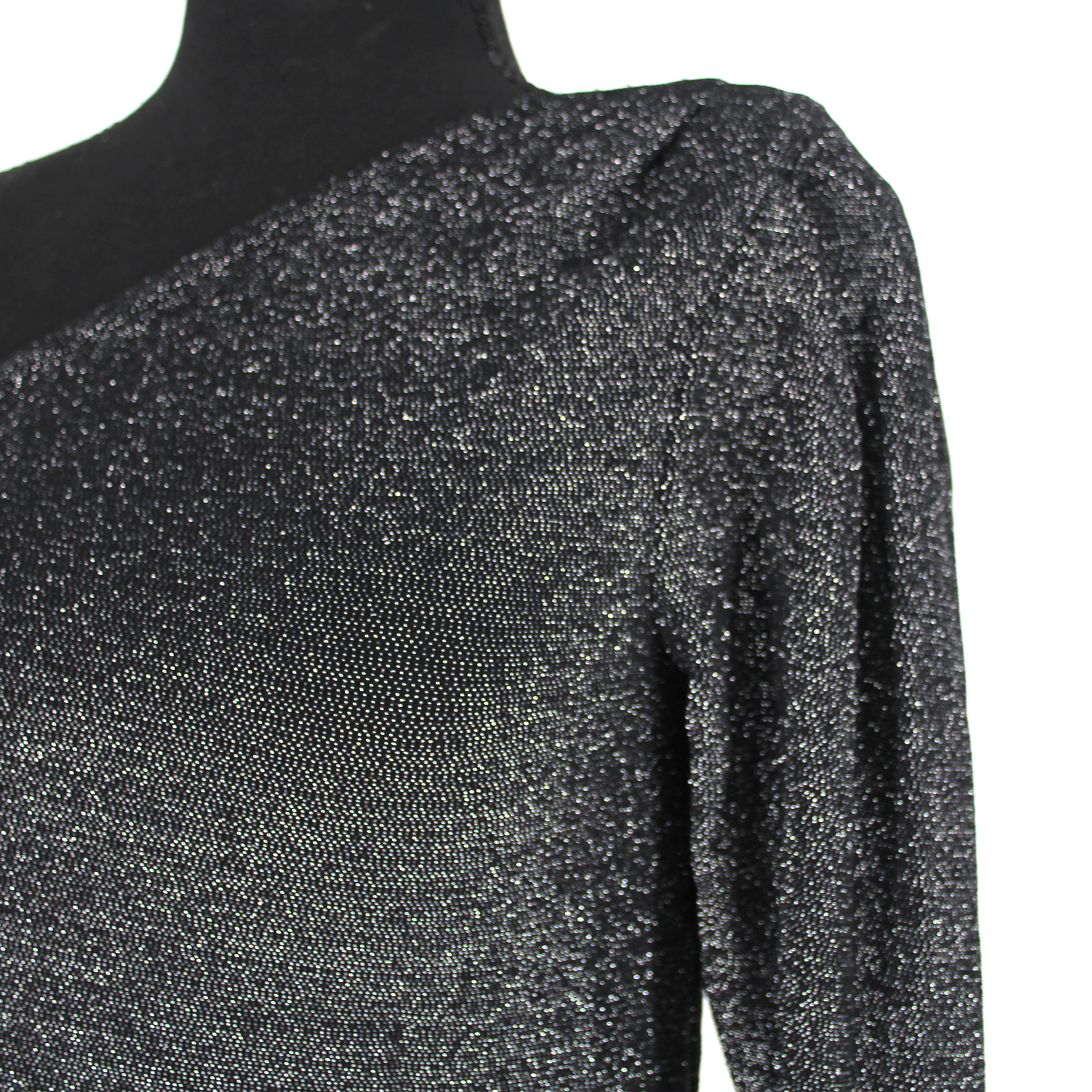 Ramy Brook Violeta Black Silver Metallic Nylon One Shoulder Long Sleeve Top.