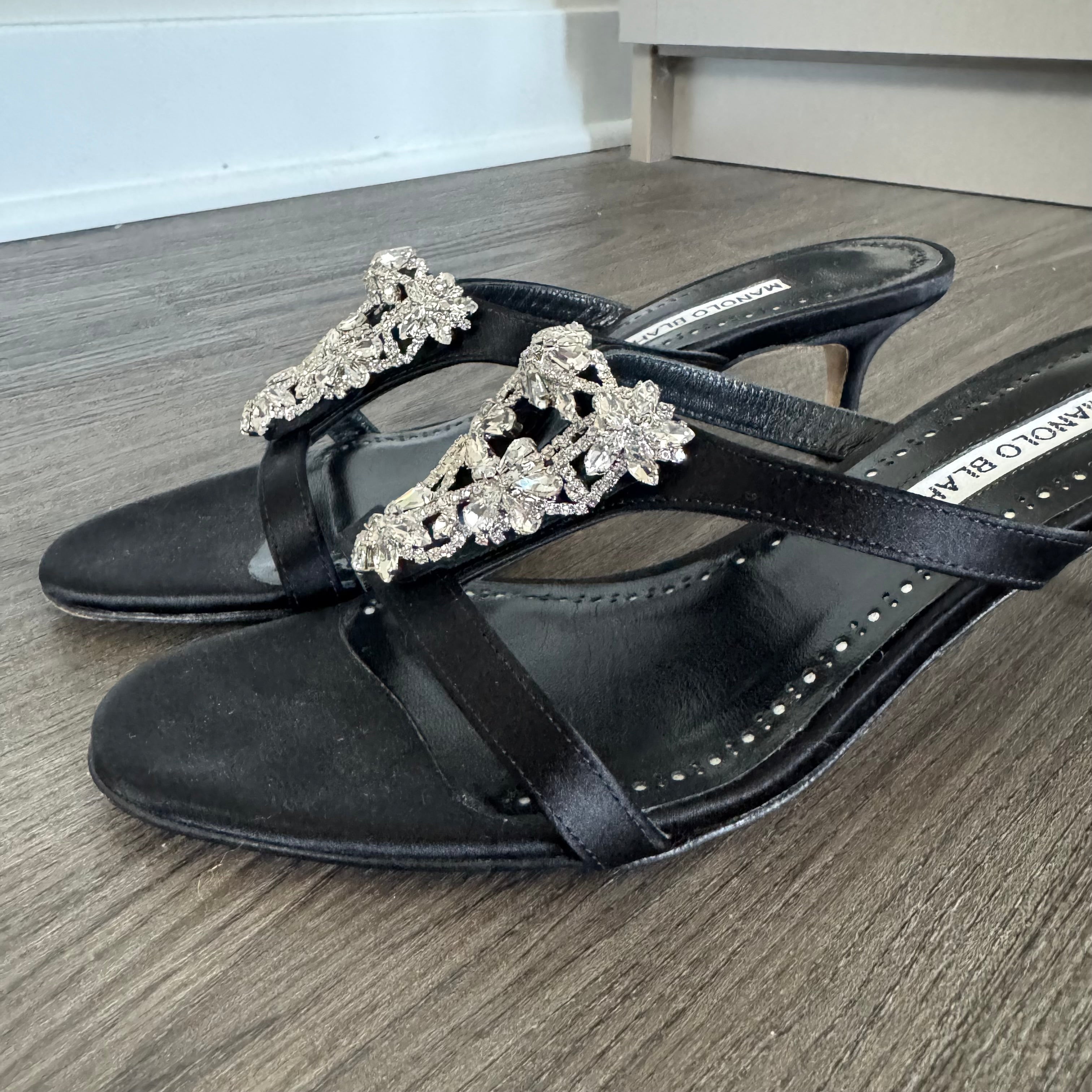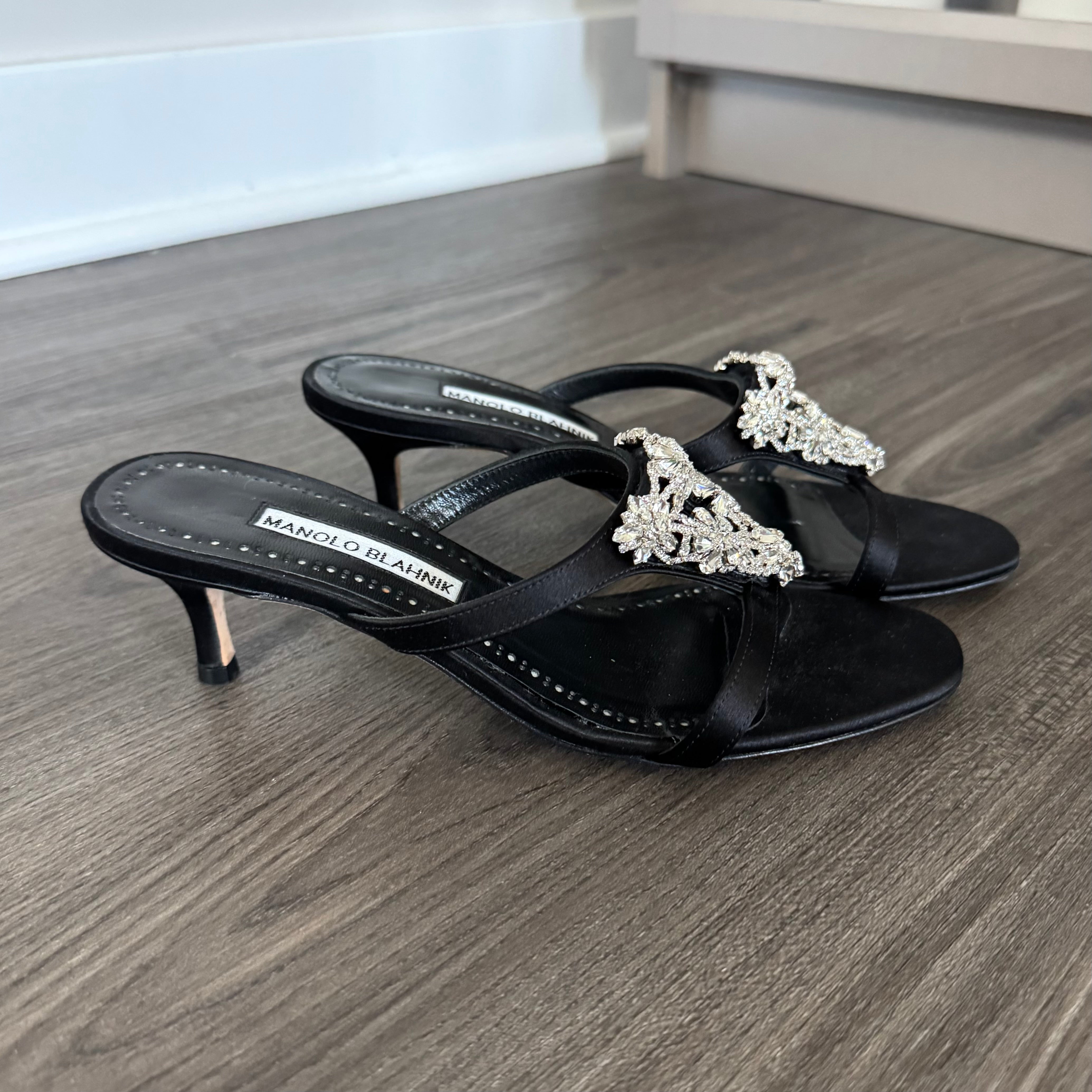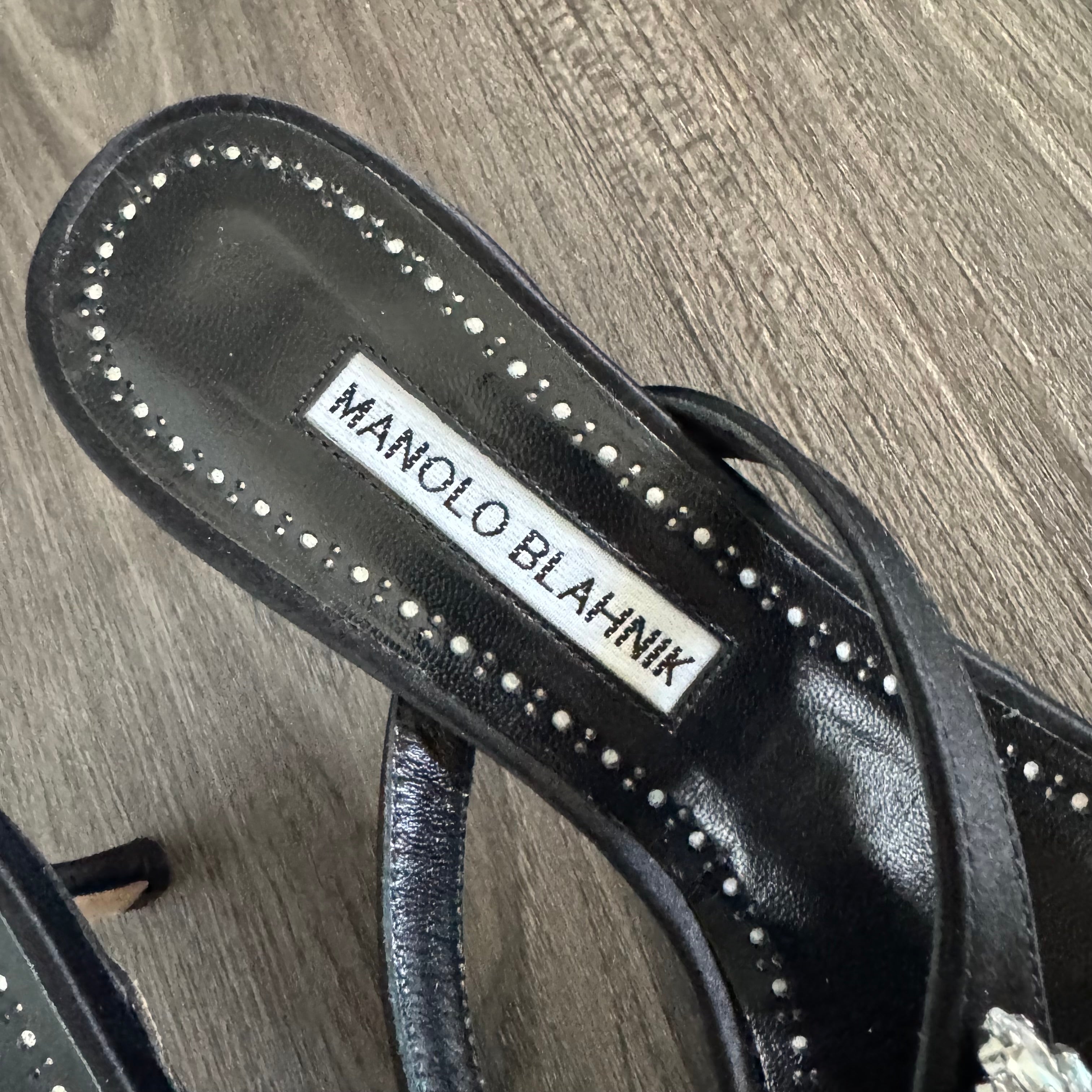 Manolo Blahnik Trinamu 50 Black Satin Embellished Kitten Heel Sandals