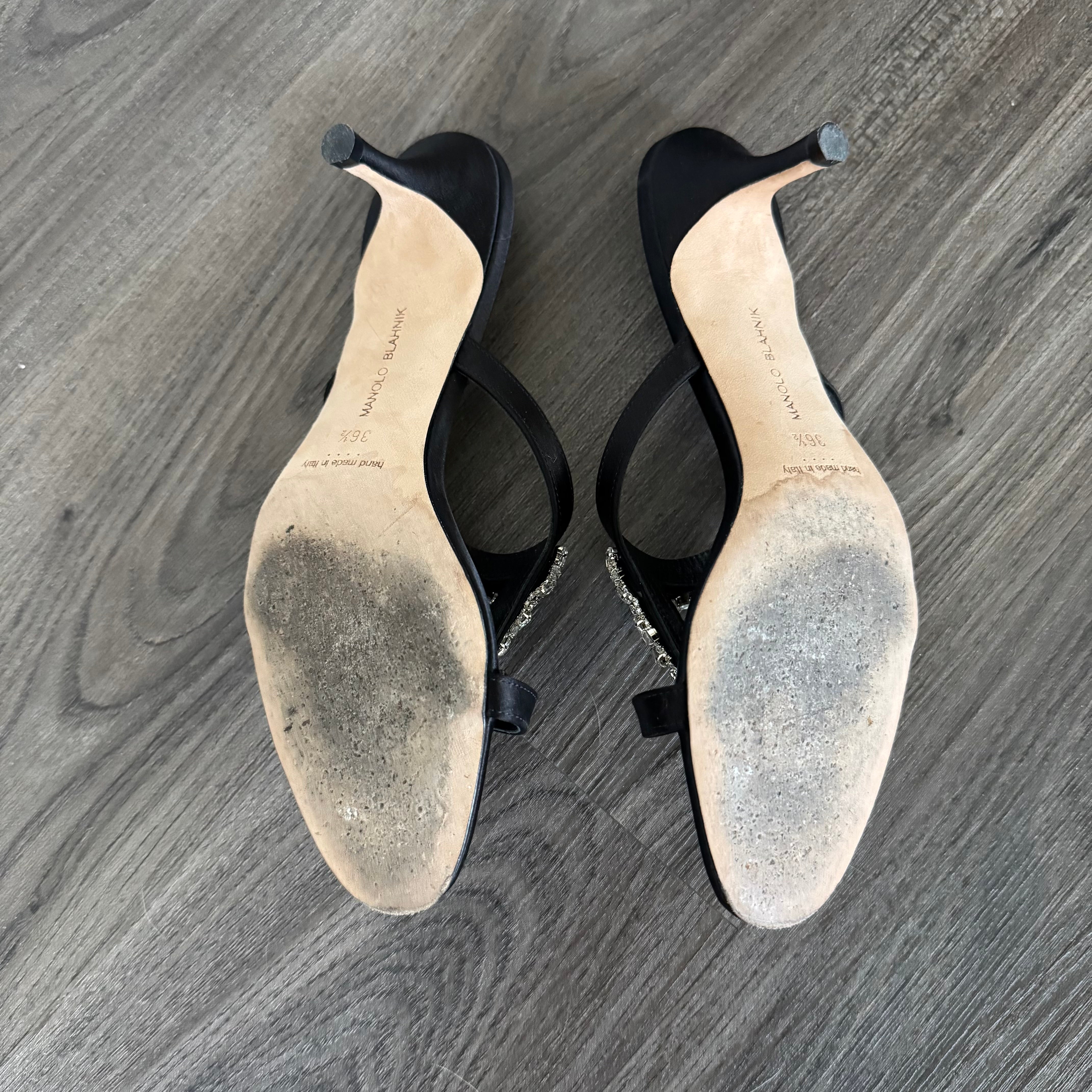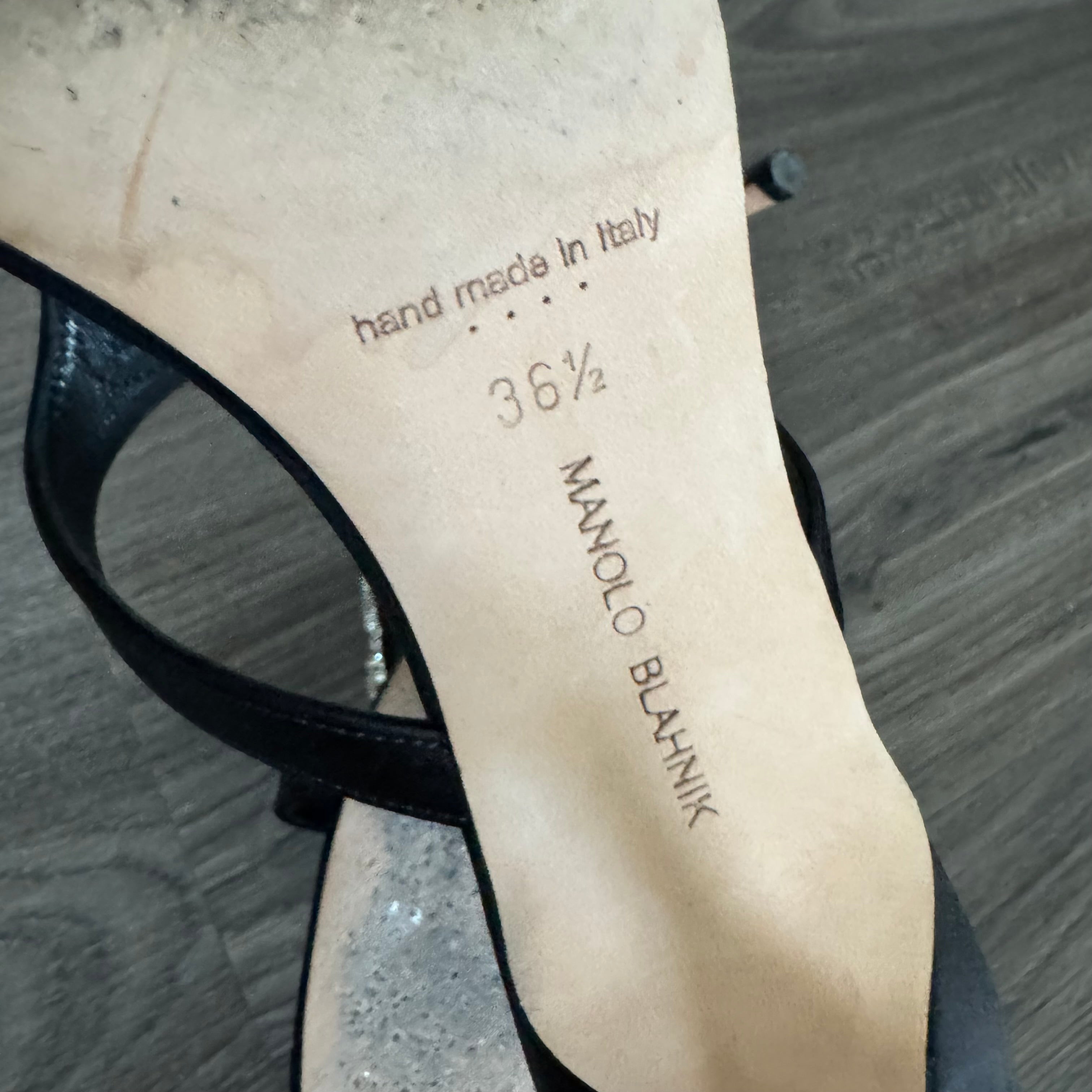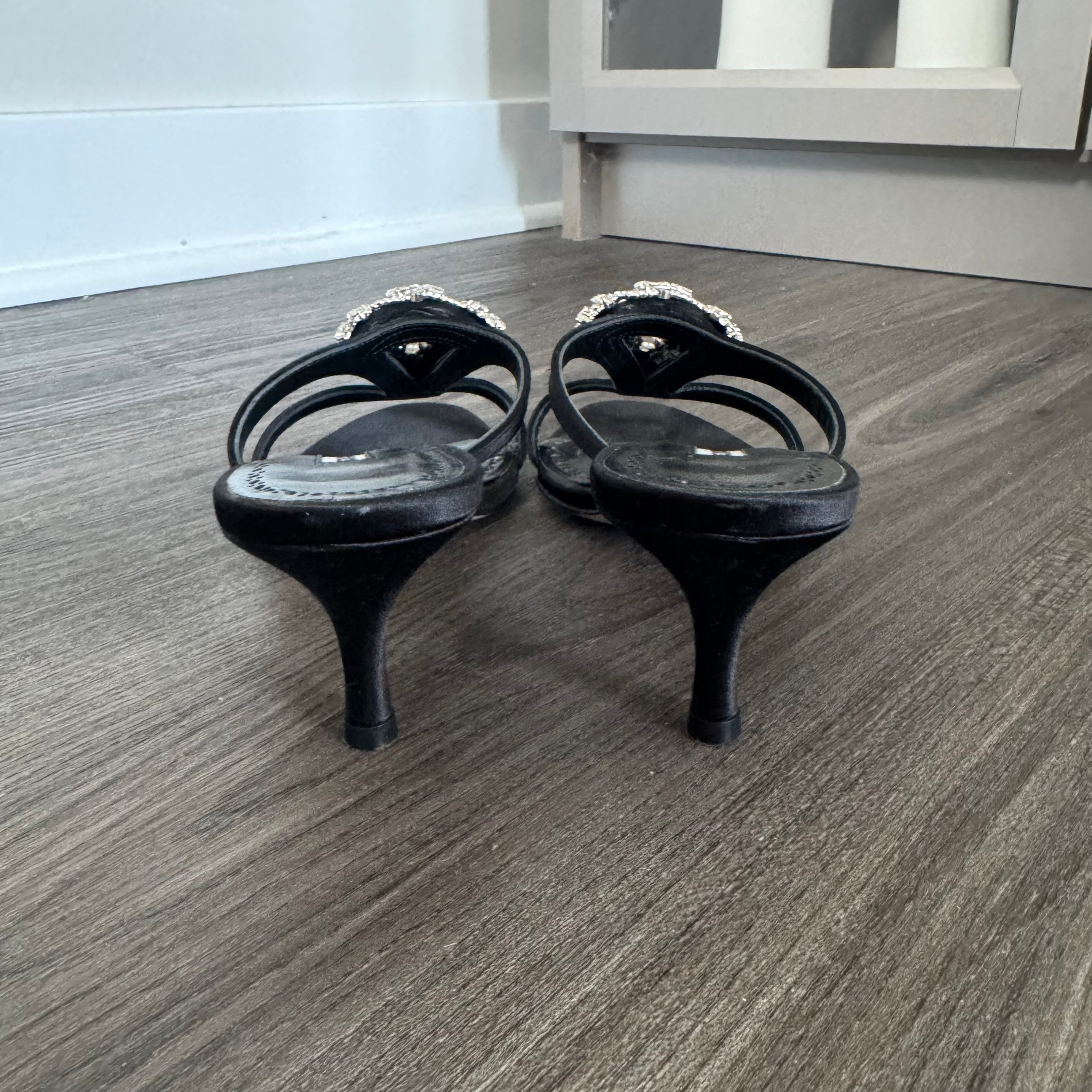 Manolo Blahnik Trinamu 50 Black Satin Embellished Kitten Heel Sandals