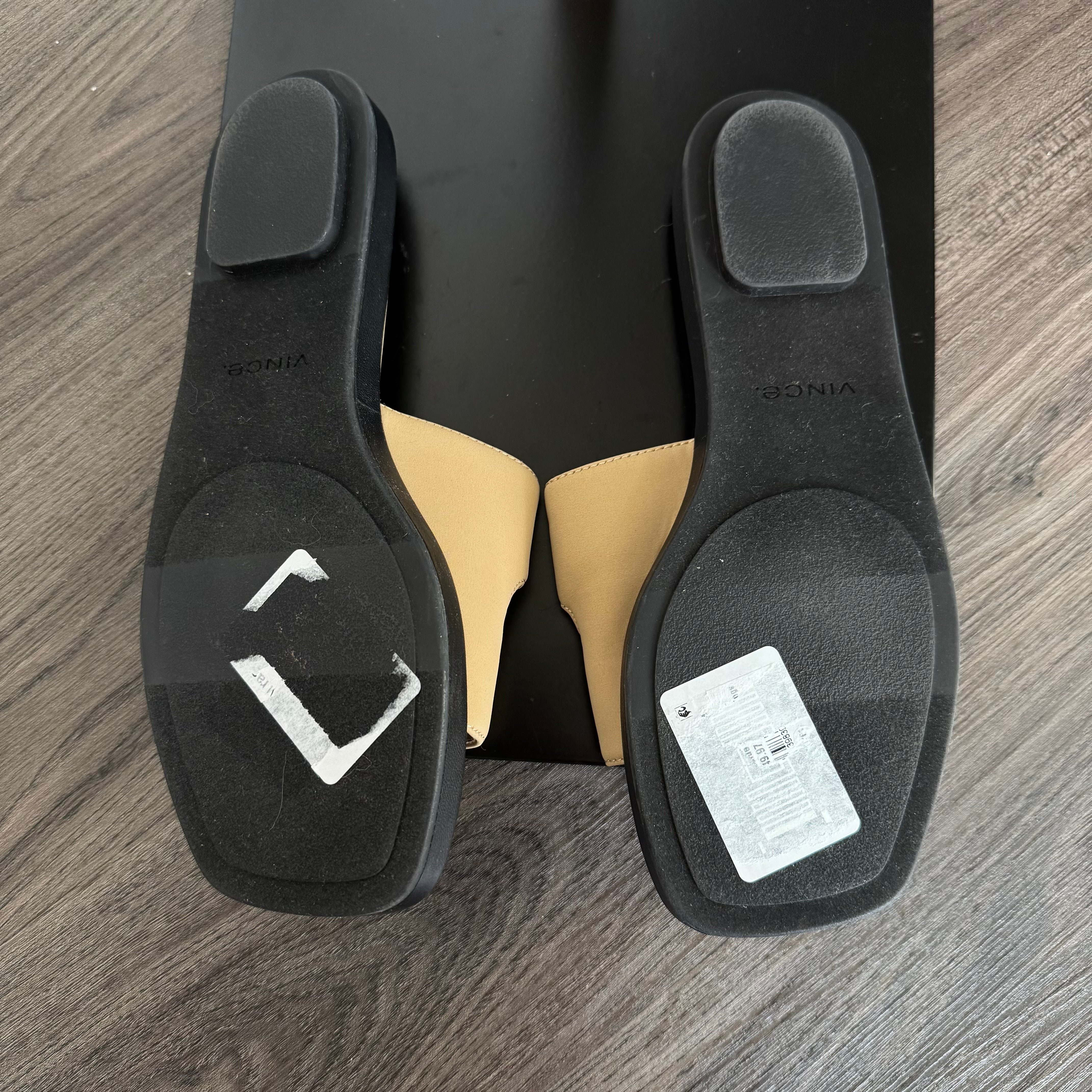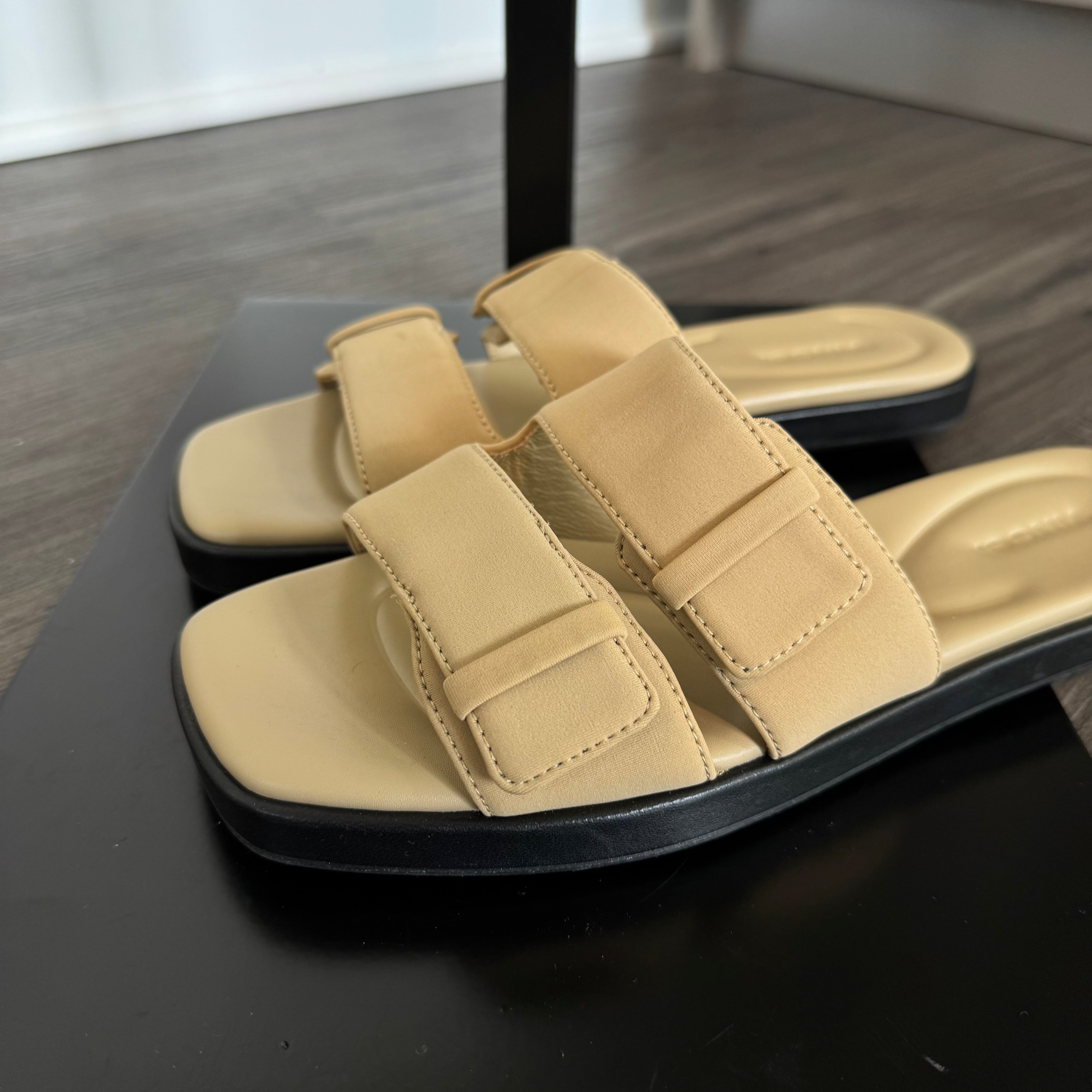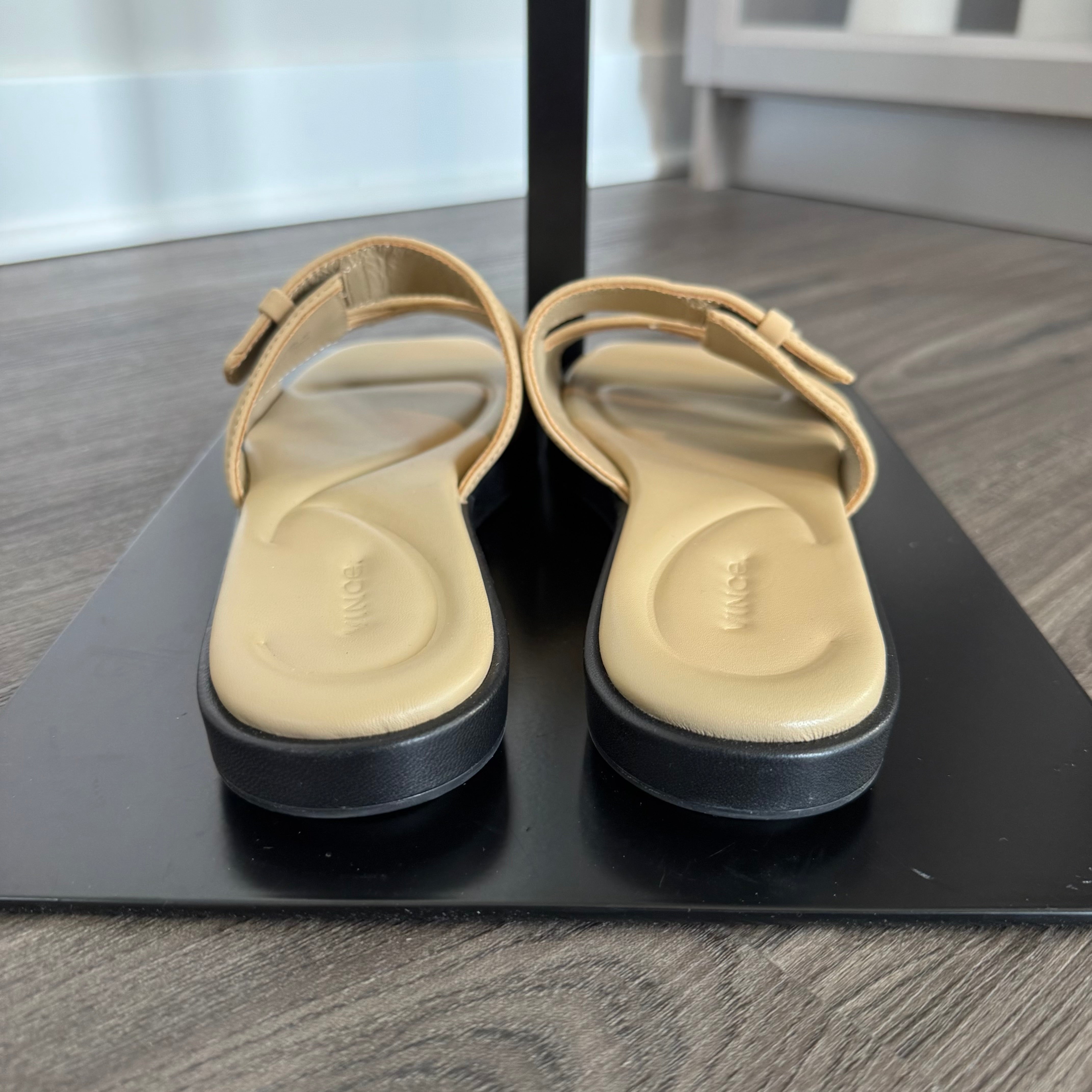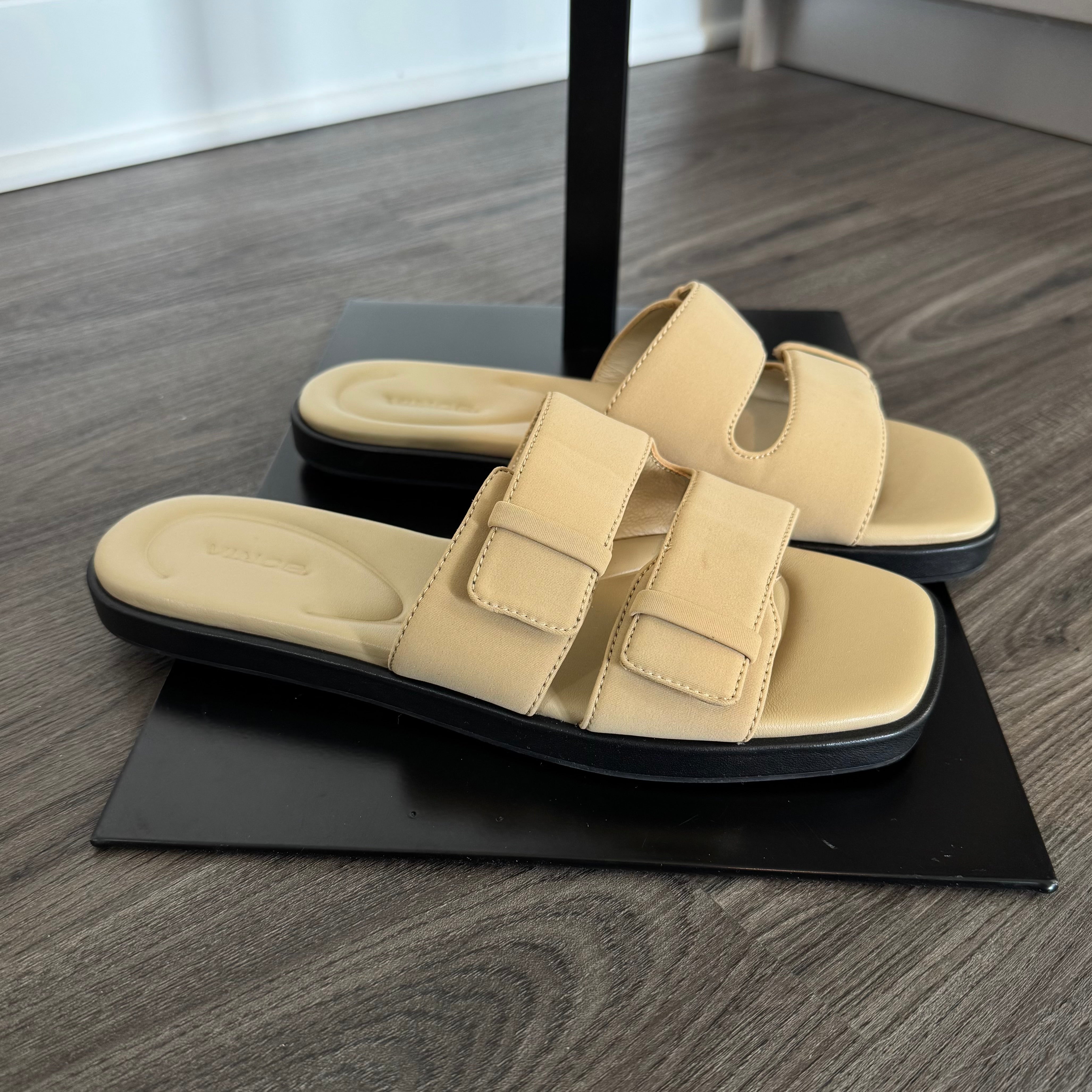 Vince Rhode Dual Strap Farro Tan Slip On Flat Sandals