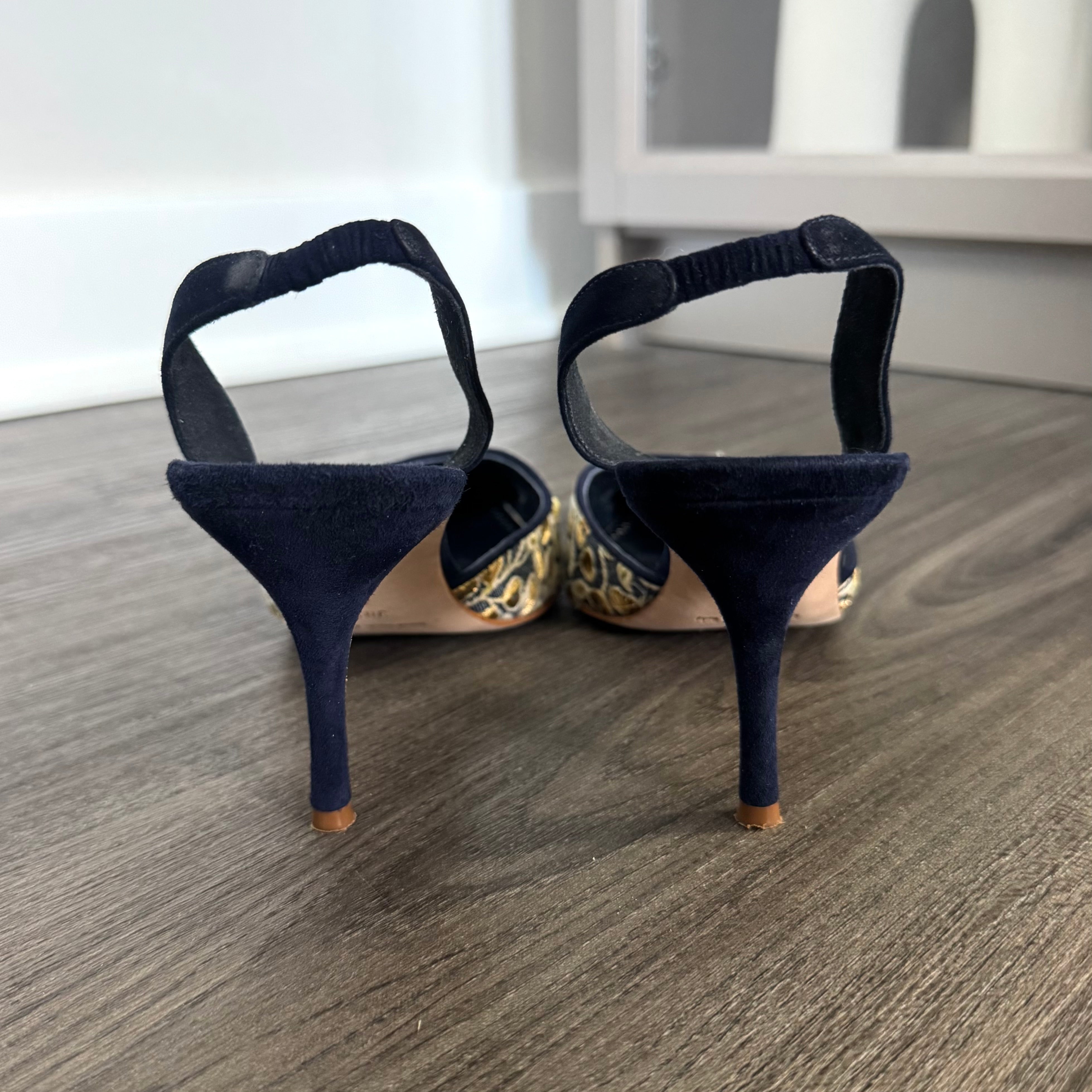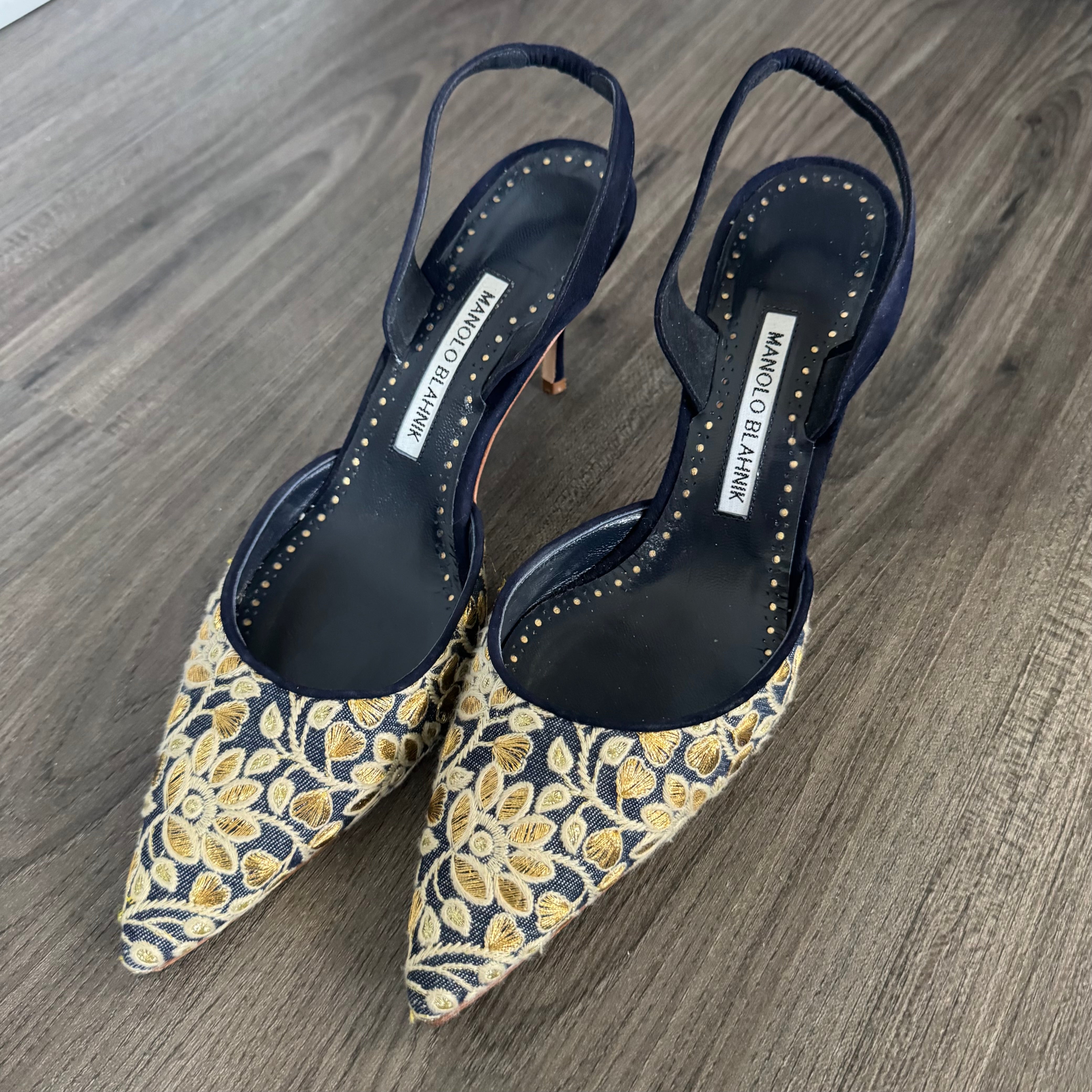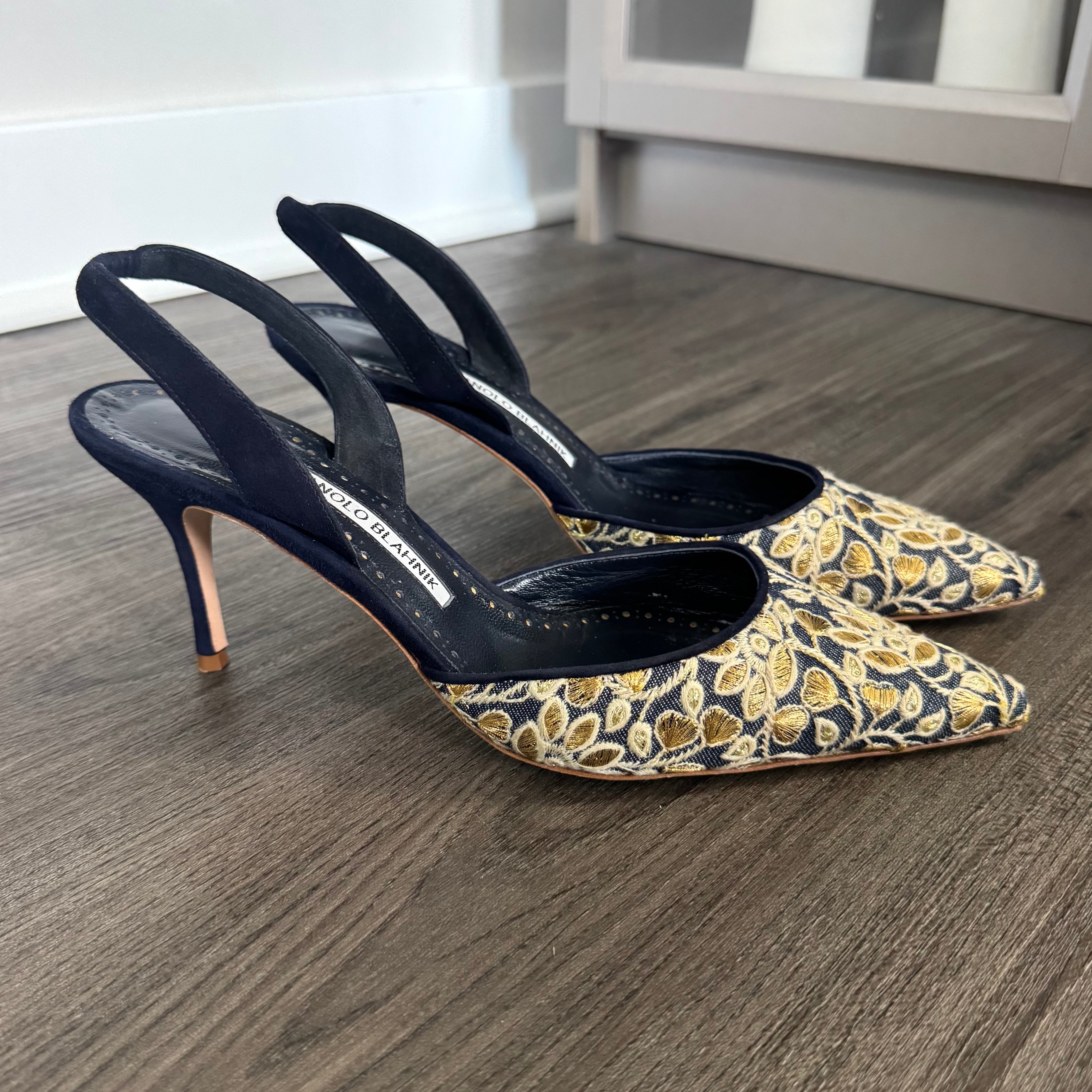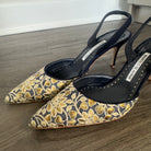 Manolo Blahnik Carolyne 70 Blue Gold Floral Slingback Point Toe