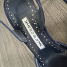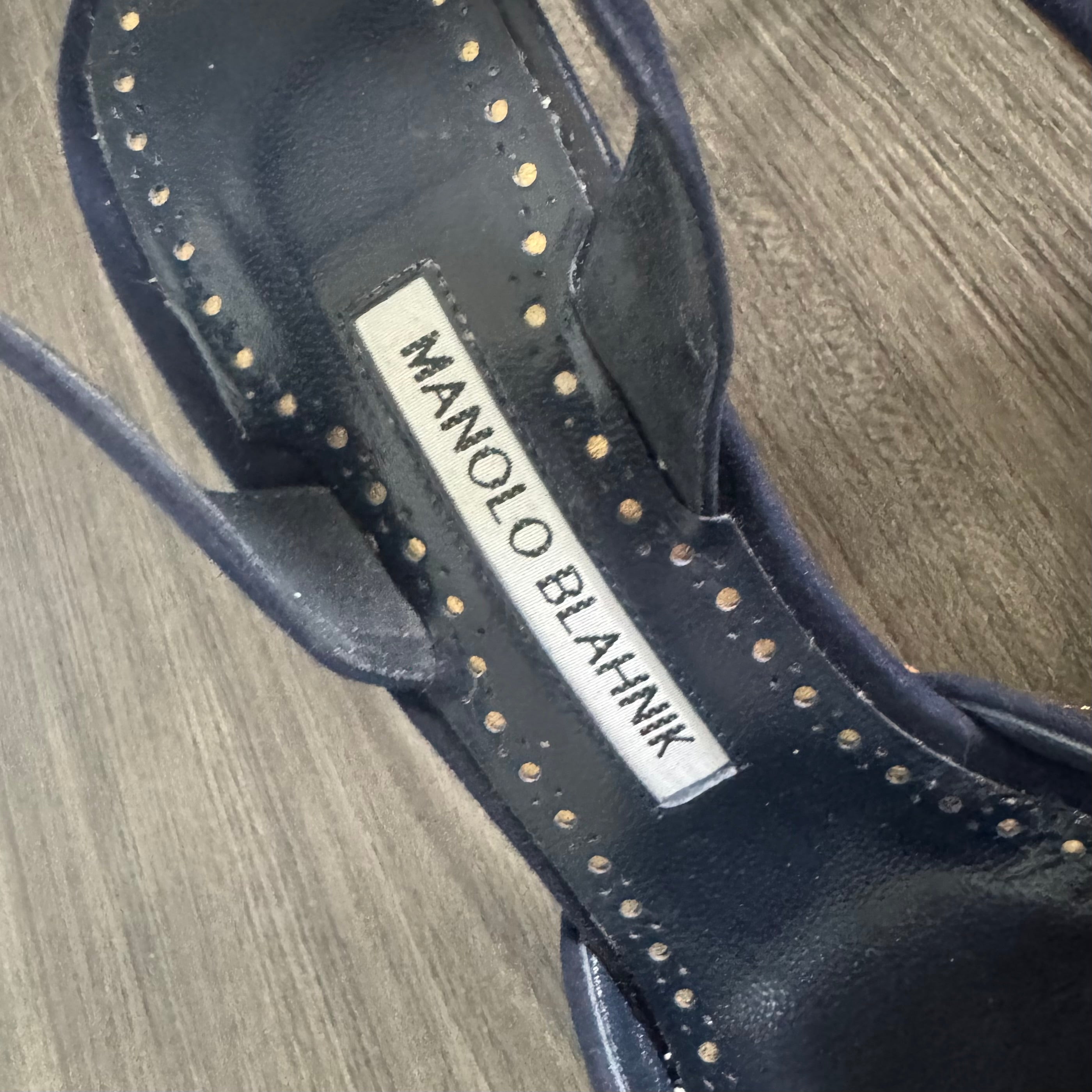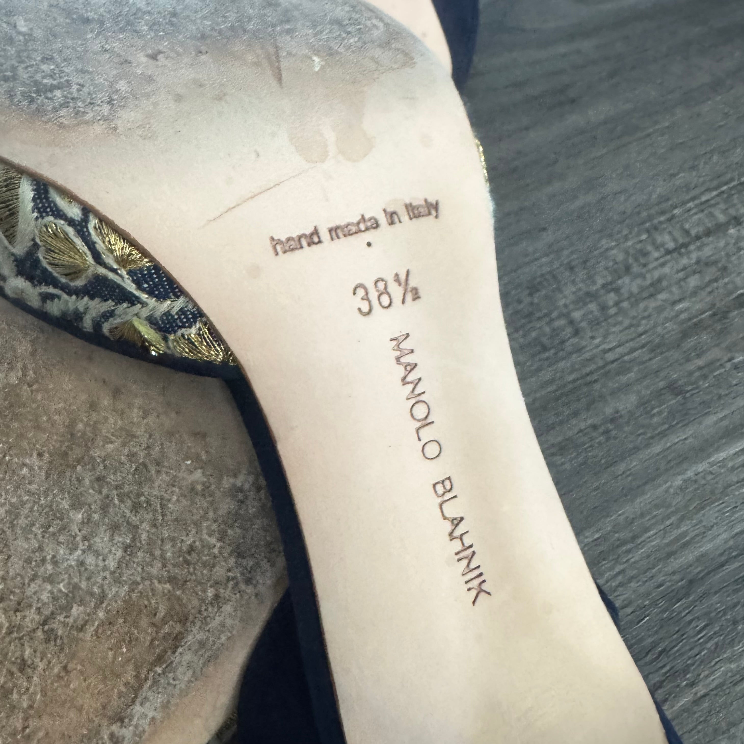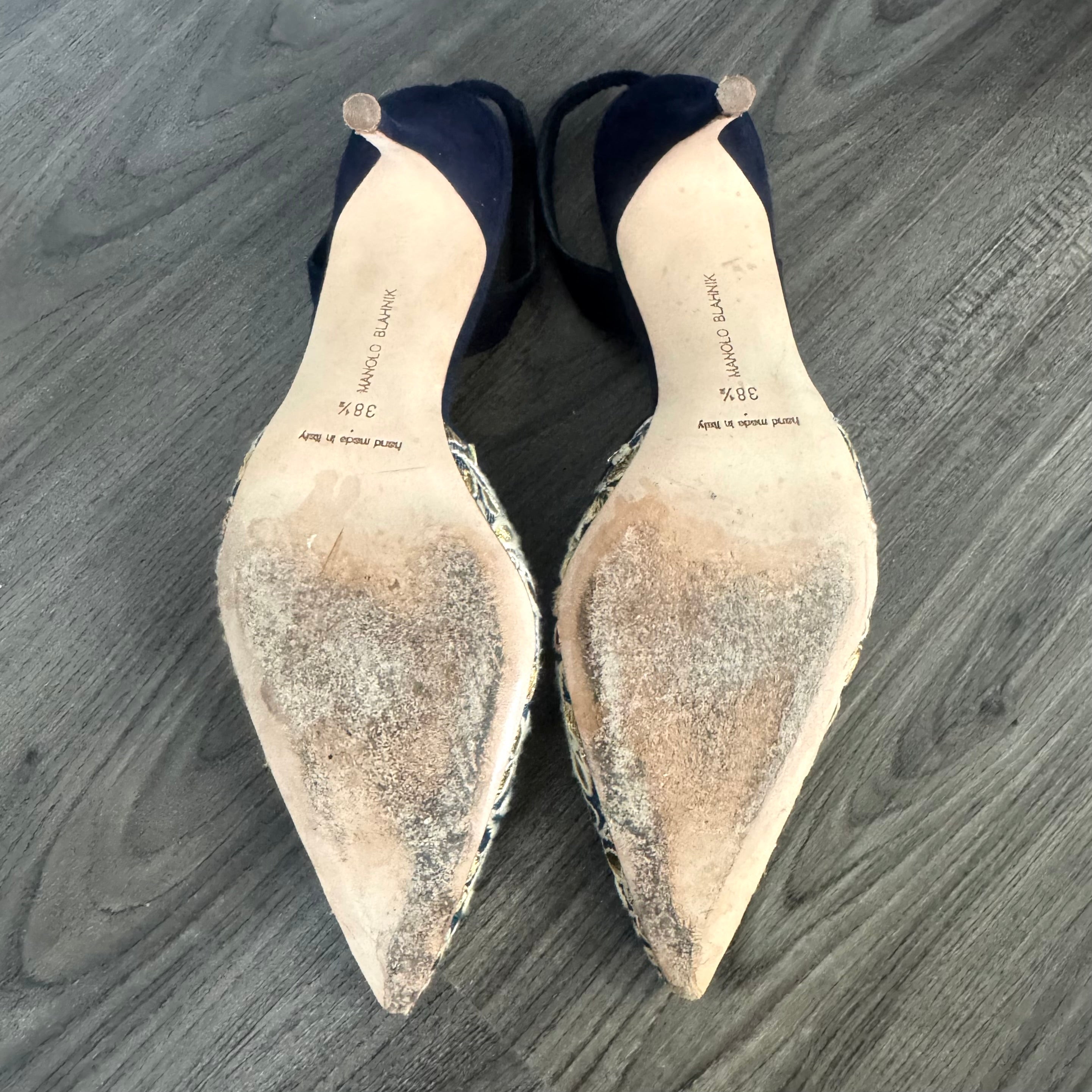 Manolo Blahnik Carolyne 70 Blue Gold Floral Slingback Point Toe