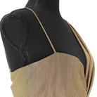 - Attached wide wrap scarf to drape behind the neckFront with