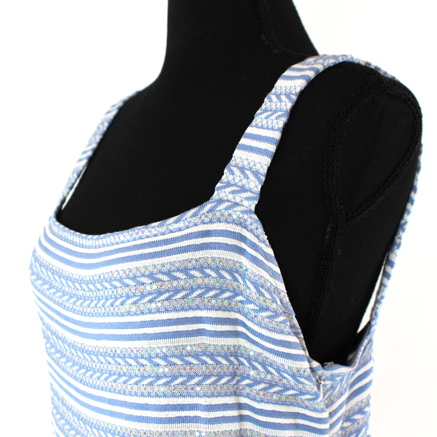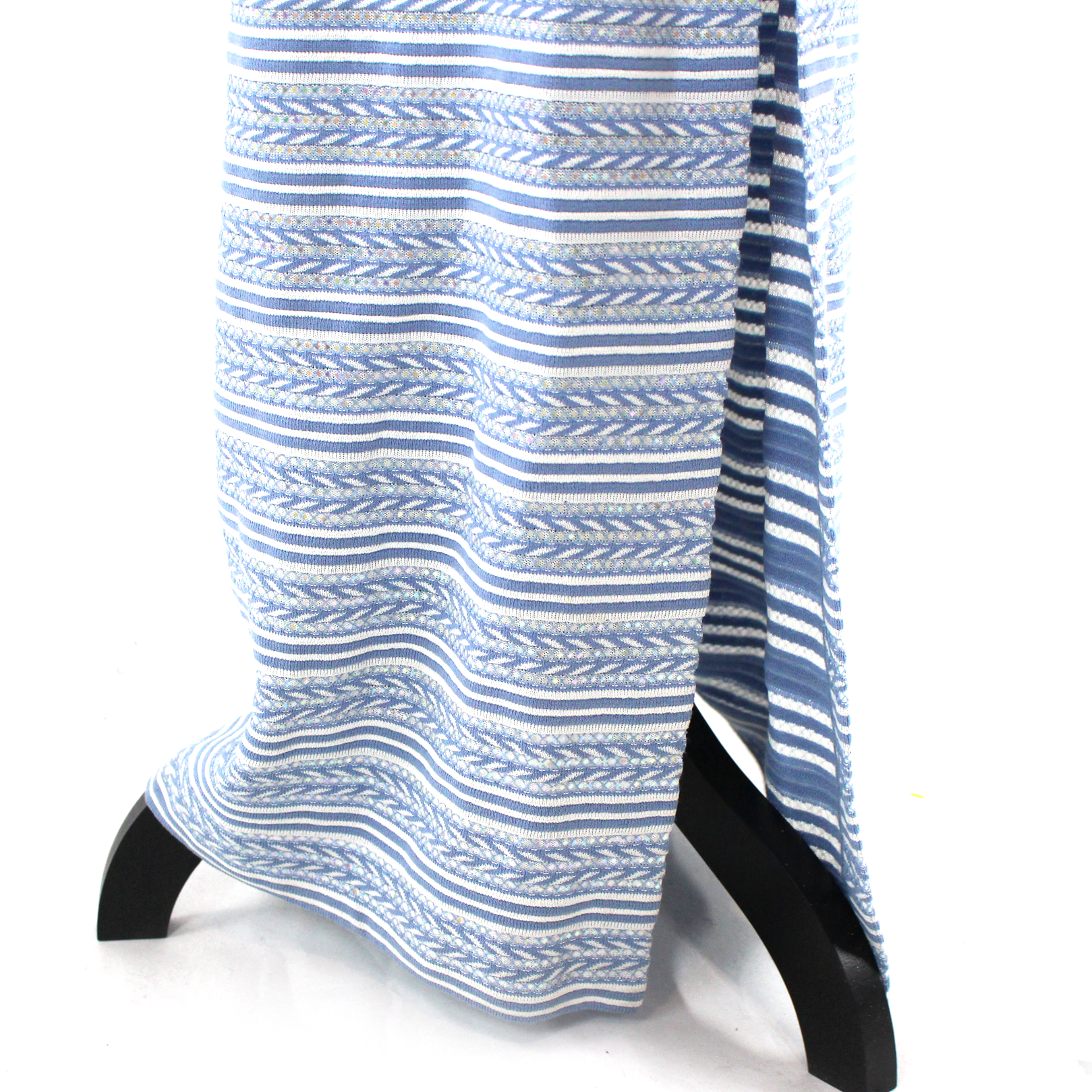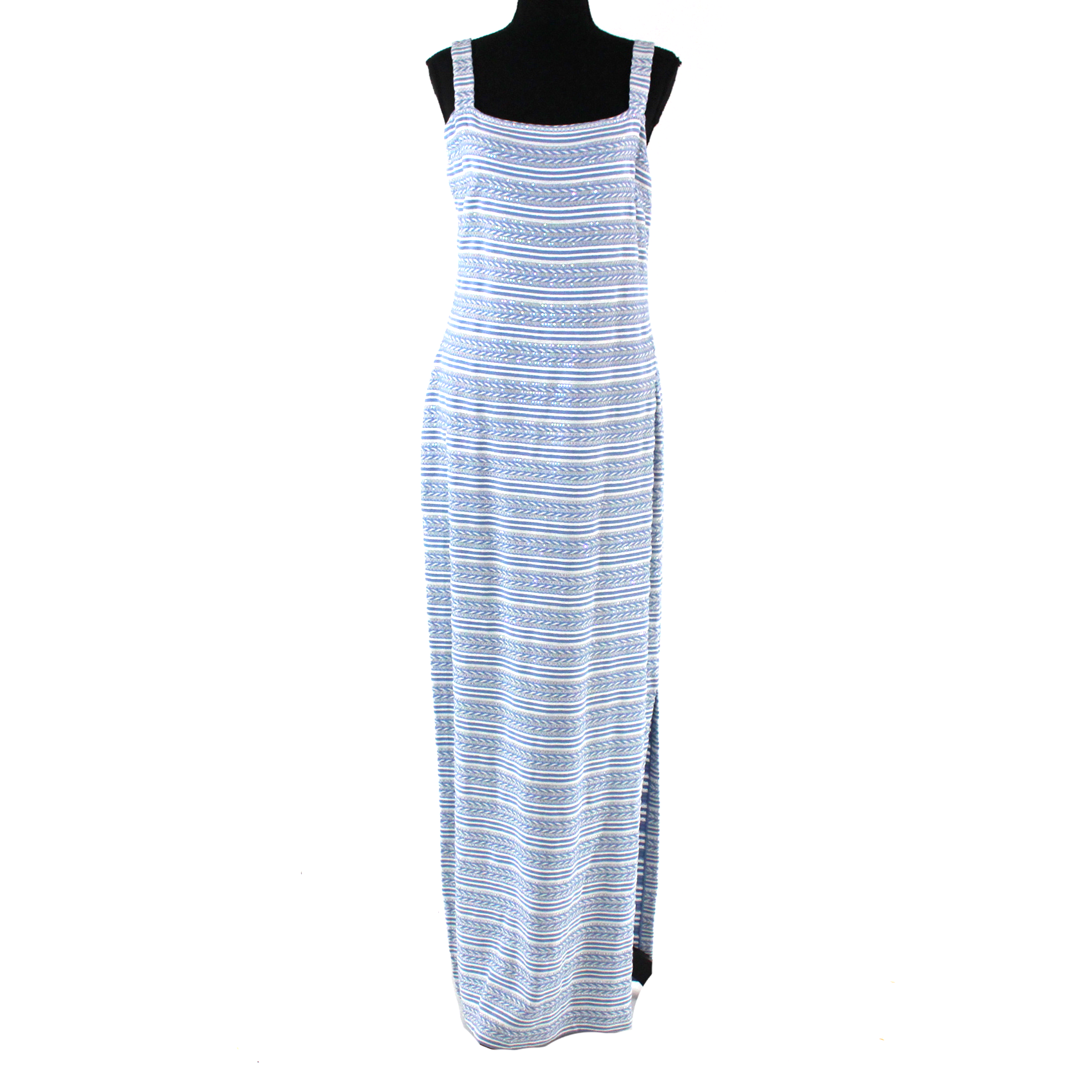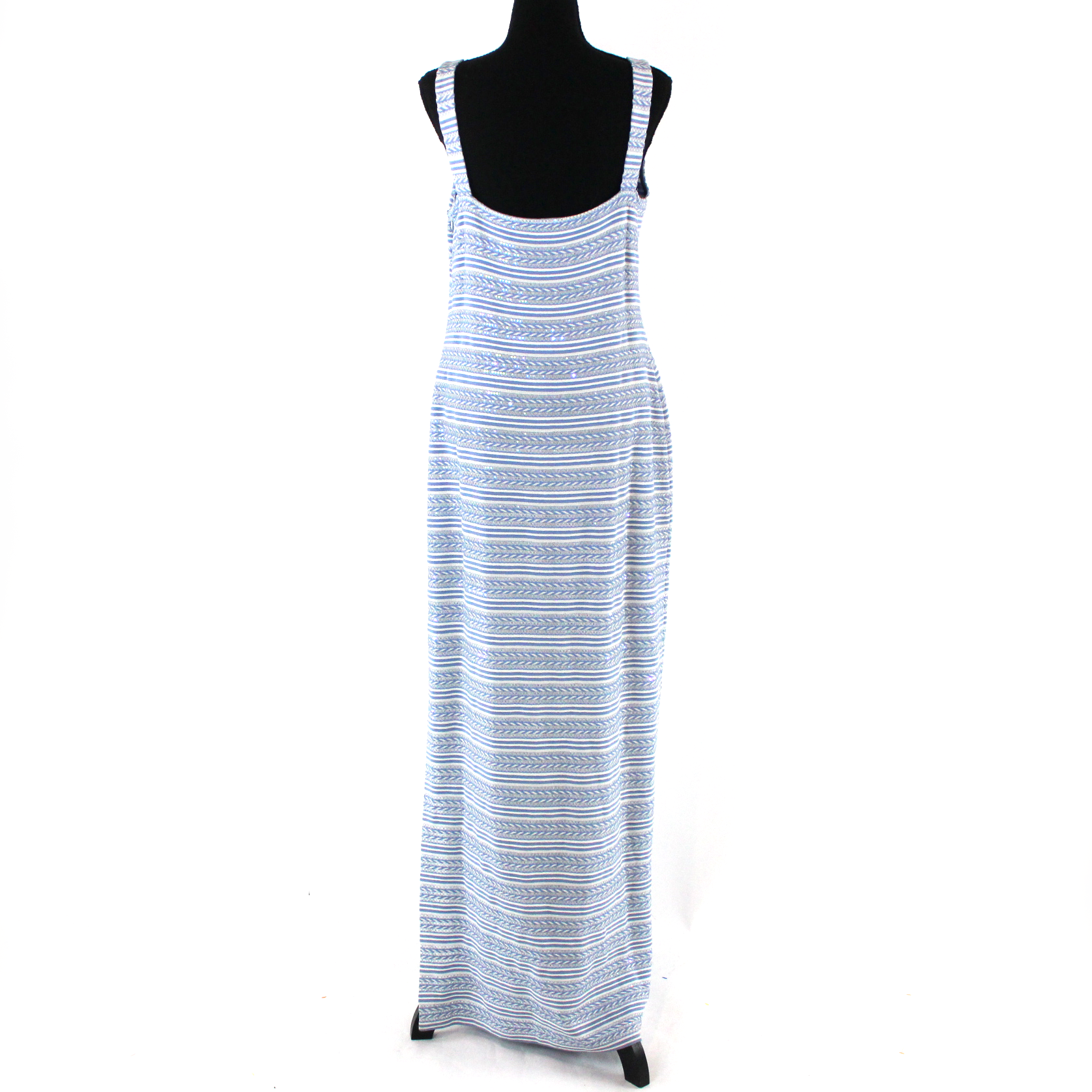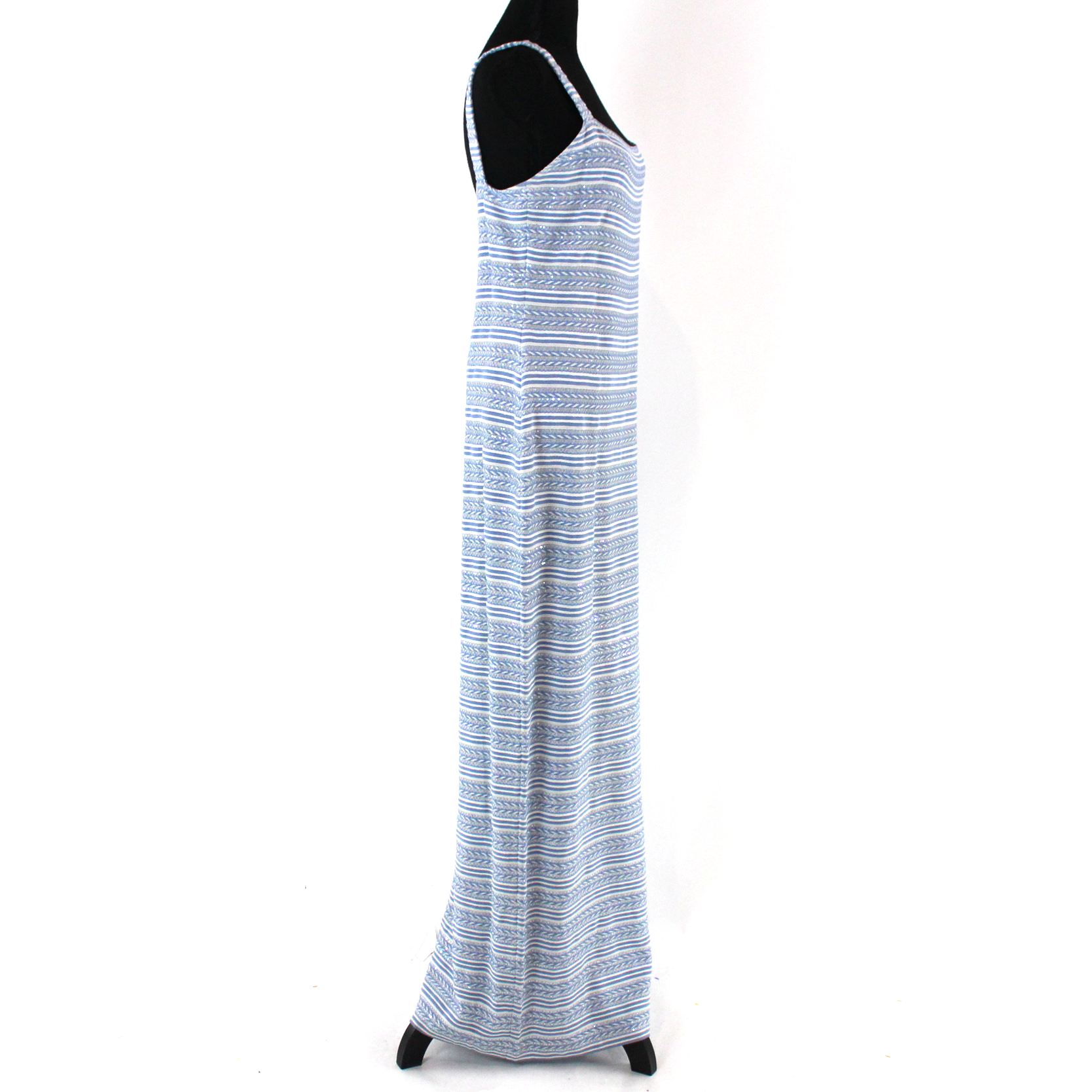 St. John Evening Knit Iridescent Paillette Blue White Stripe Maxi Dress