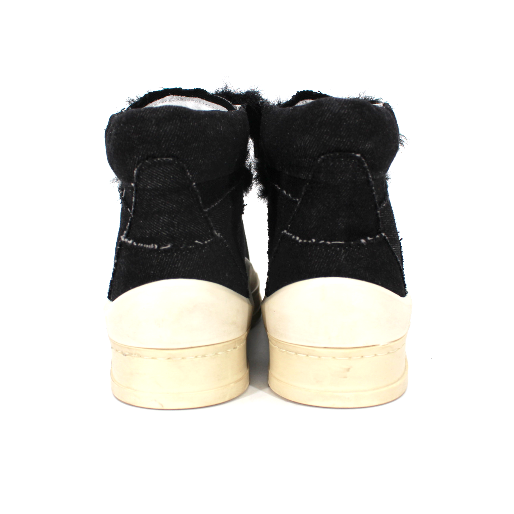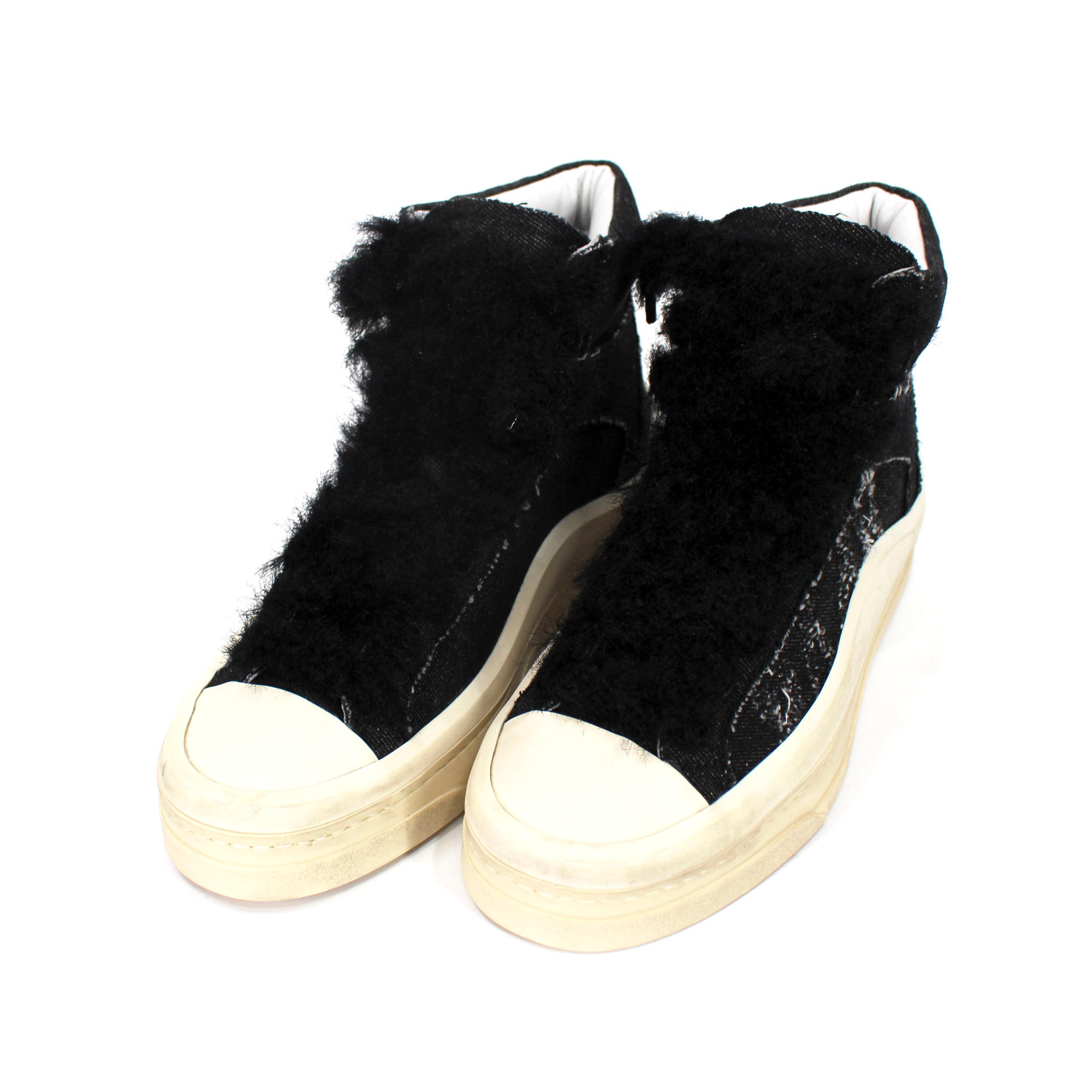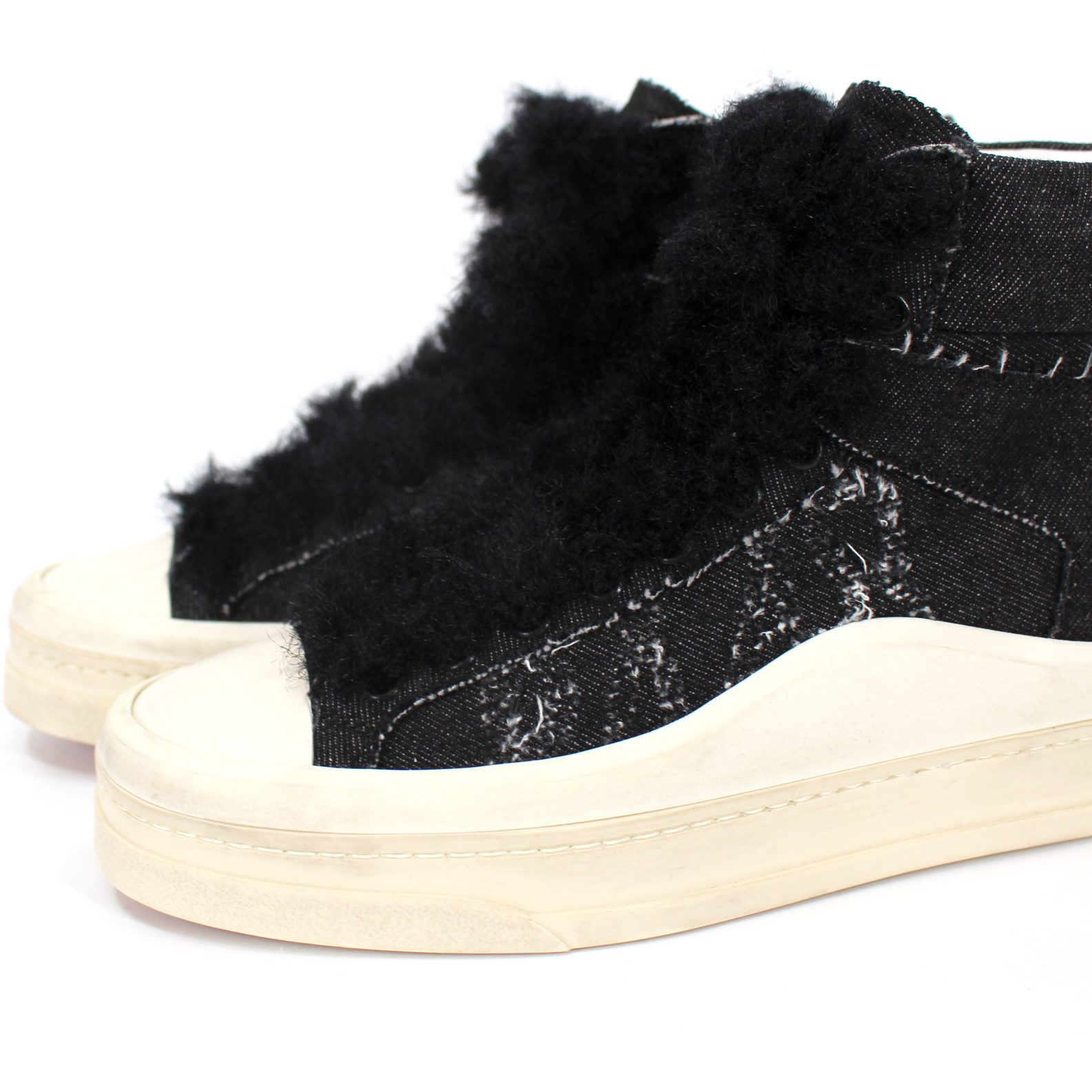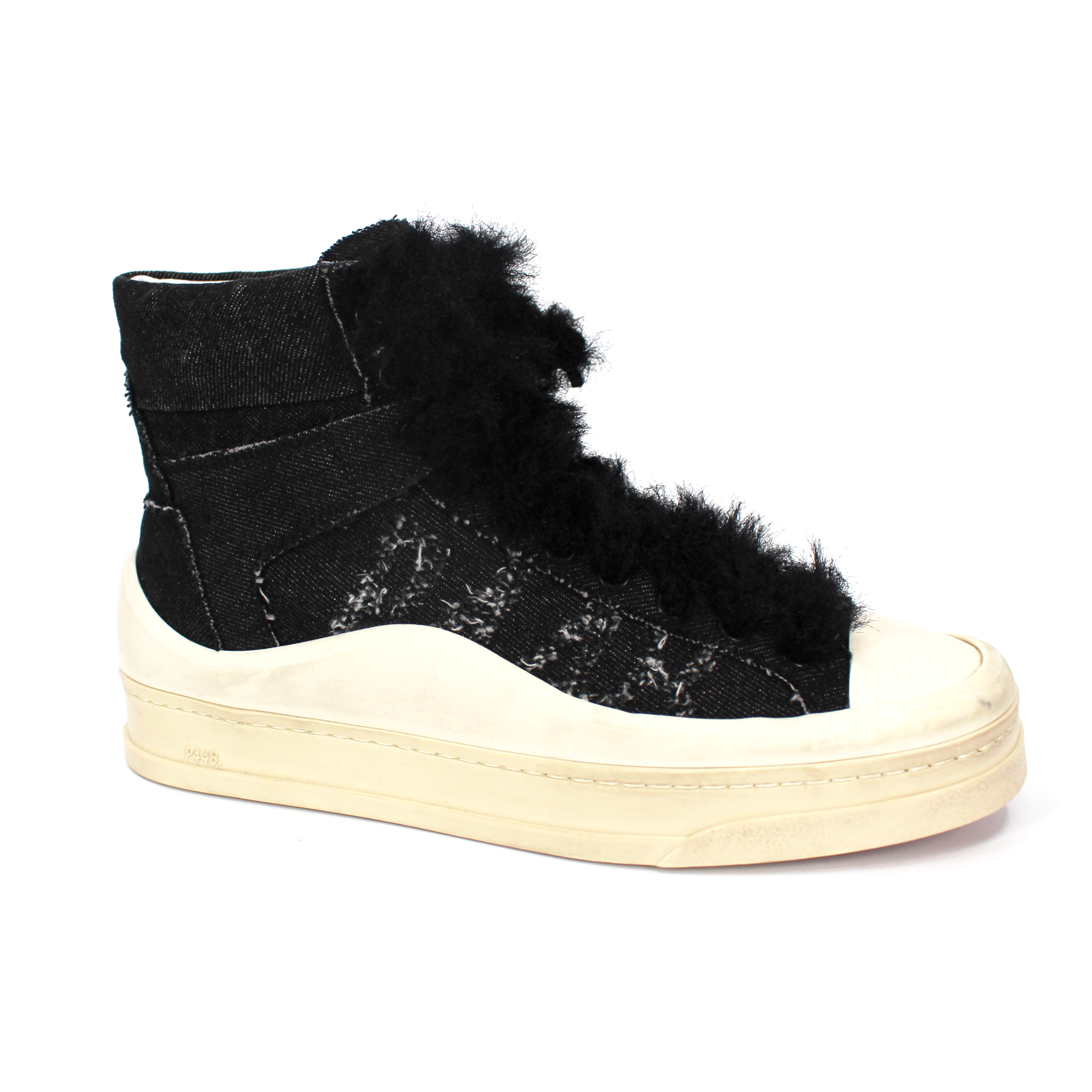 P448 Rail Black Denim Lug Platform High Top Fuzzy Lace Tie Sneakers