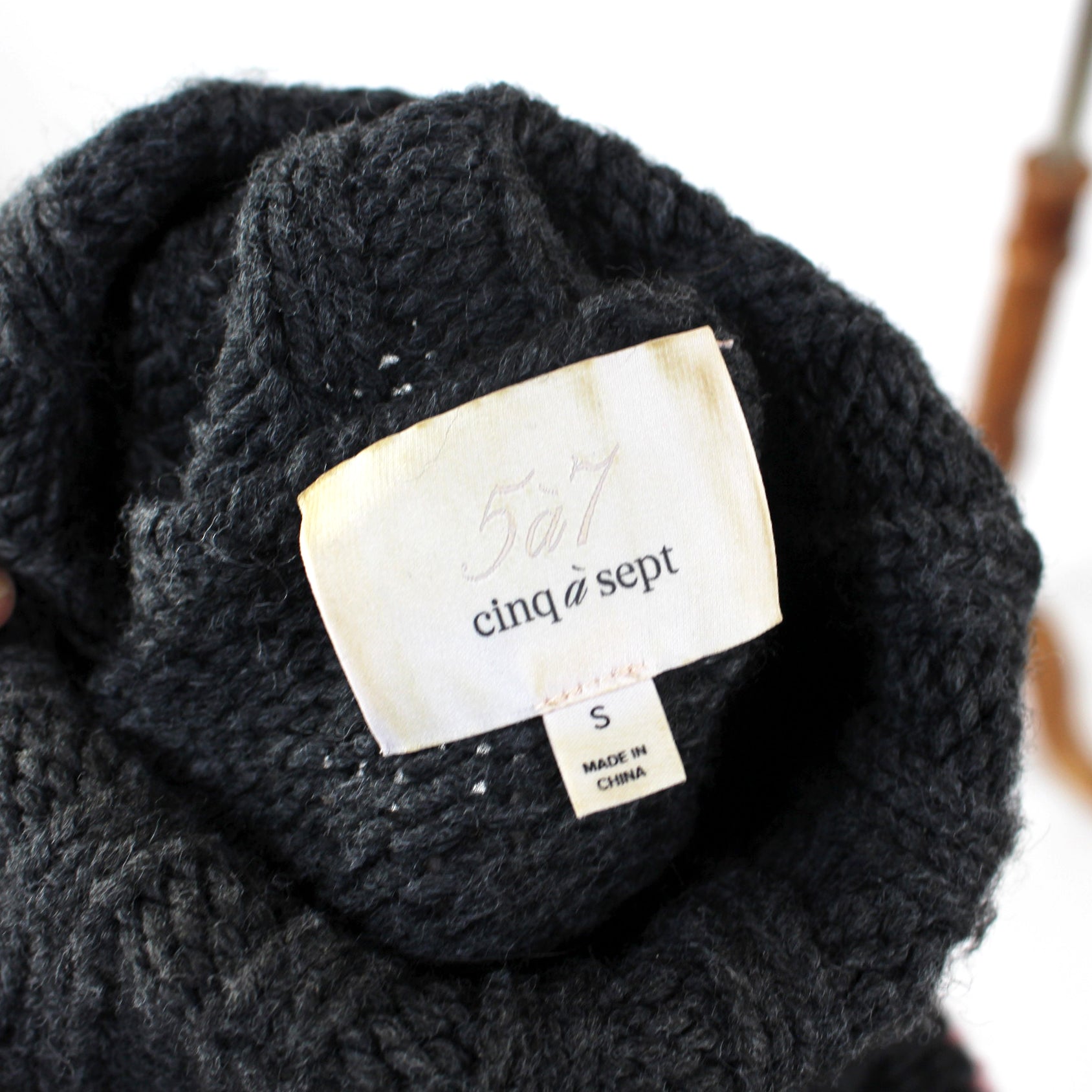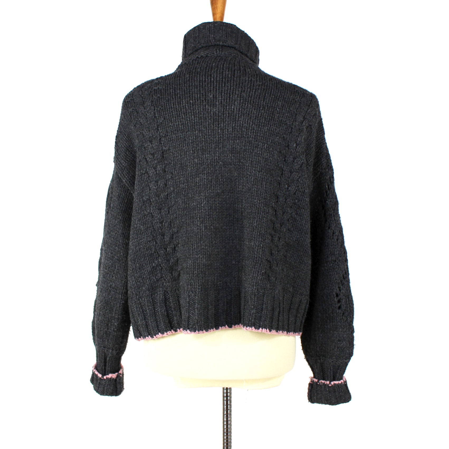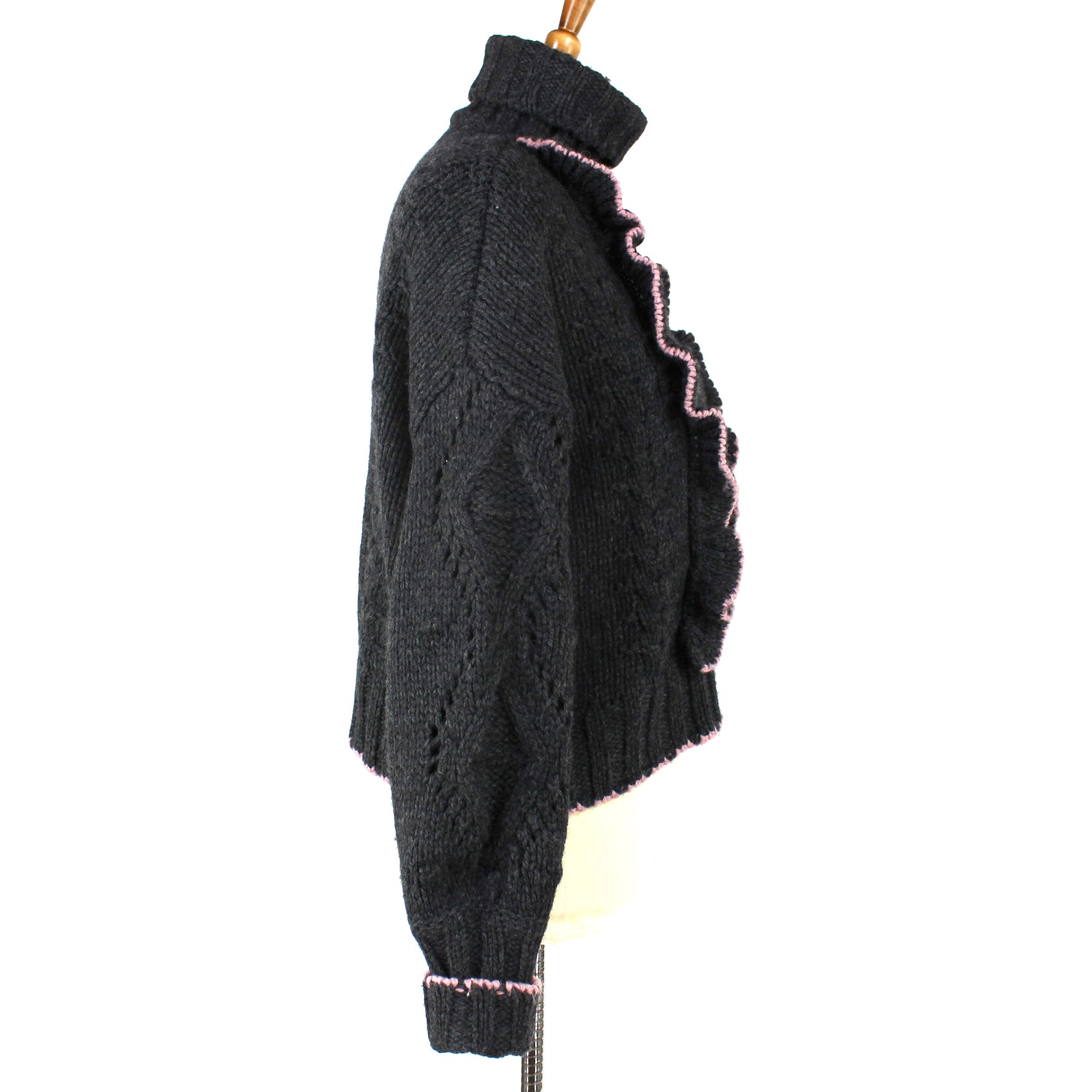 Cinq A Sept Edna Charcoal Pink Trim Ruffle Front Cable Knit Turtleneck Sweater