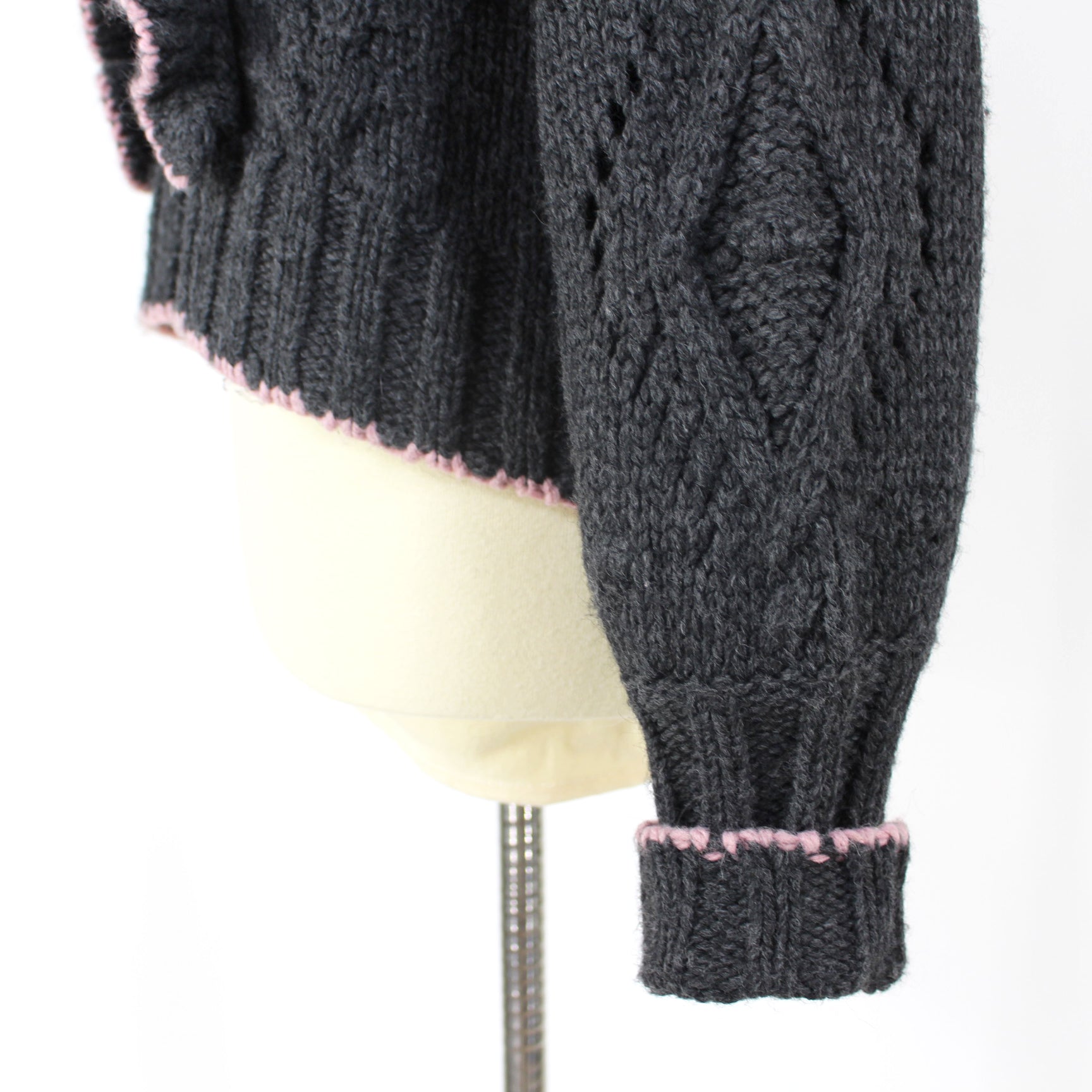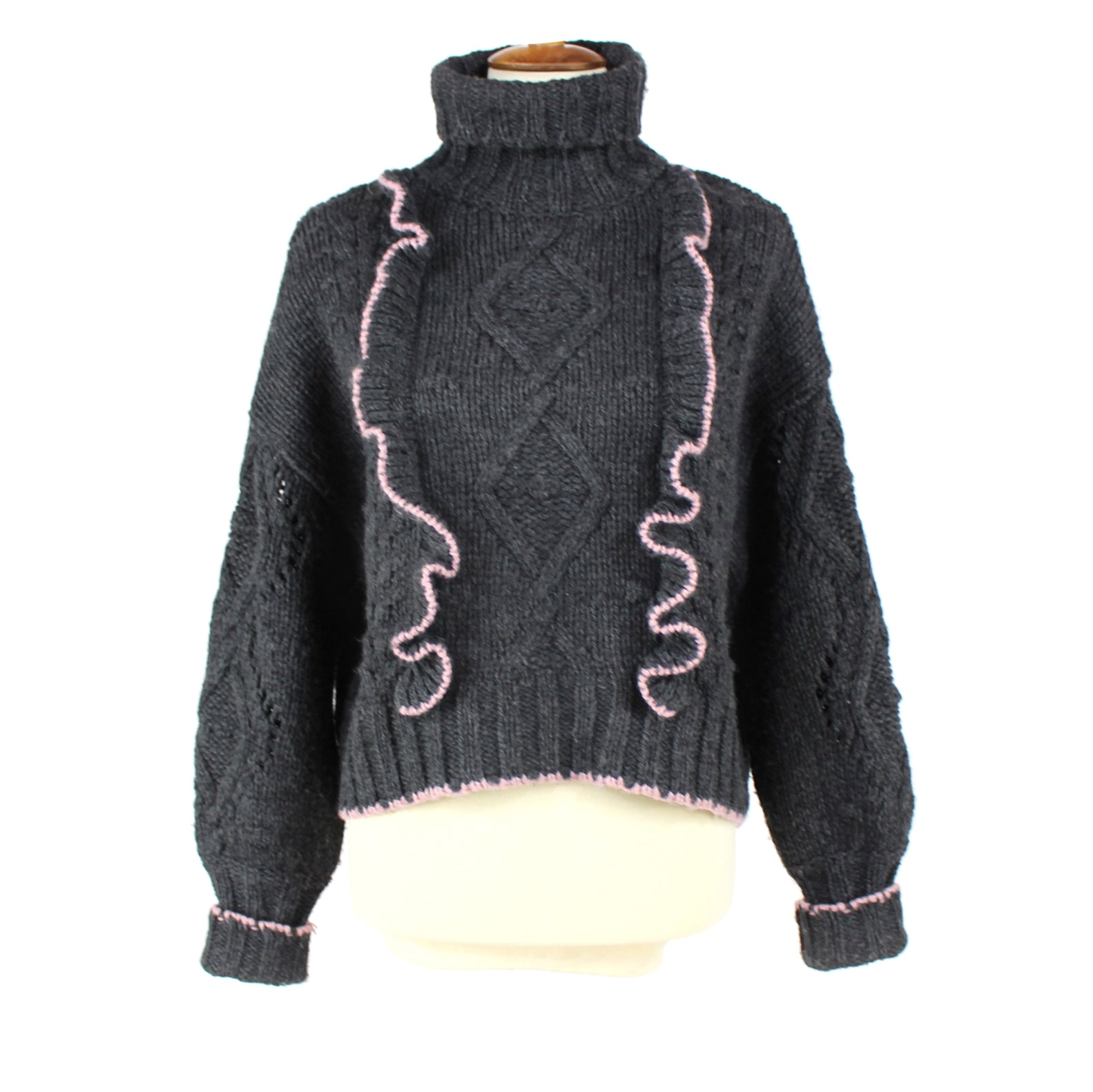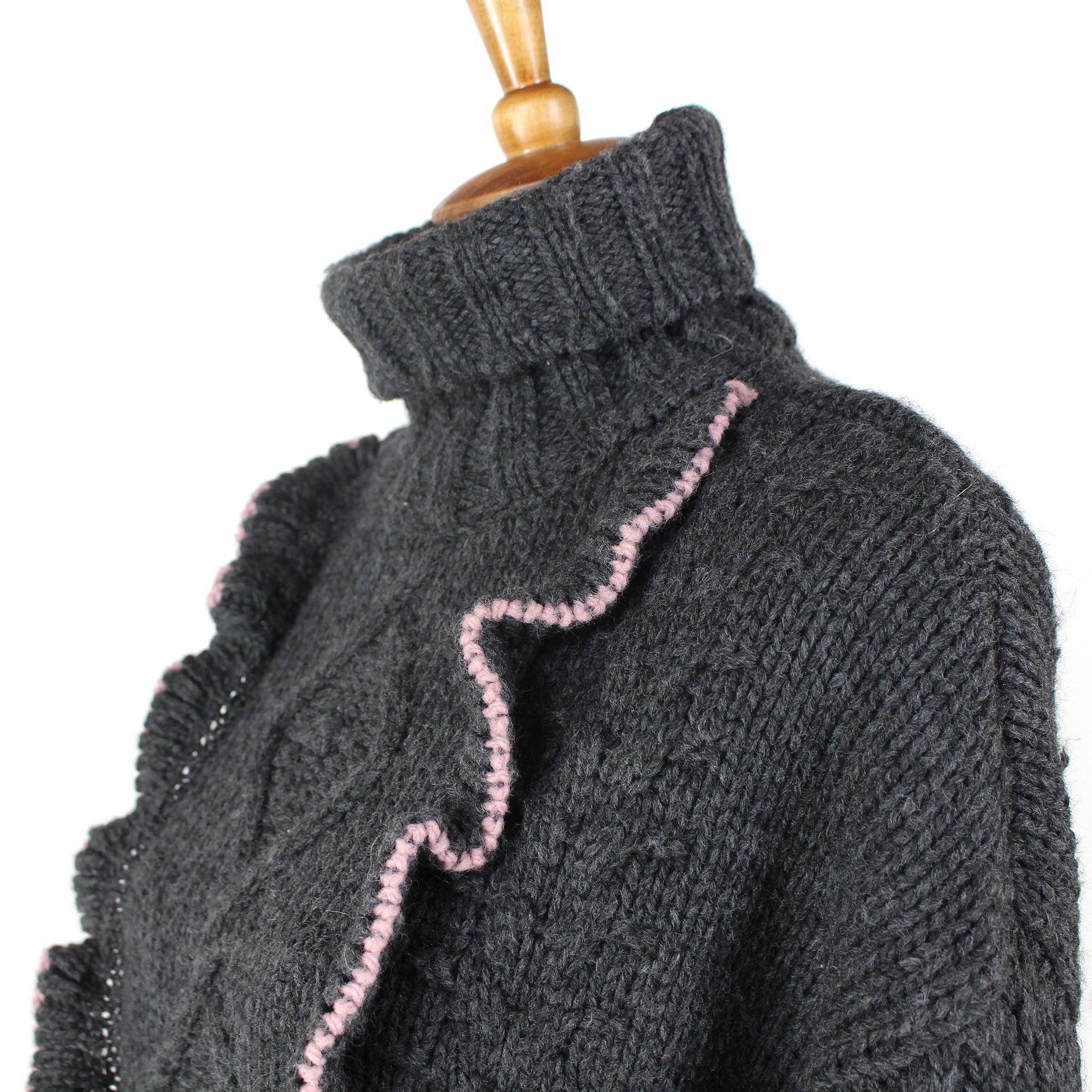 Cinq A Sept Edna Charcoal Pink Trim Ruffle Front Cable Knit Turtleneck Sweater