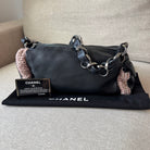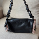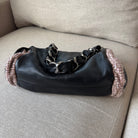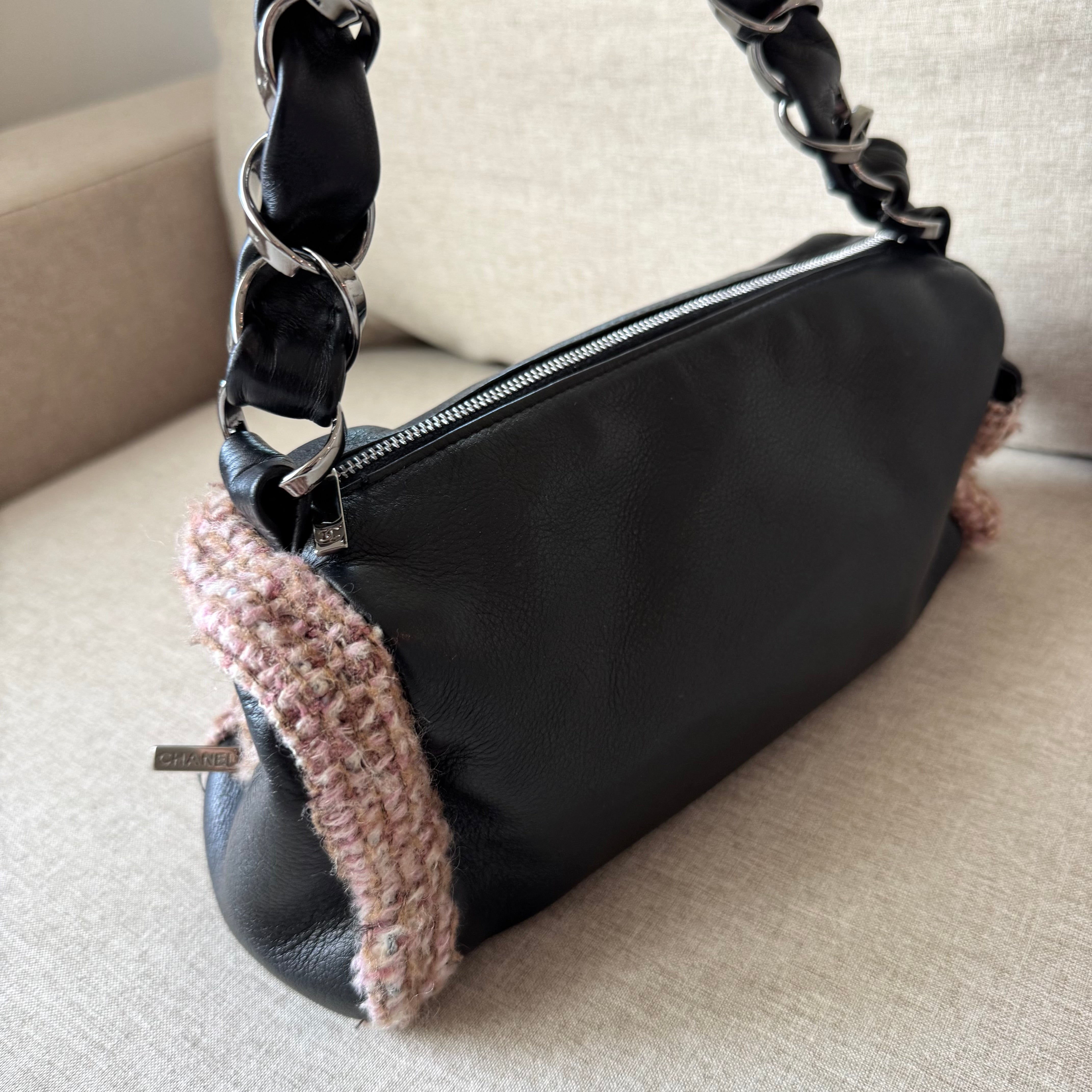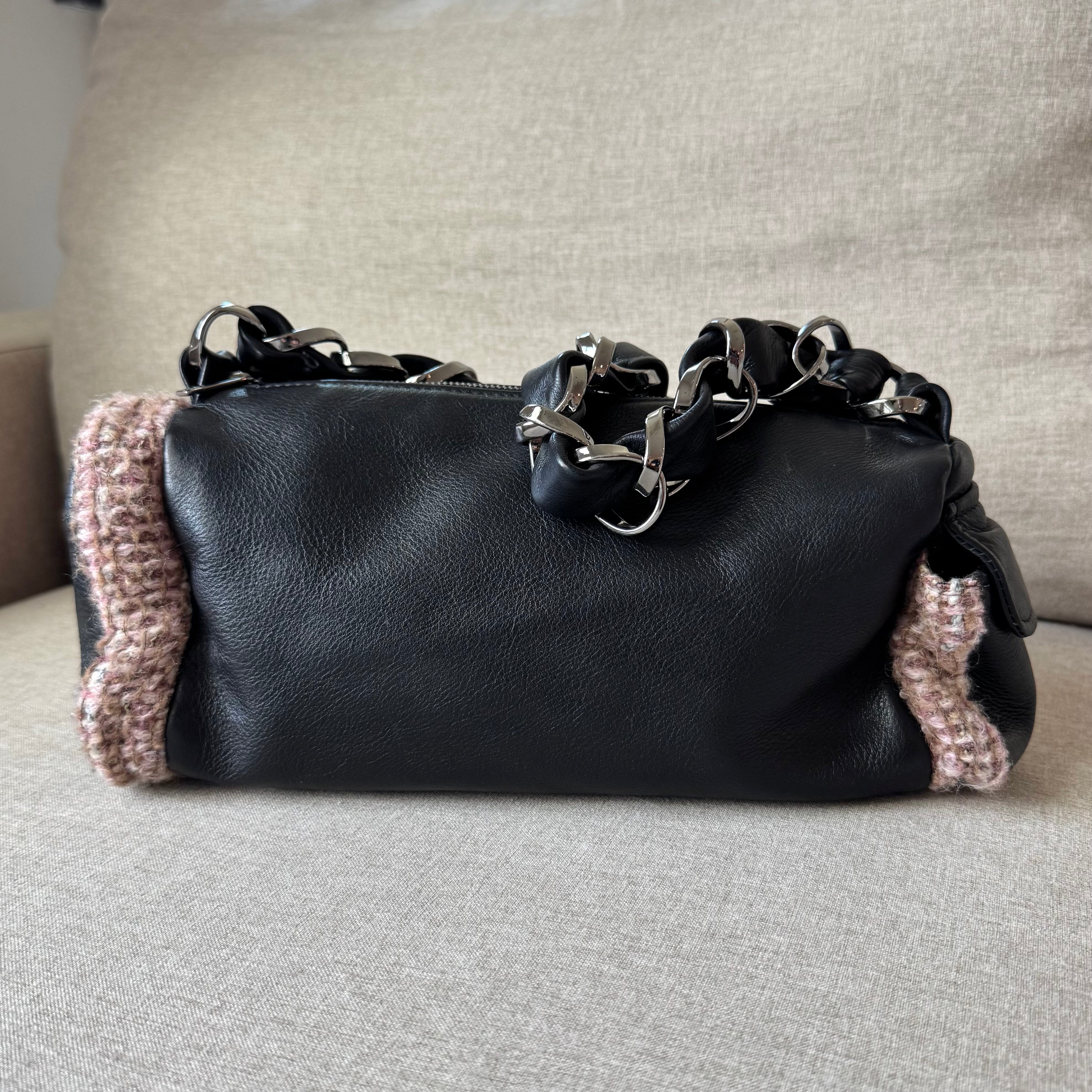 Chanel Black Leather Pink Brown Tweed Trim Chainlink Barrel Hobo Shoulder Bag
