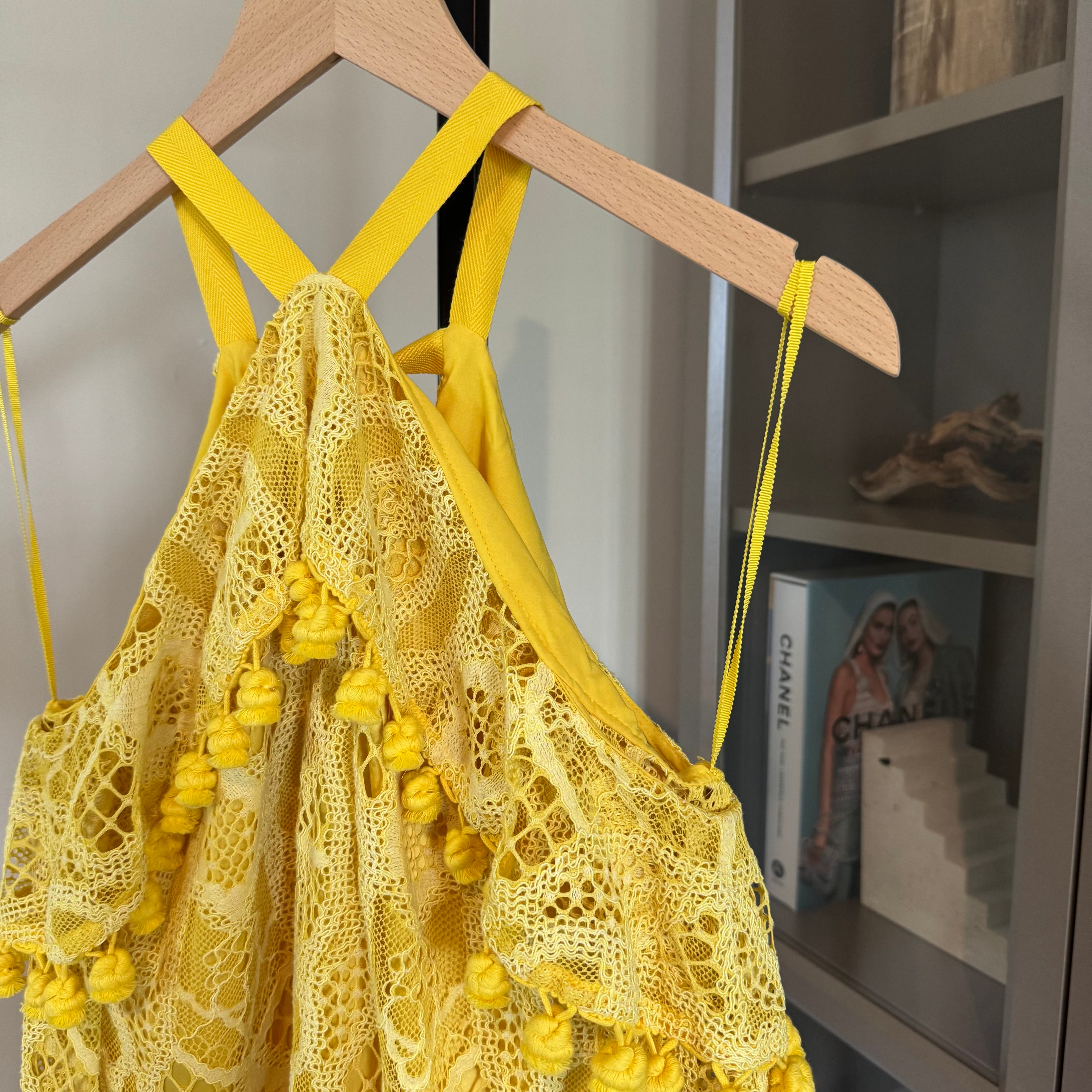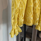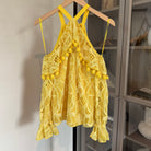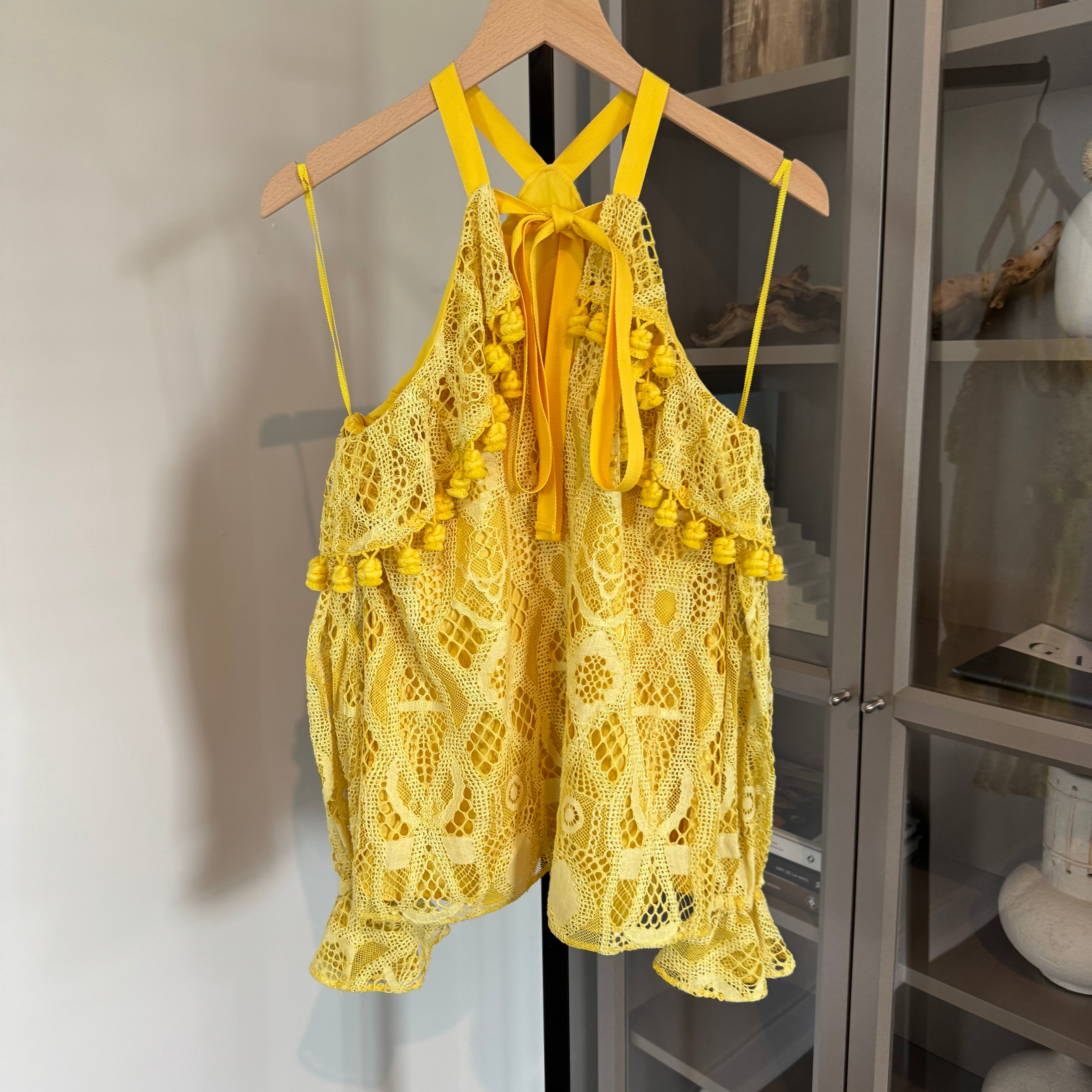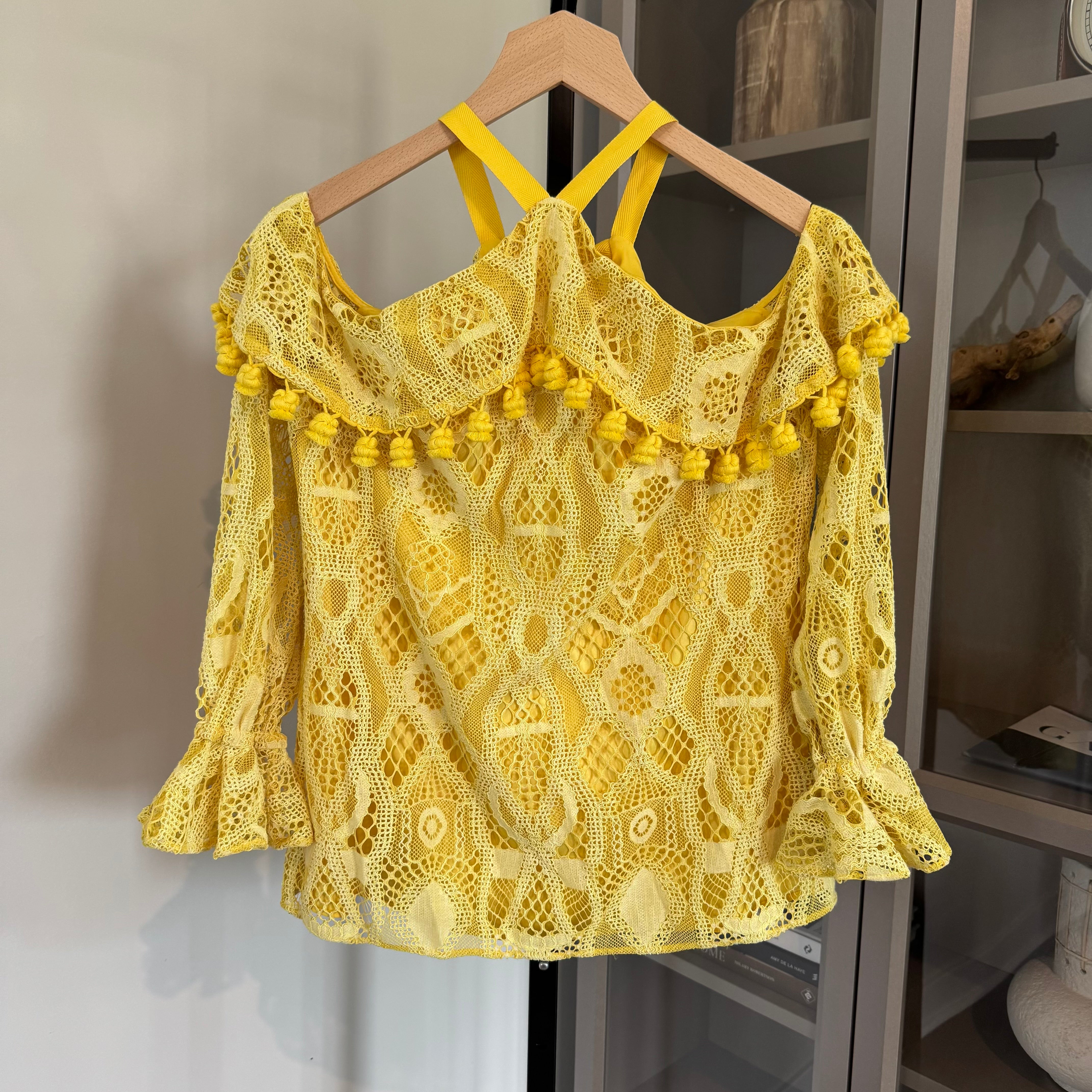 Alexis Adriana Yellow Lace Overlay Off Shoulder Pom Pom Detail Top