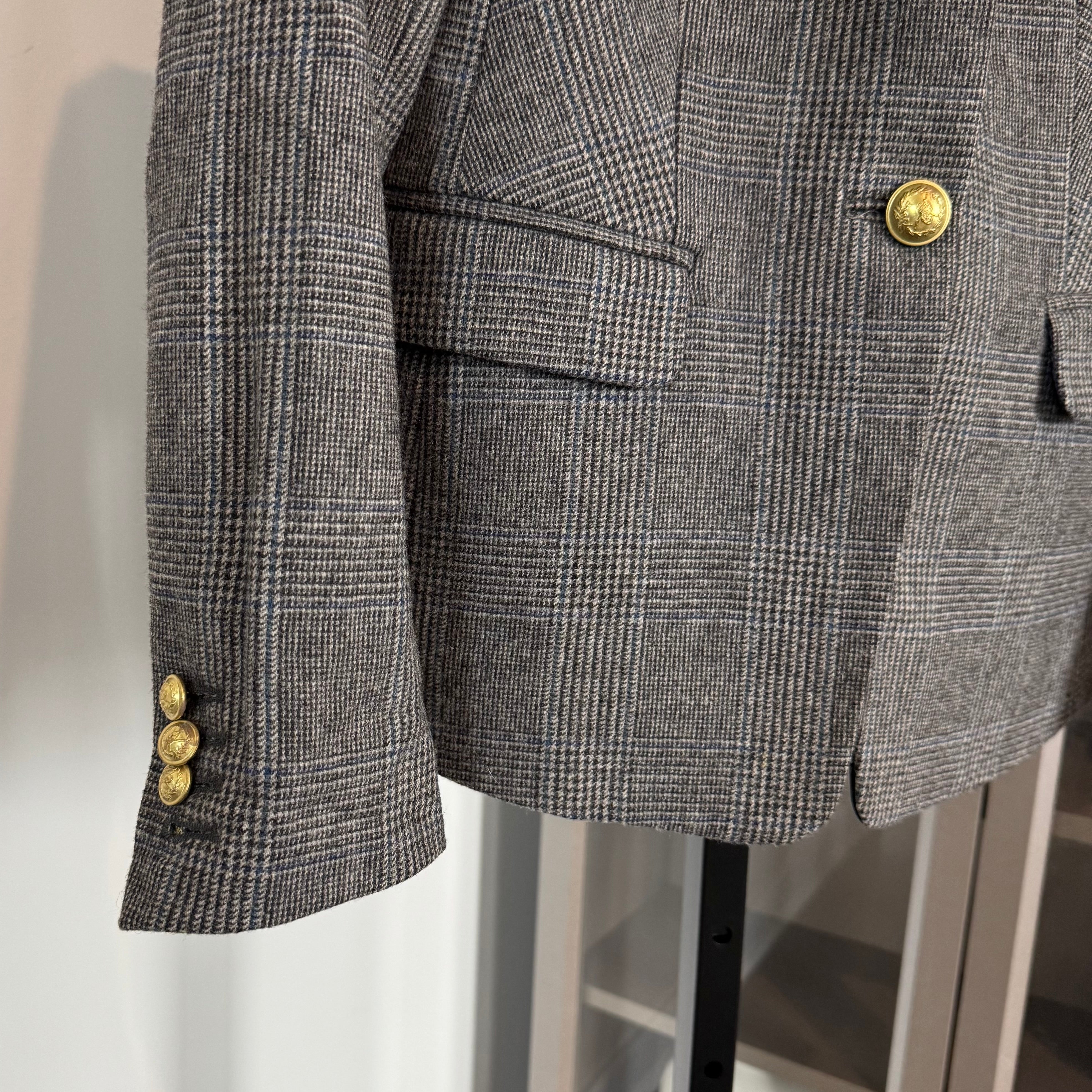 - Single breasted with a gold tone emblem wreath button closure