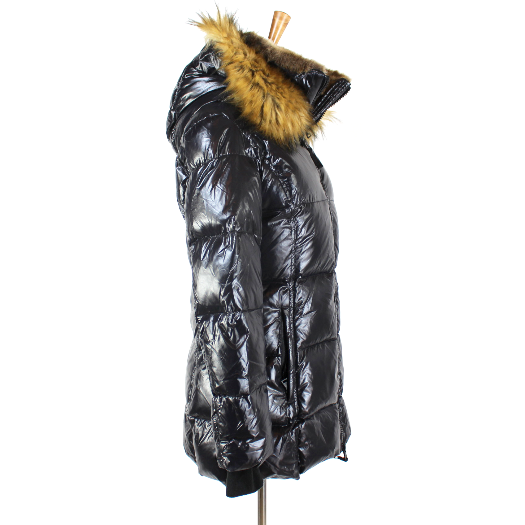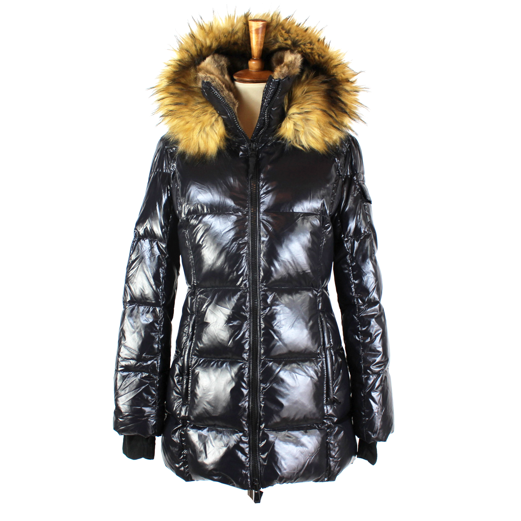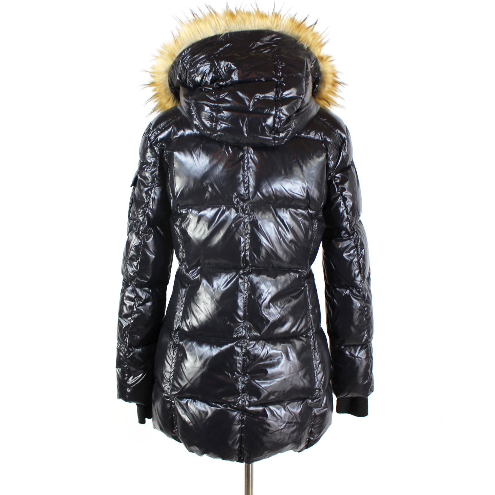 S13 Kylie Jet Black Glossy Down Puffer Faux Fur Trimmed Hooded Jacket