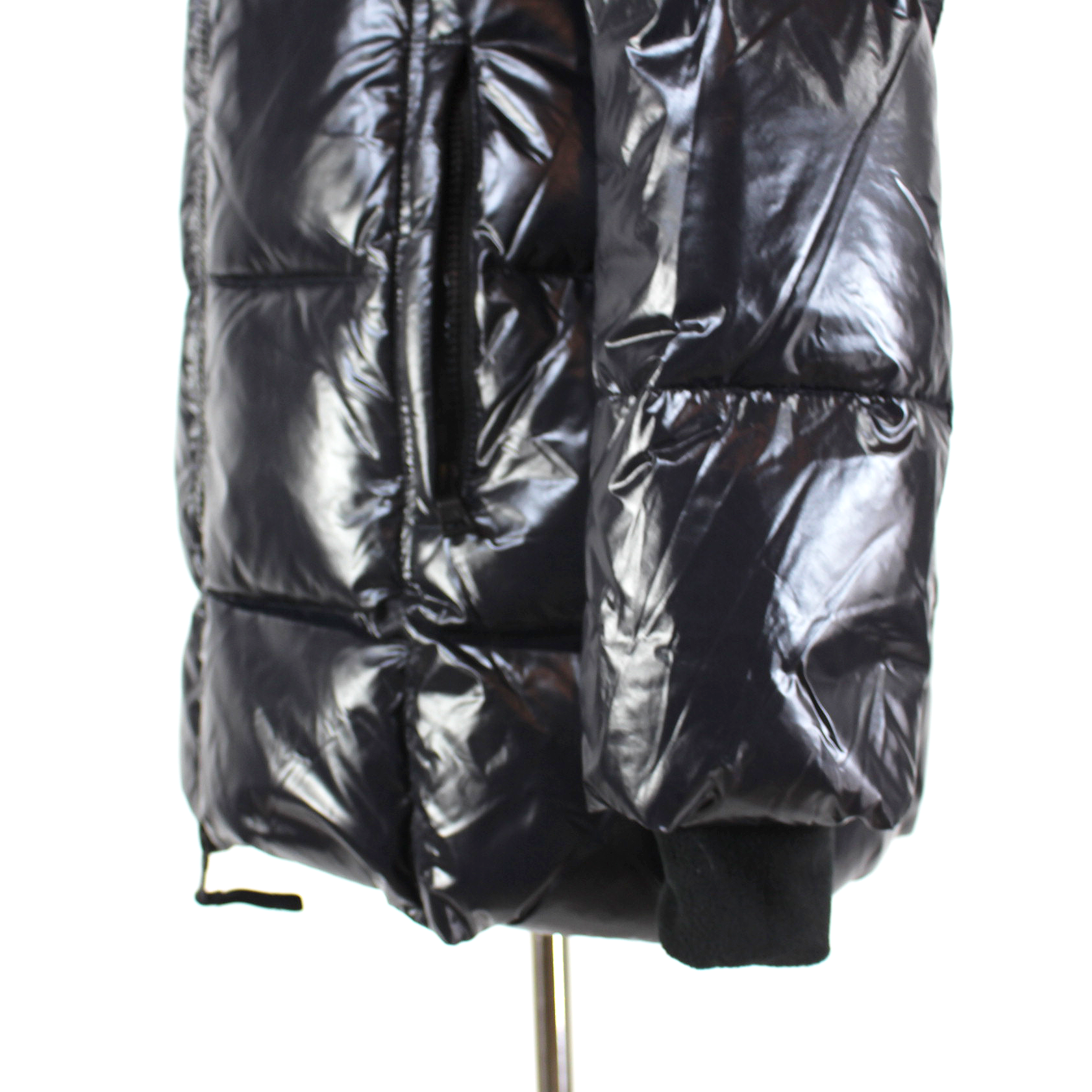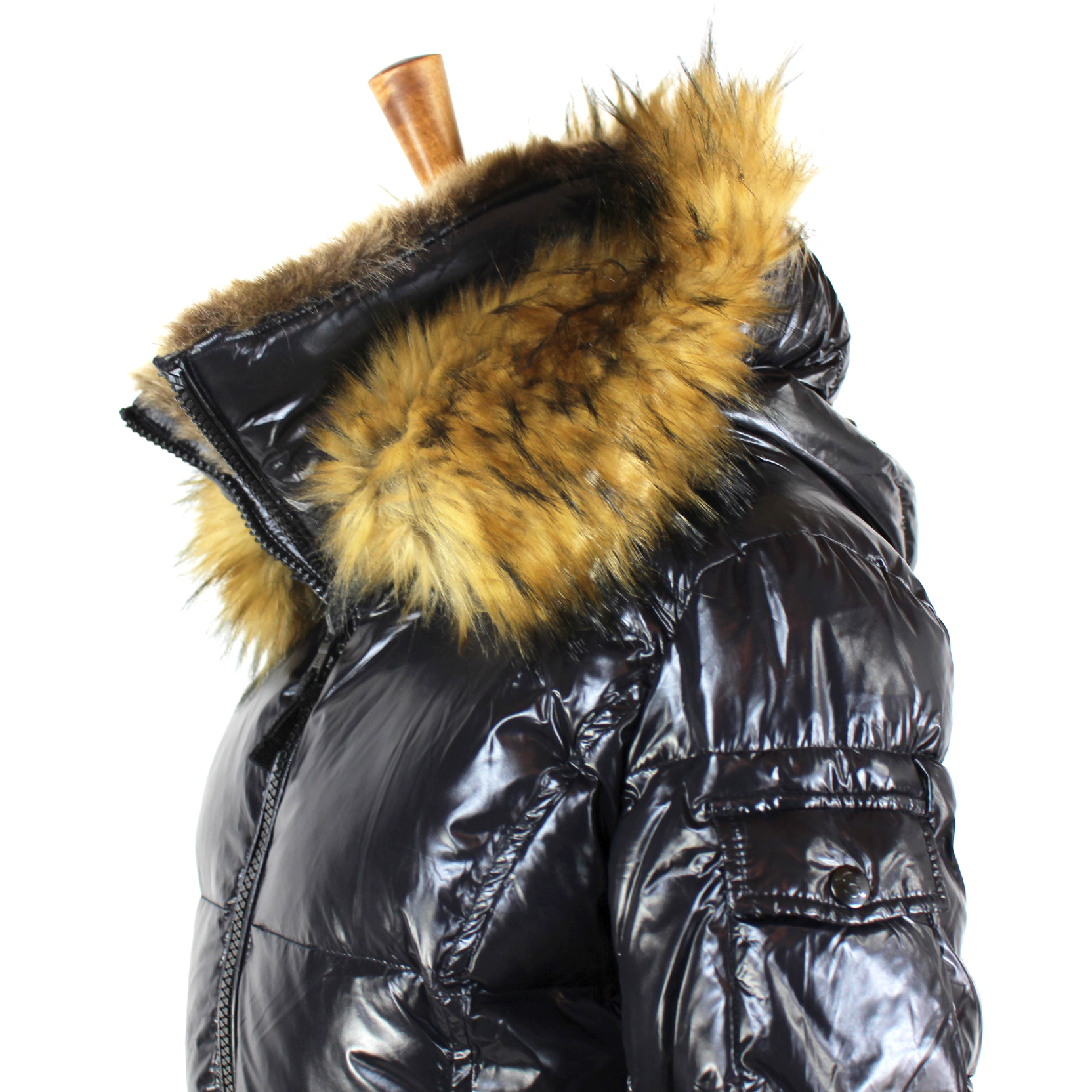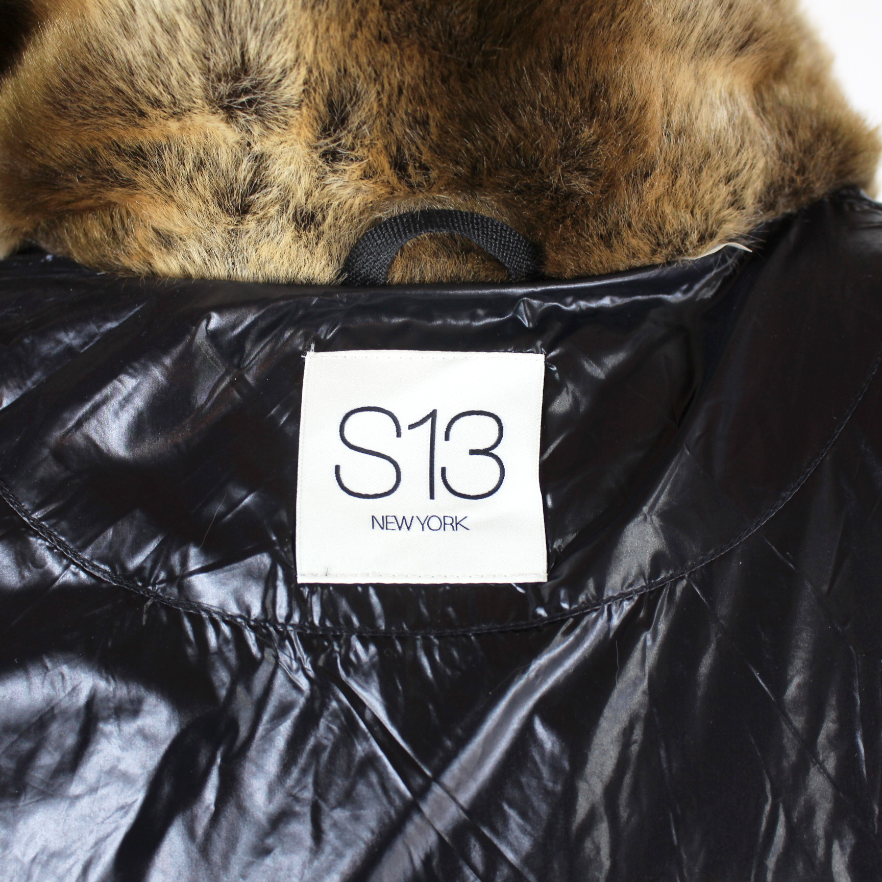 S13 Kylie Jet Black Glossy Down Puffer Faux Fur Trimmed Hooded Jacket
