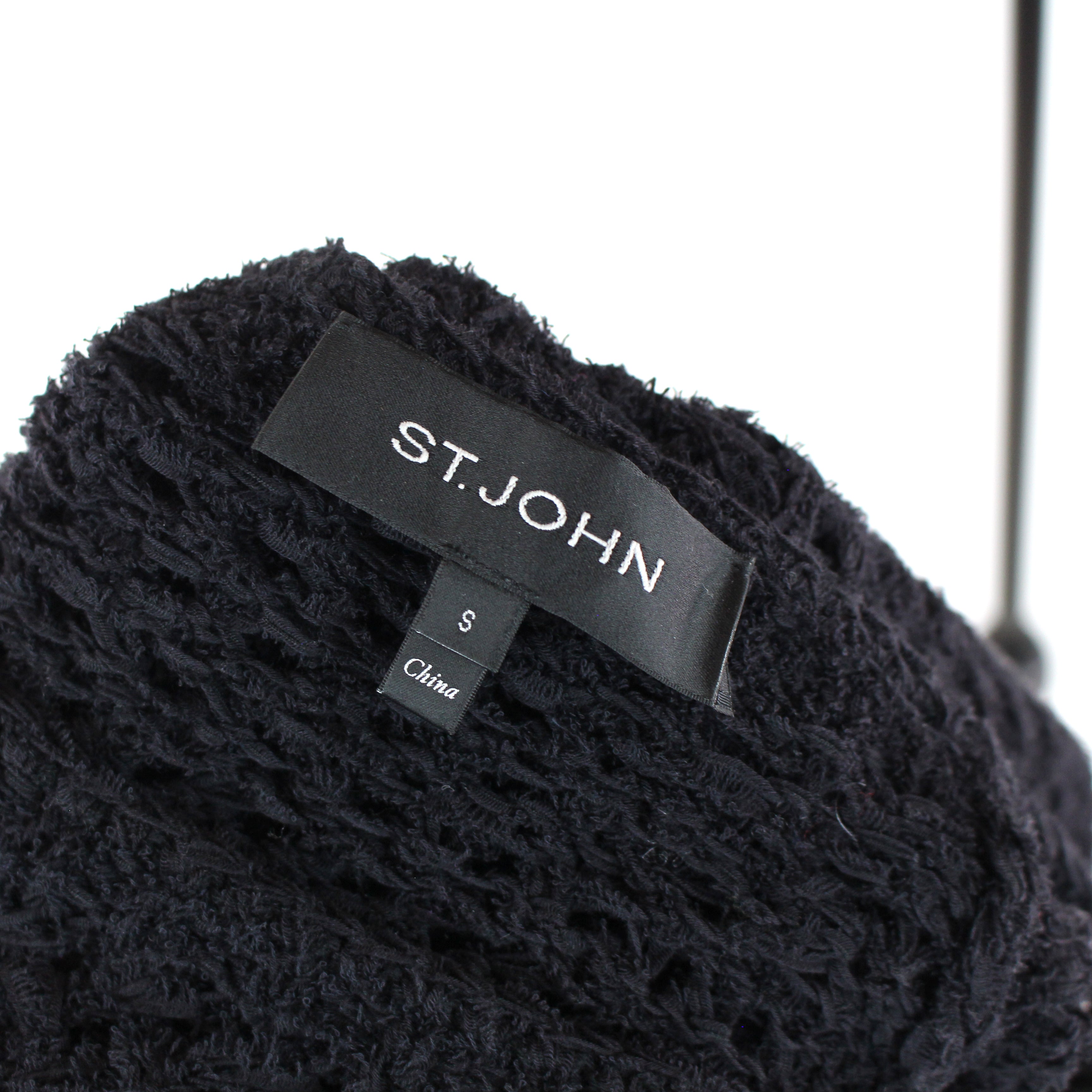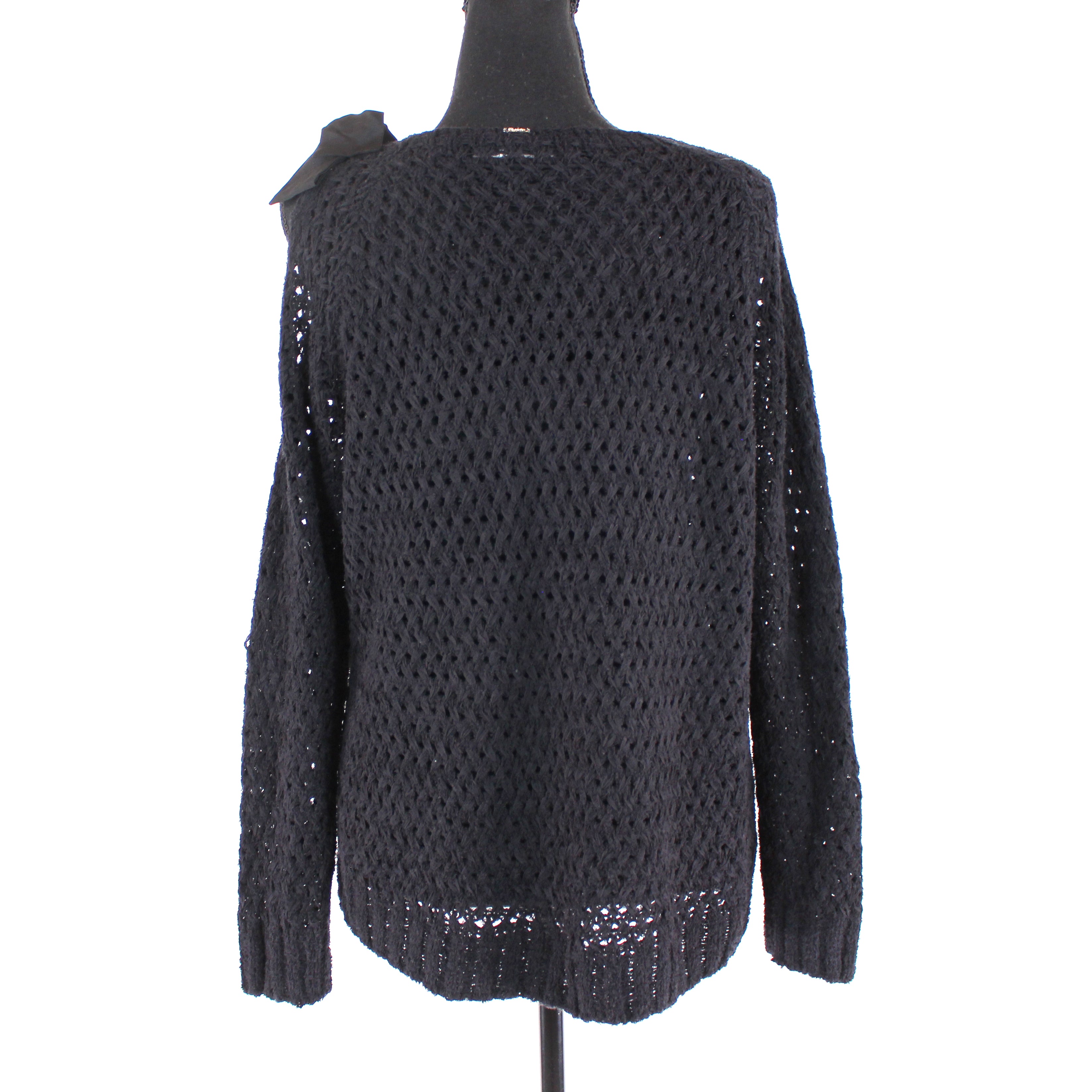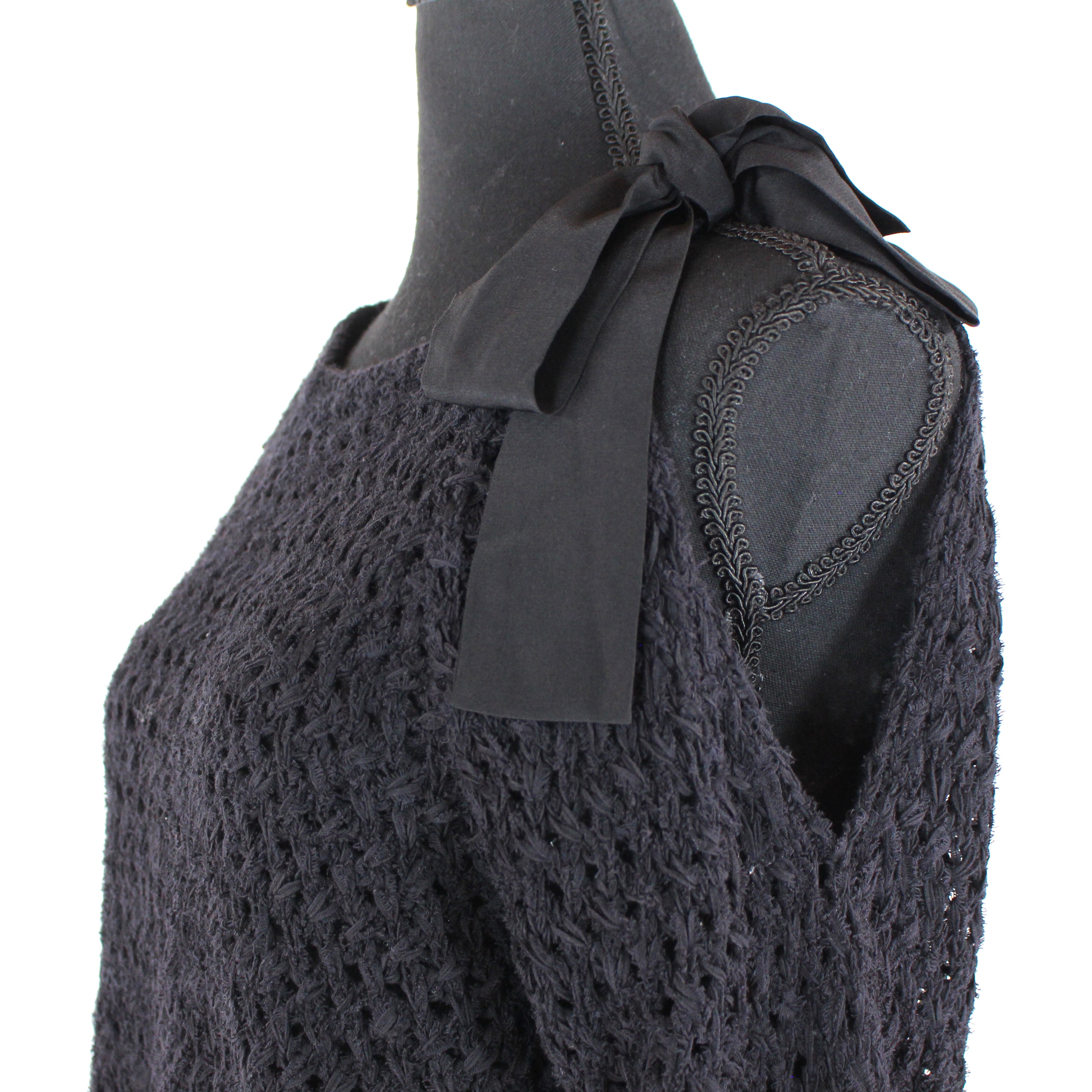 St. John Black Open Crochet Knit Silk Bow Off The Shoulder Sweater