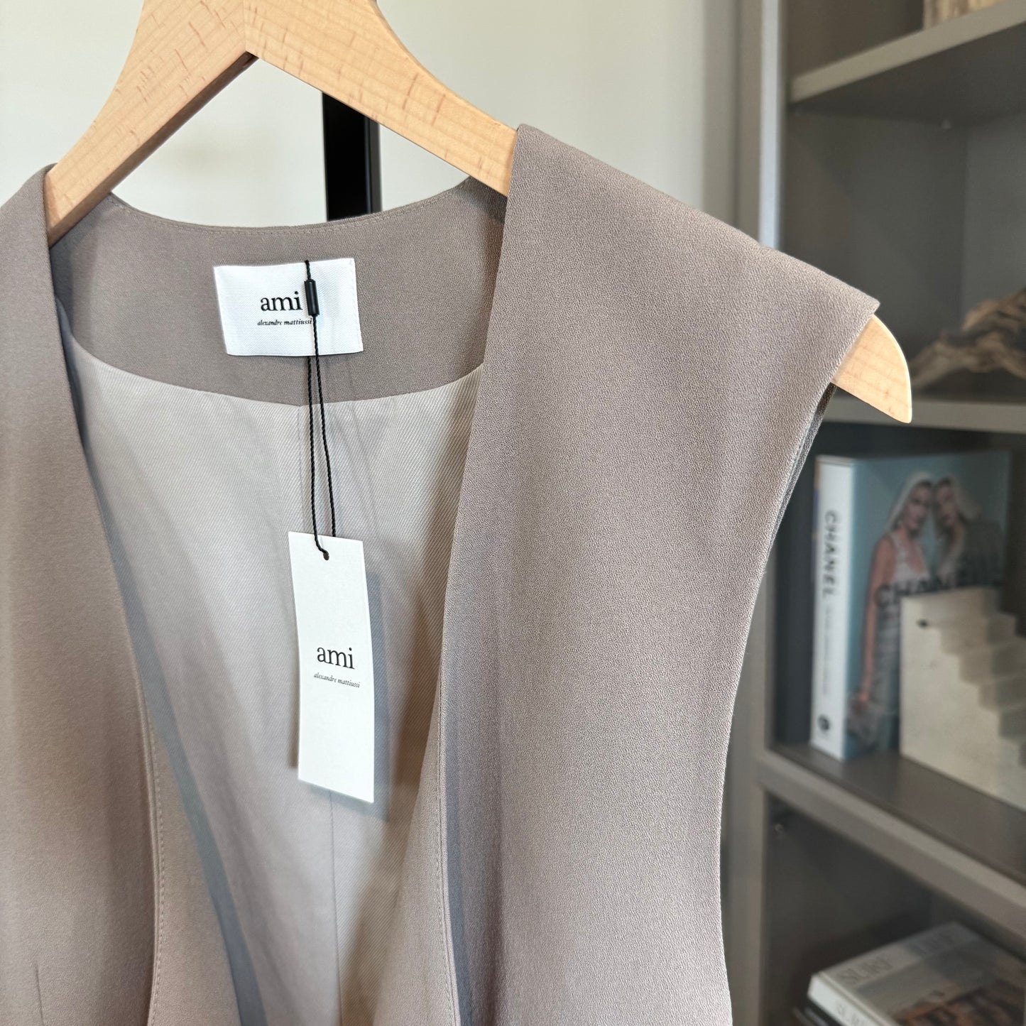 AMI Paris Clair Taupe Brown Virgin Wool Crepe Sleeveless Open Front Vest