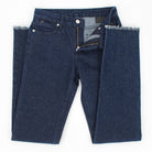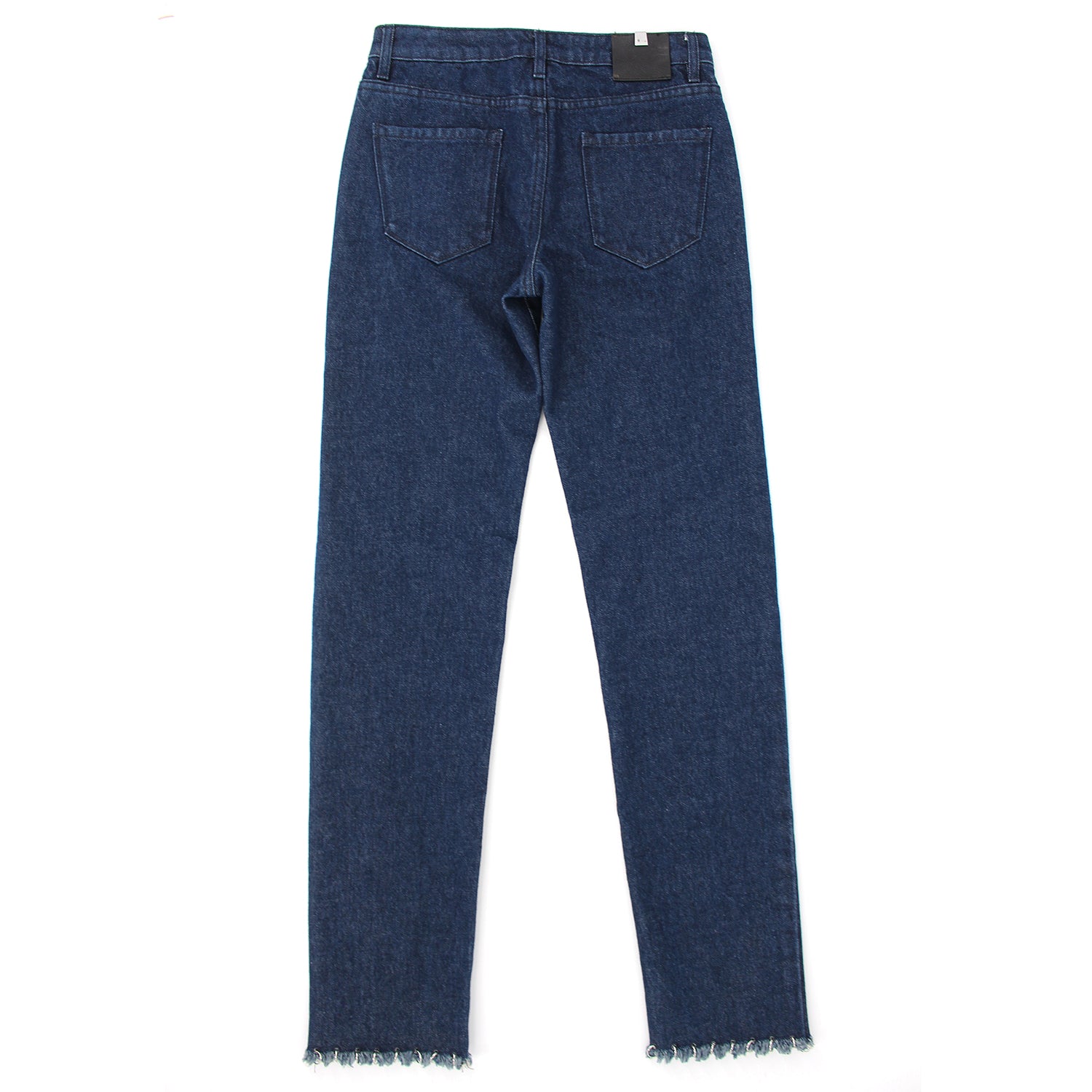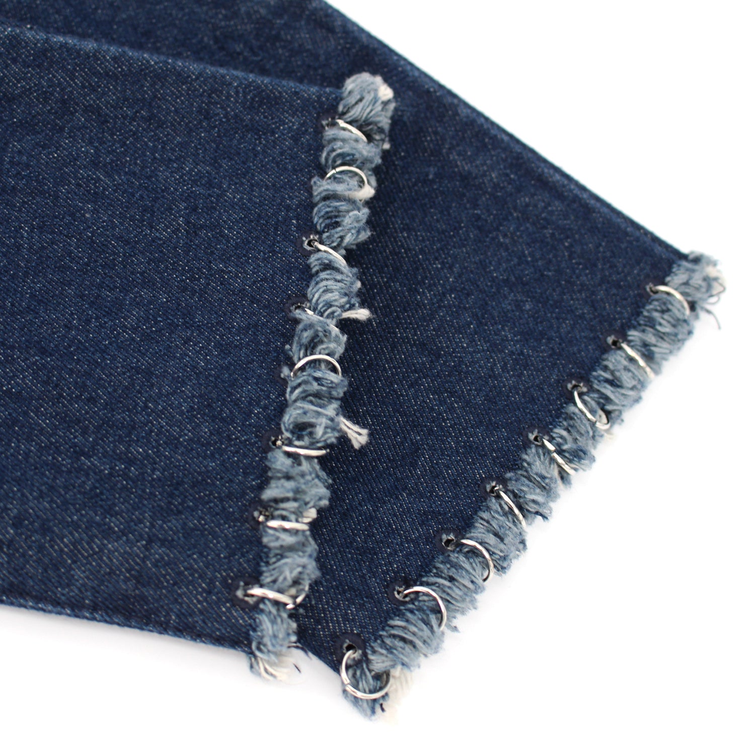A little twist on your regular blue jeans. Cotton stretch denim embellished with a sequence of metallic rings at the fringed hem.