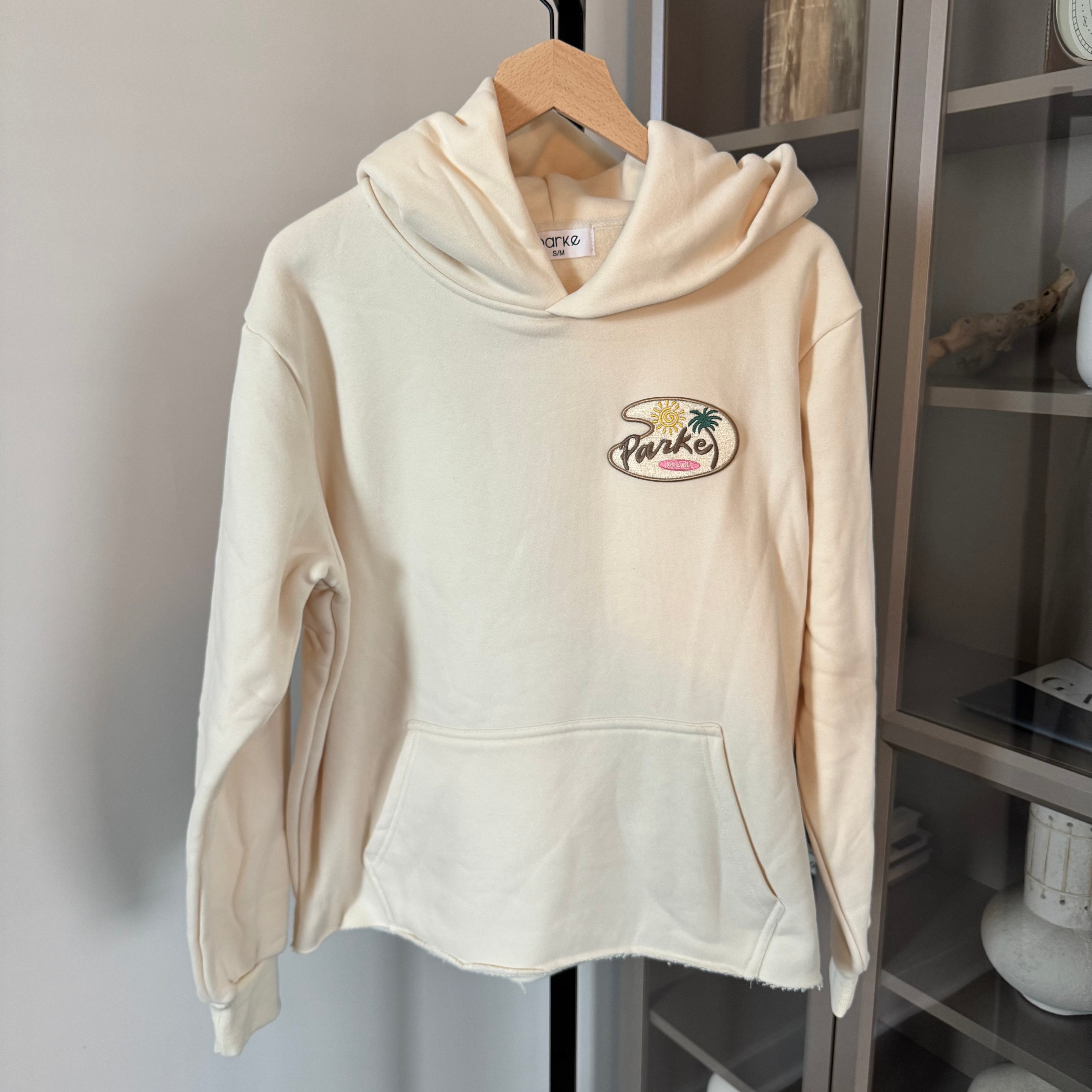 Parke The Bay Side Hoodie Cream Pullover Graphic Patch Sweatshirt