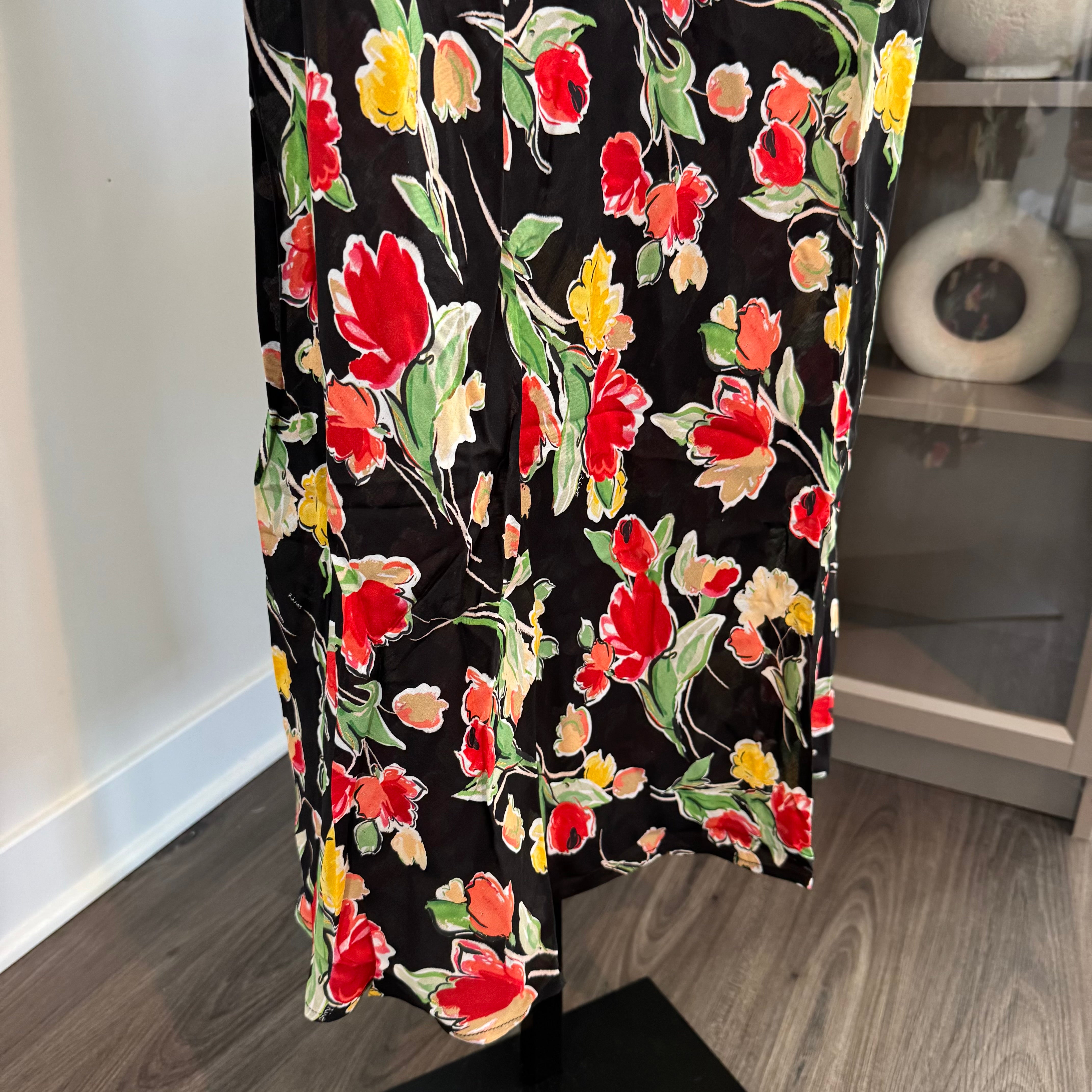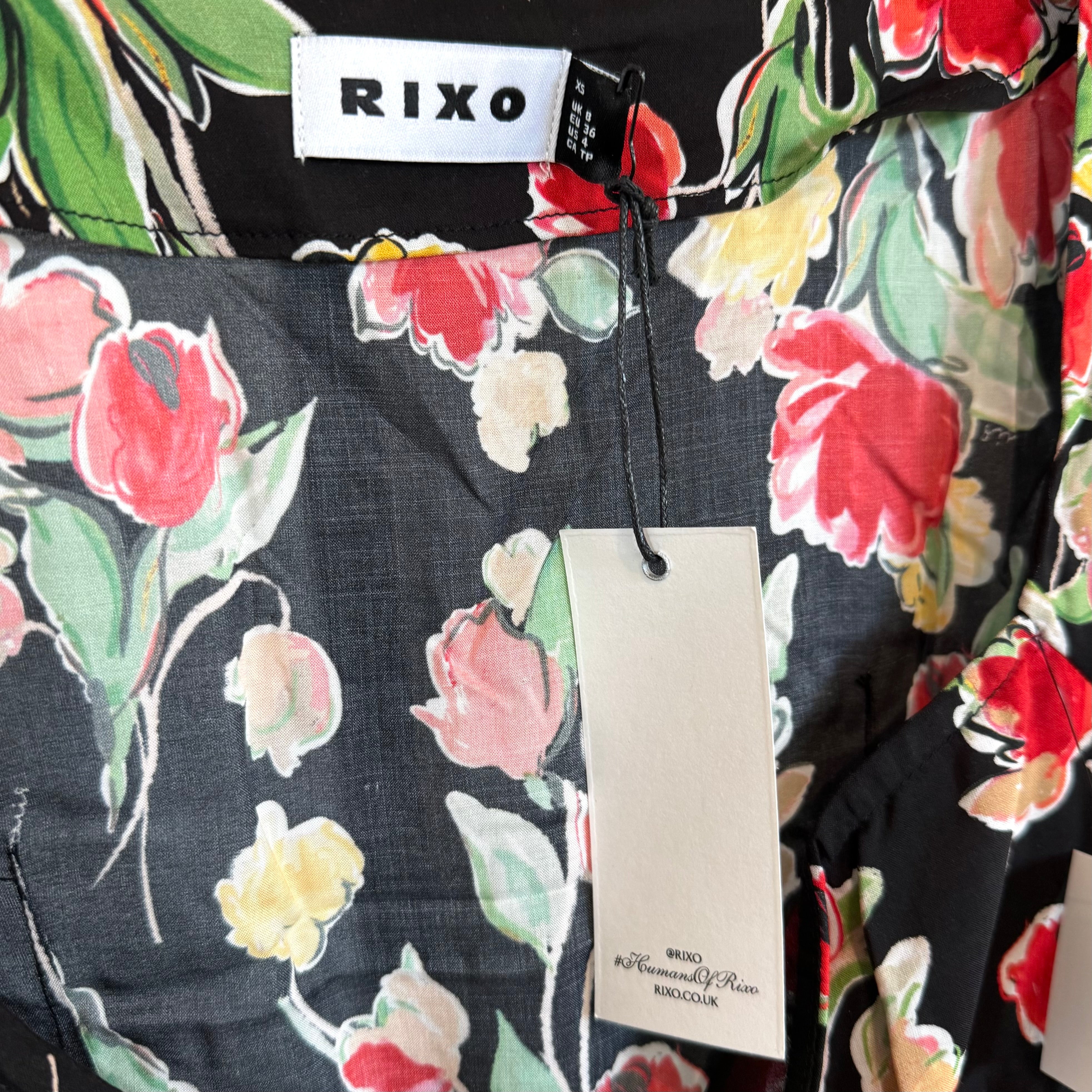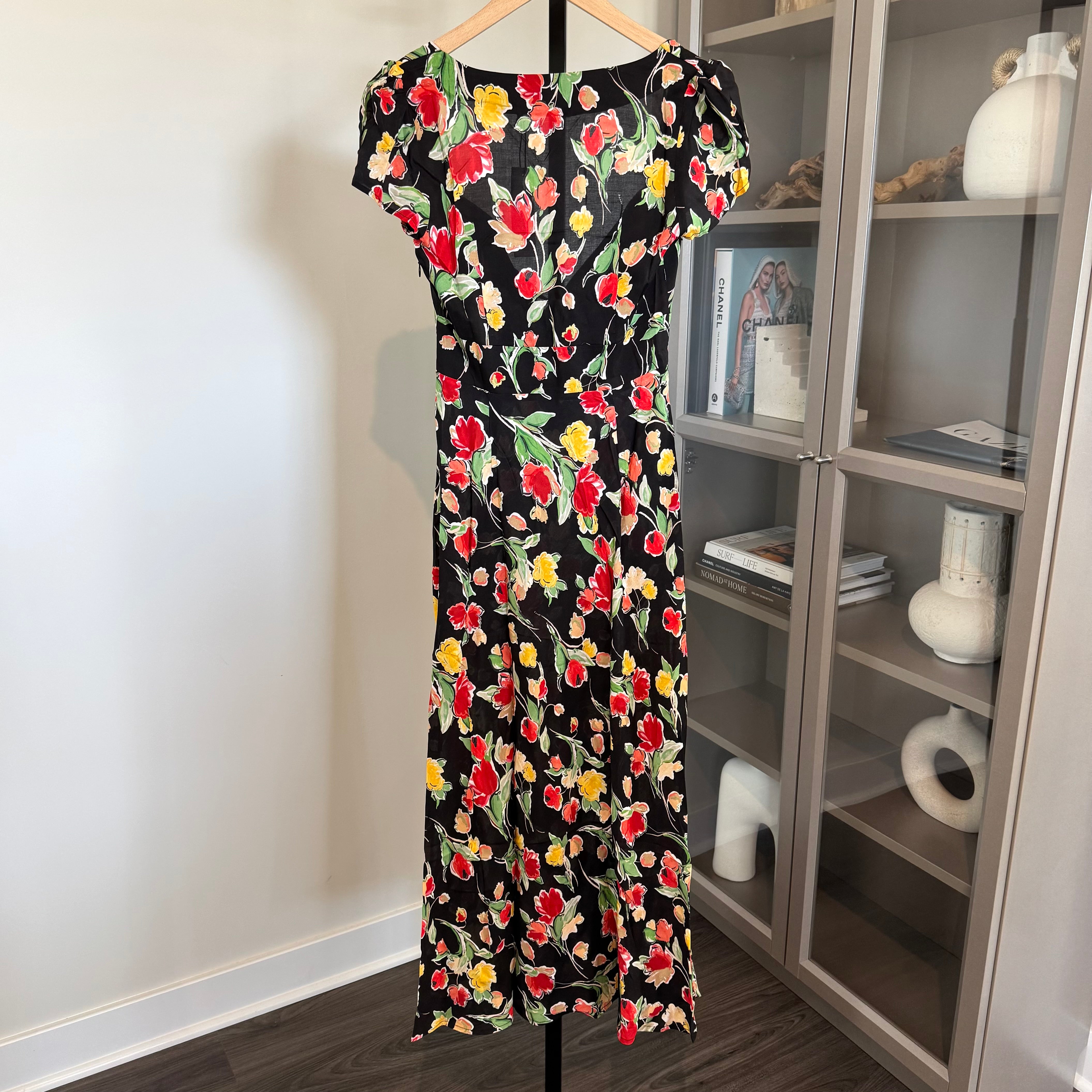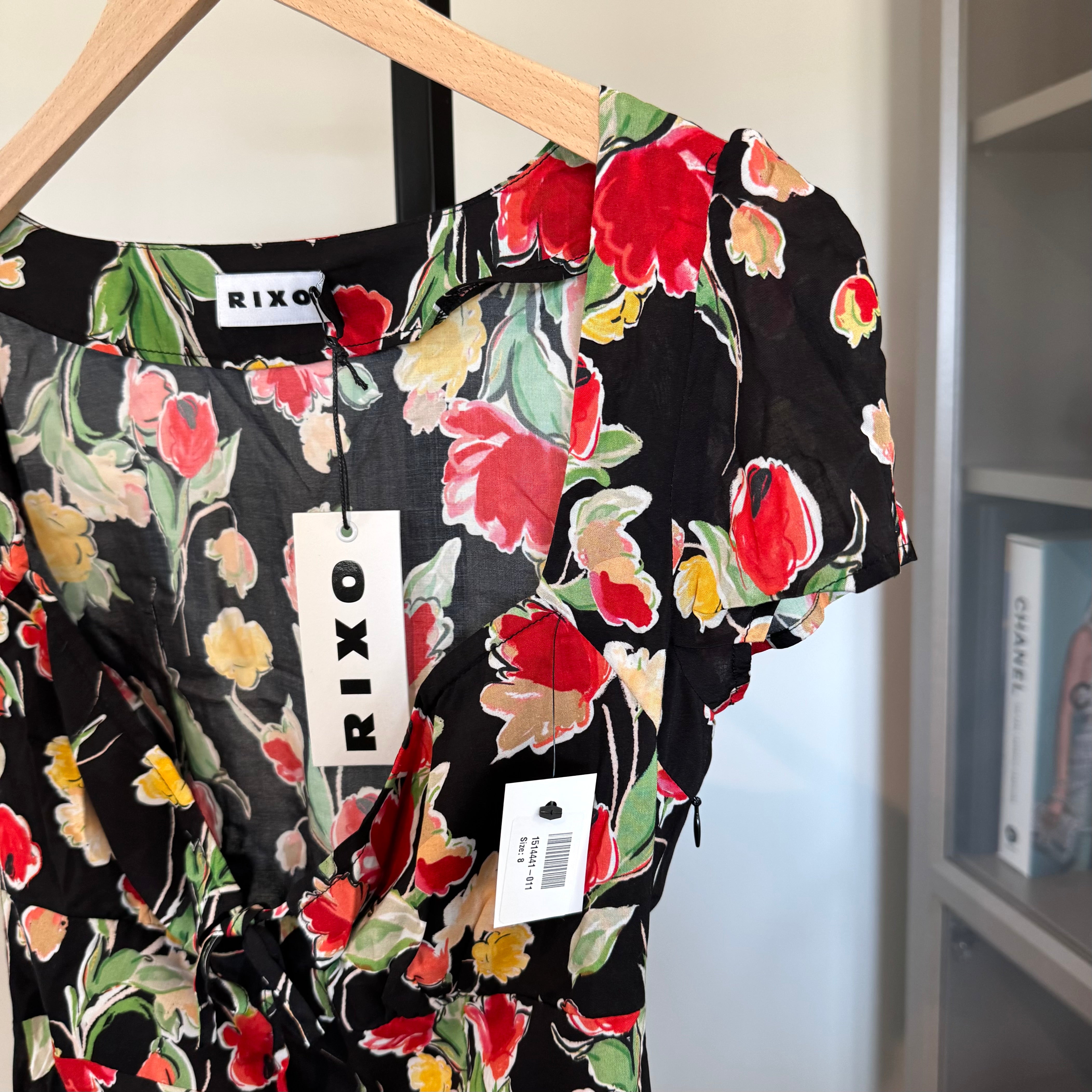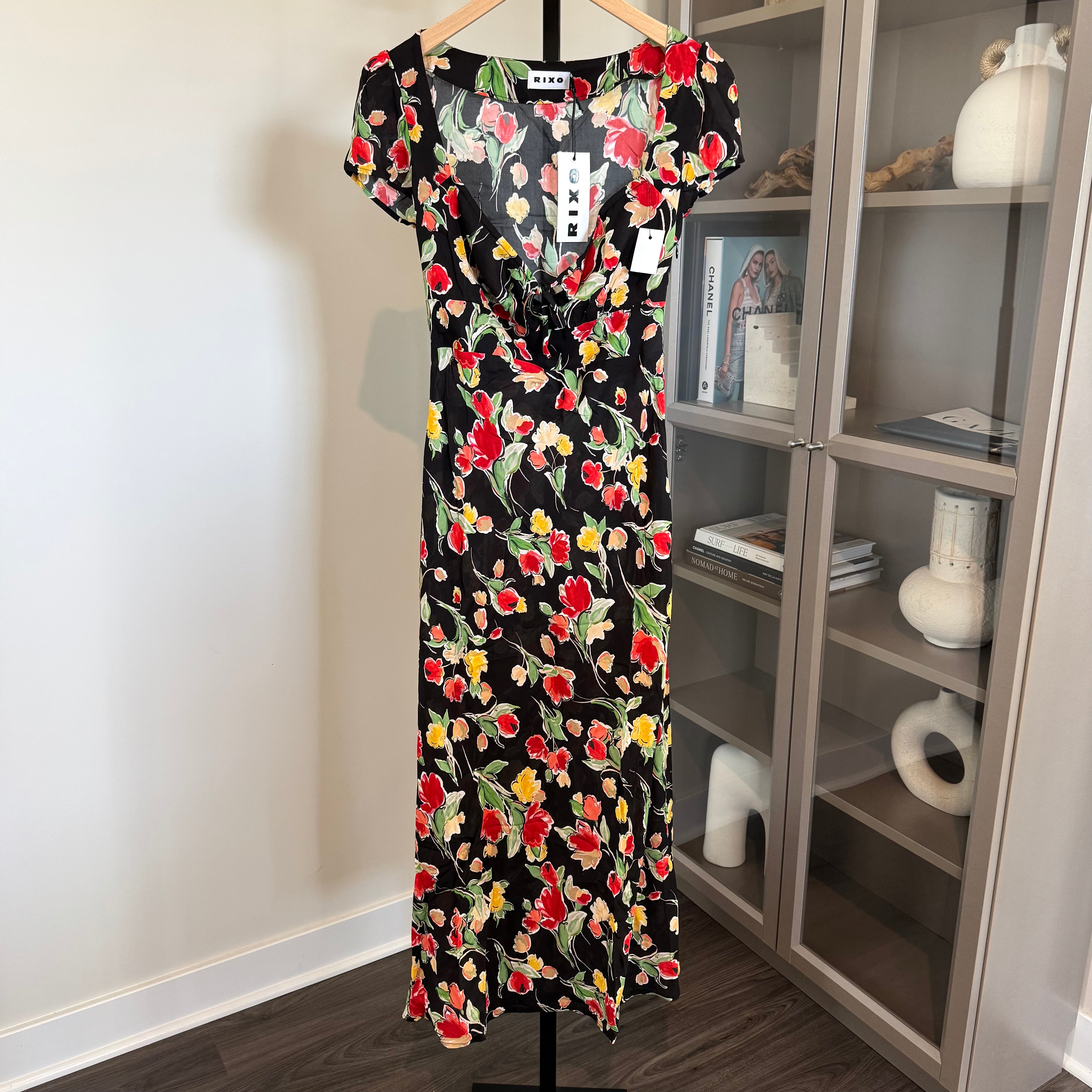 RIXO Marisa Black Multicolor Floral Tie Square Neckline Cap Sleeve Midi Dress